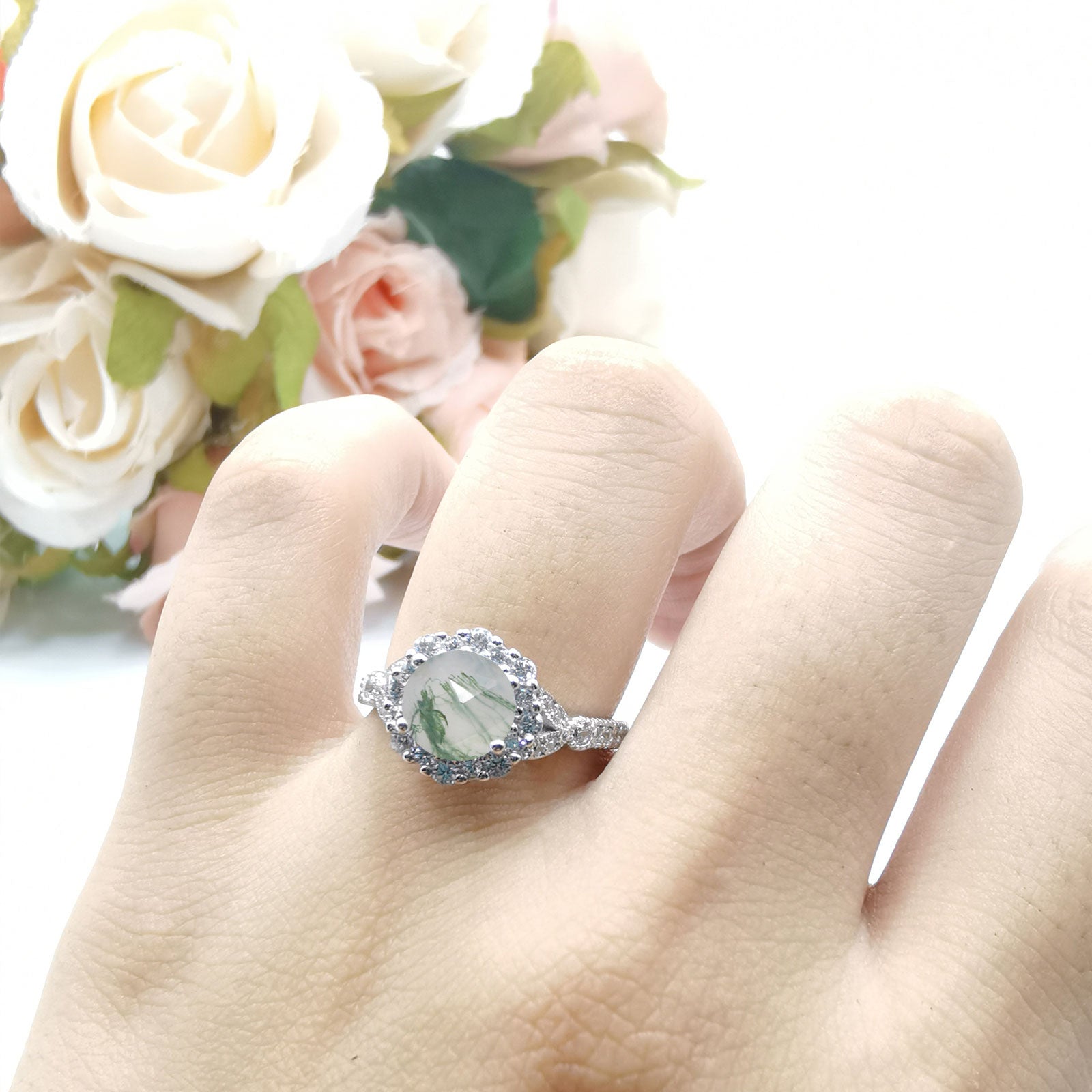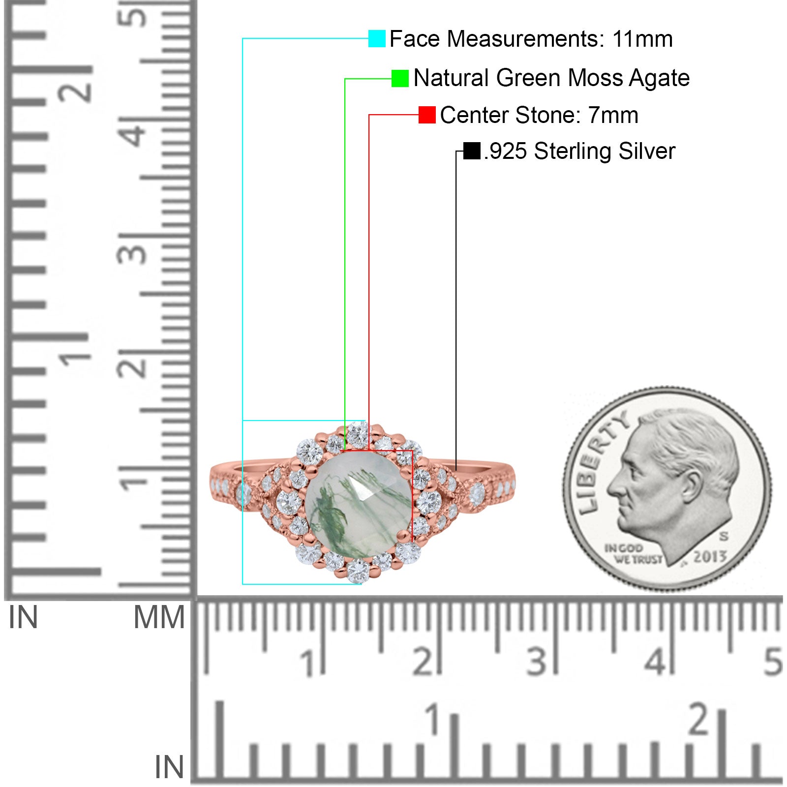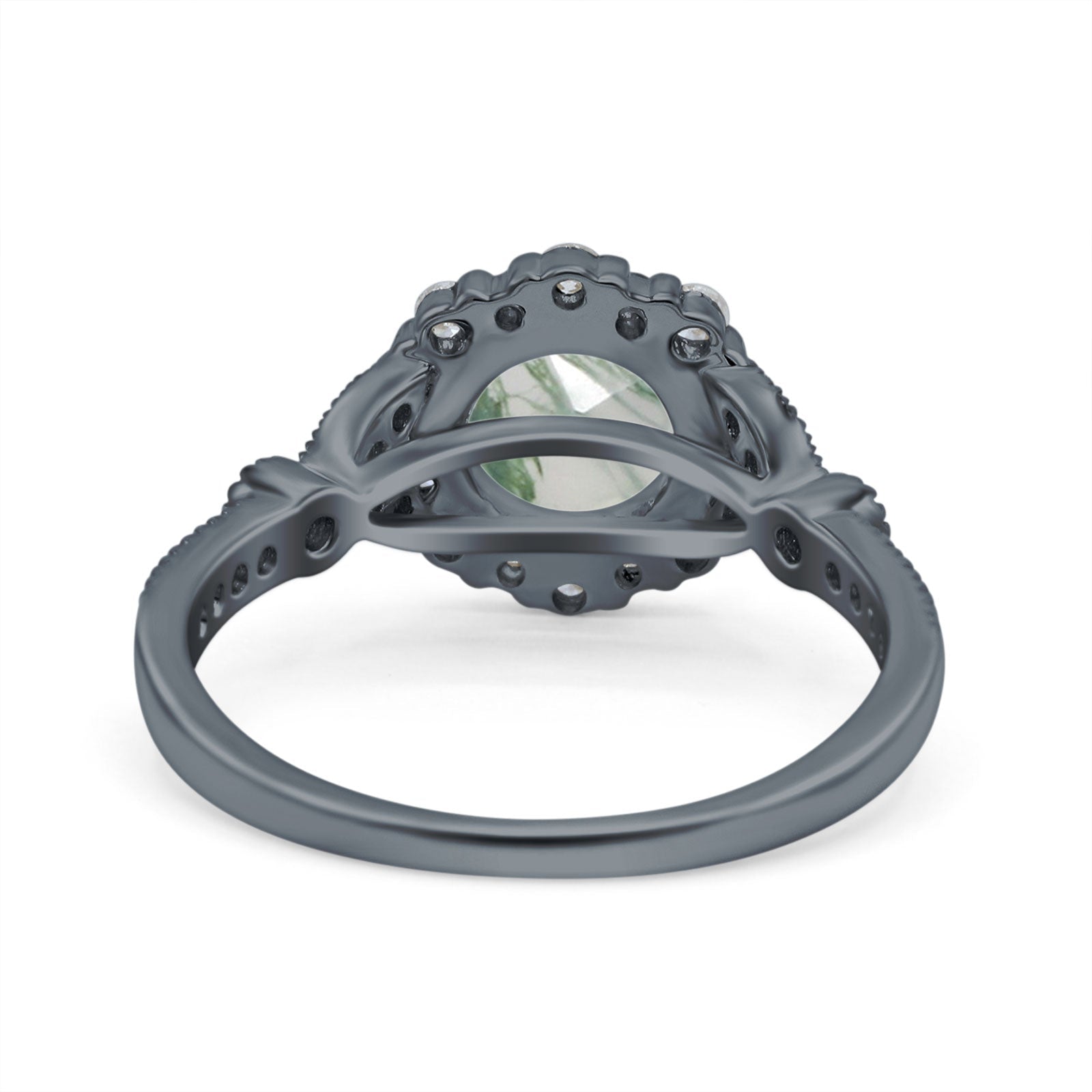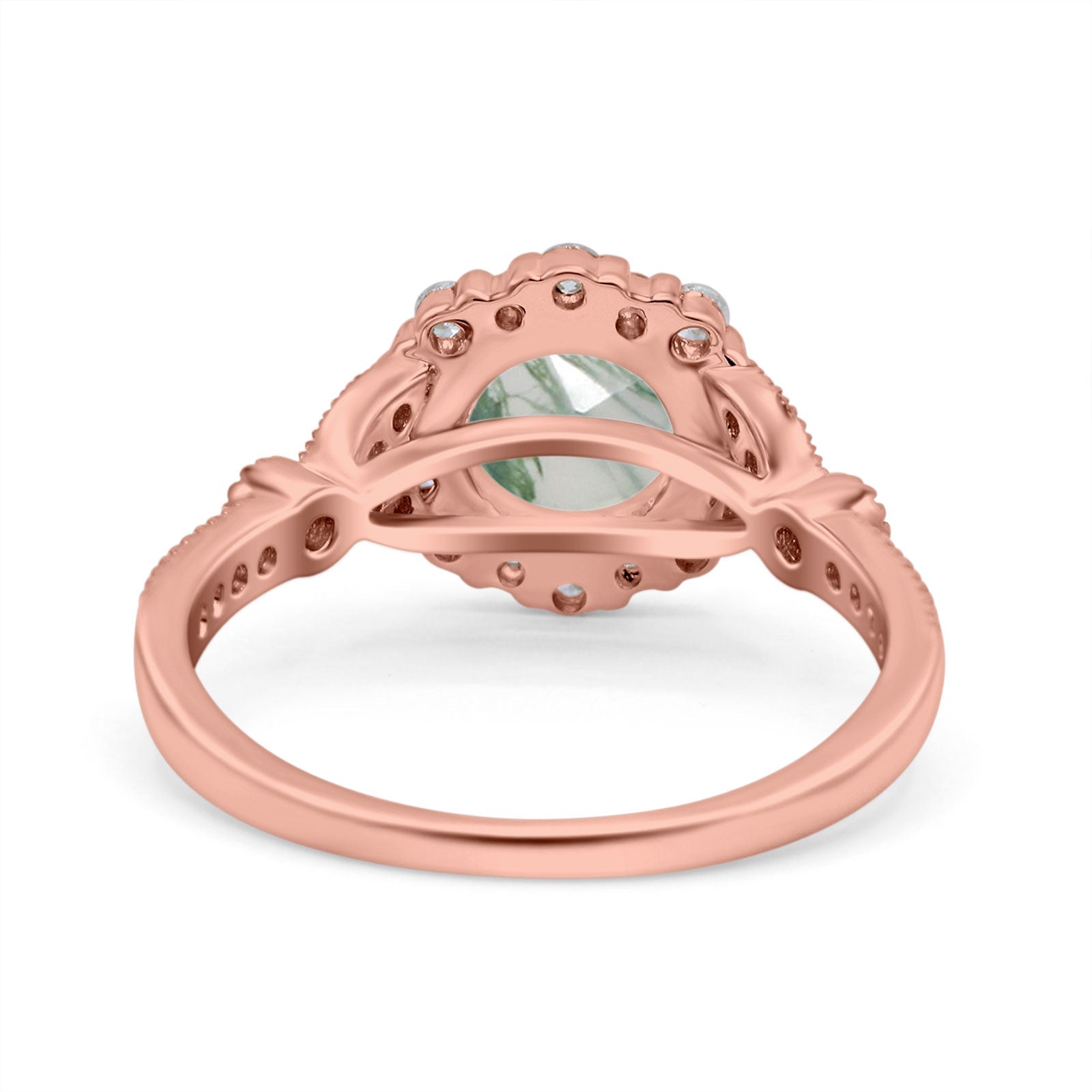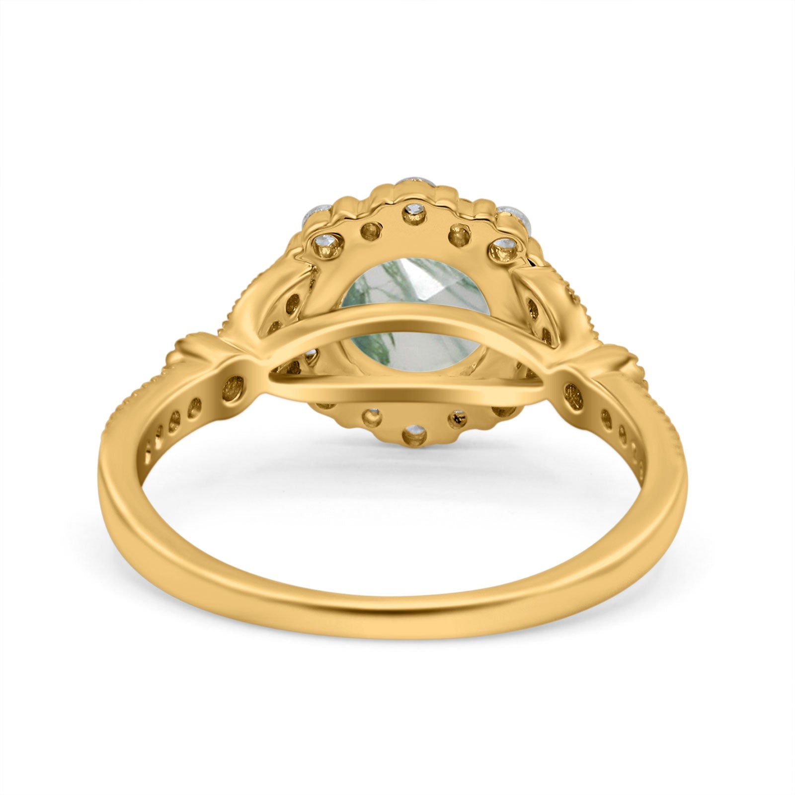 Art Deco Round Natural Green Moss Agate Halo Engagement Rings 925 Sterling Silver