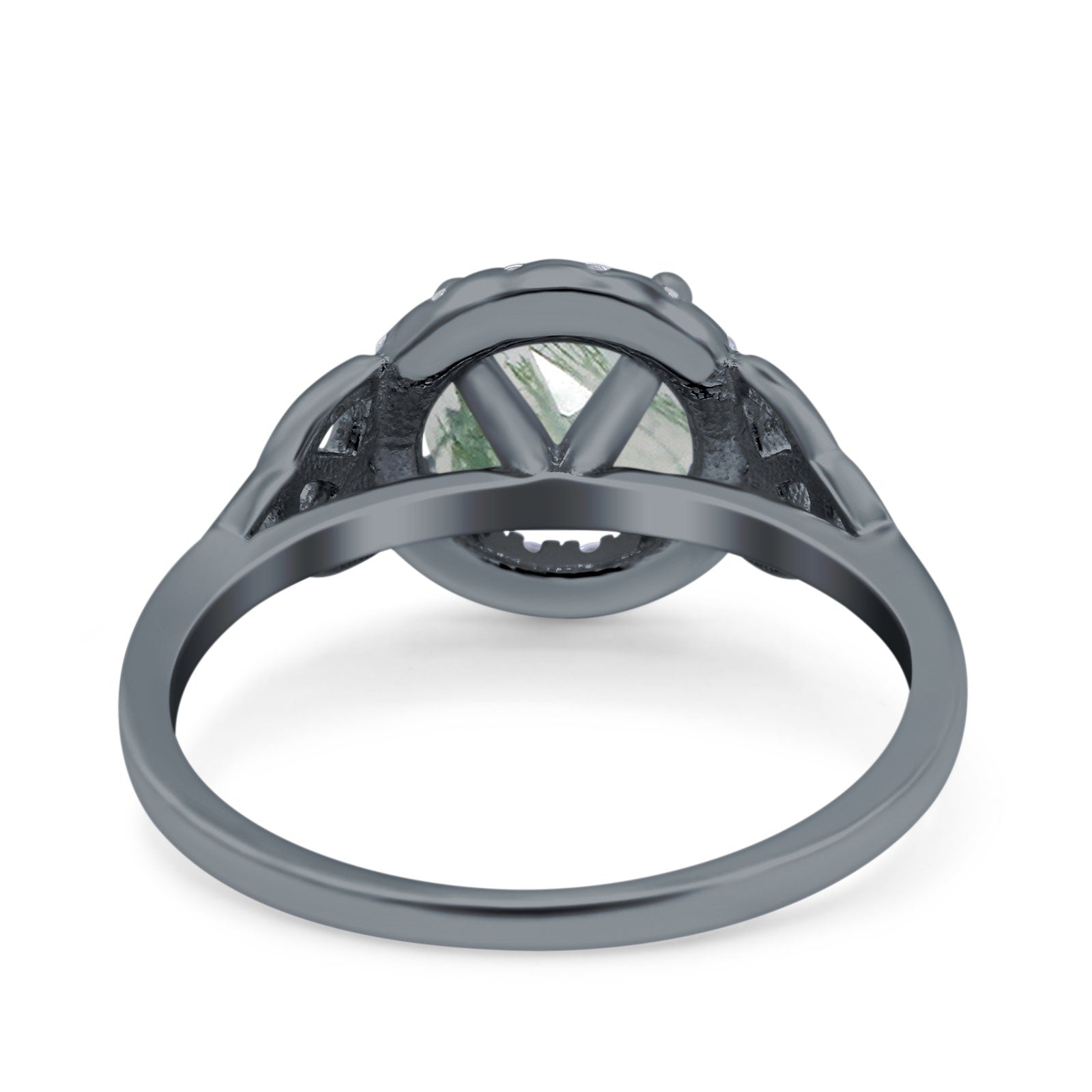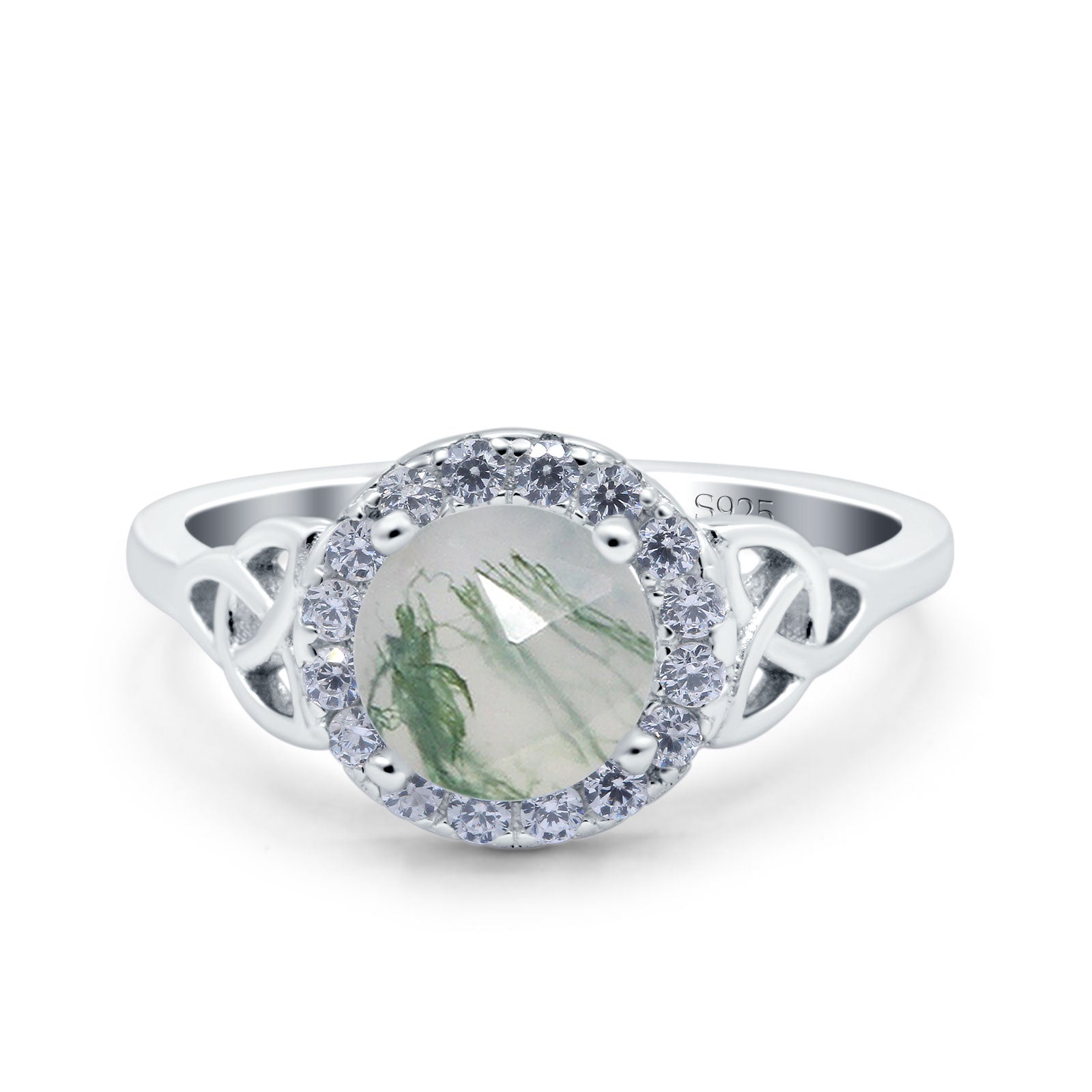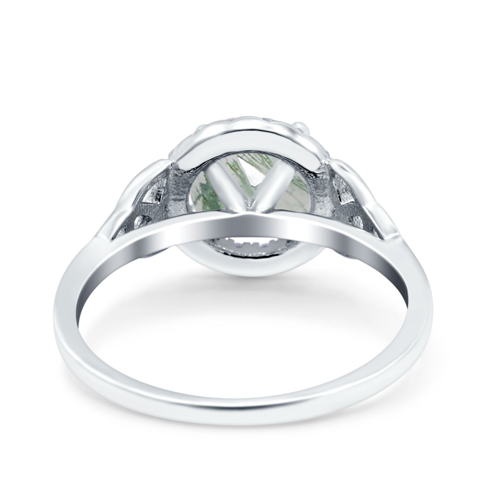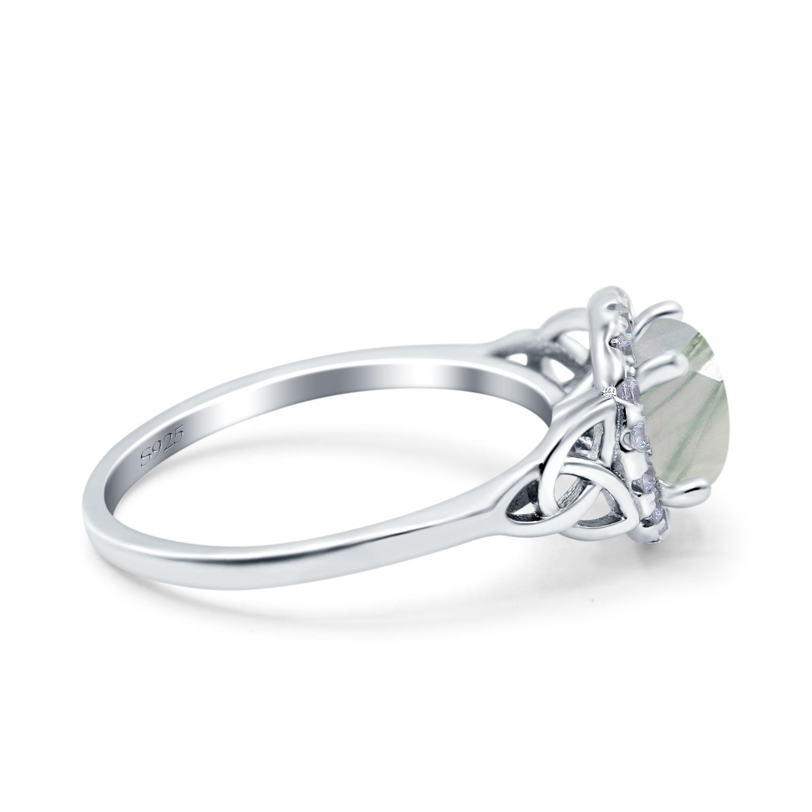 Art Deco Round Natural Green Moss Agate Trinity Ring 925 Sterling Silver