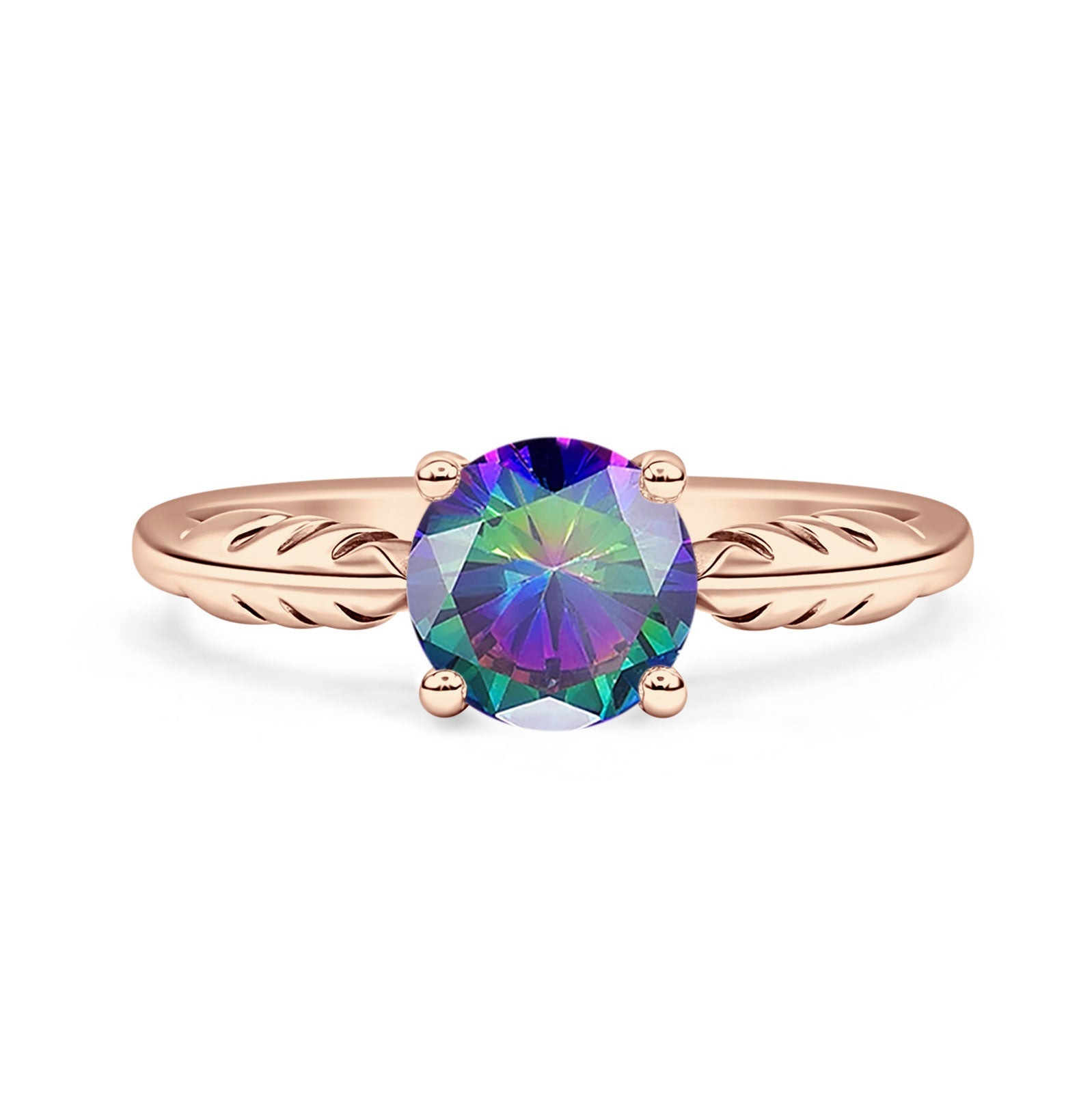 Ring Design: Round Rainbow CZ leaf Solitaire Ring.