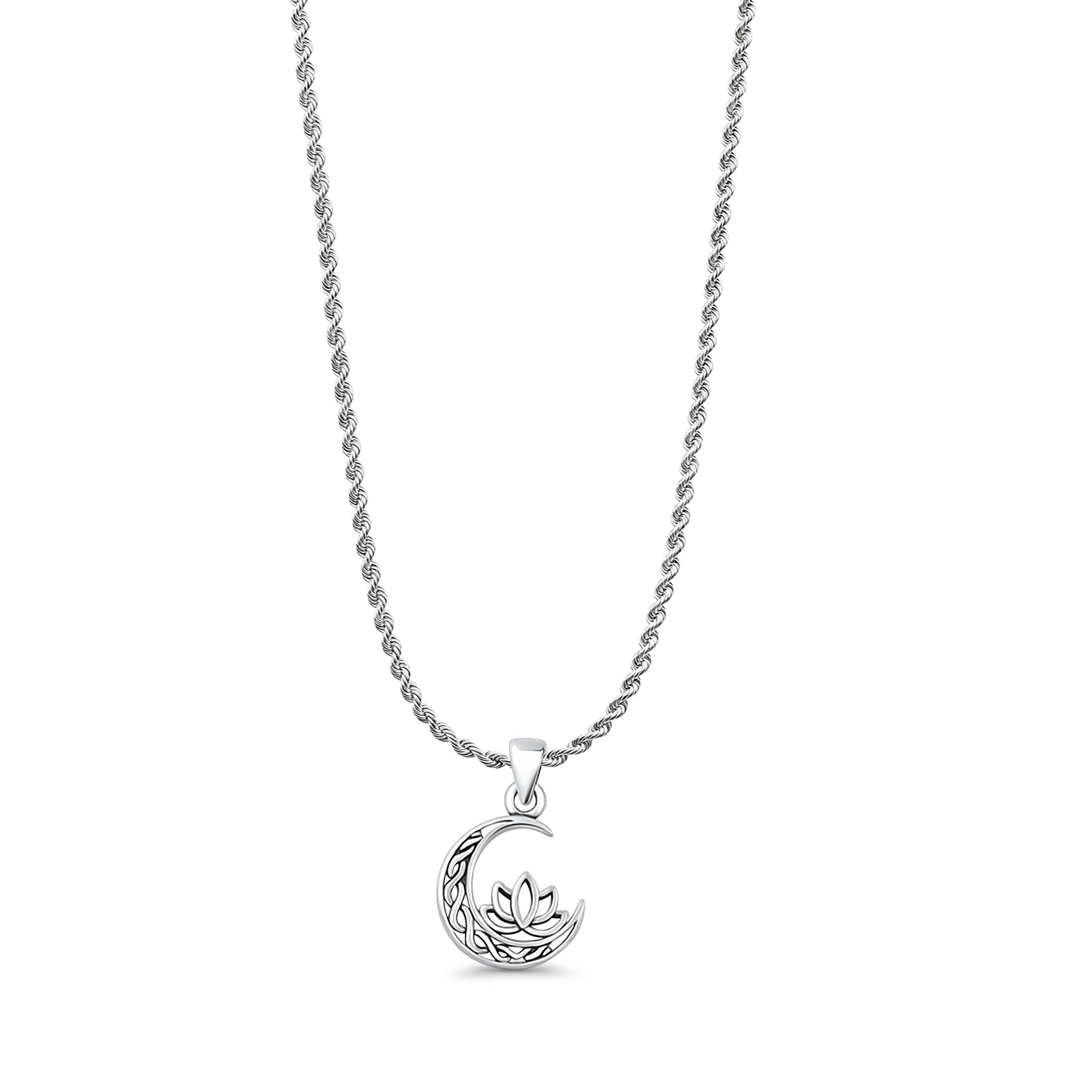 Moon & Lotus Pendant Rope Chain Necklace Oxidized 925 Sterling Silver