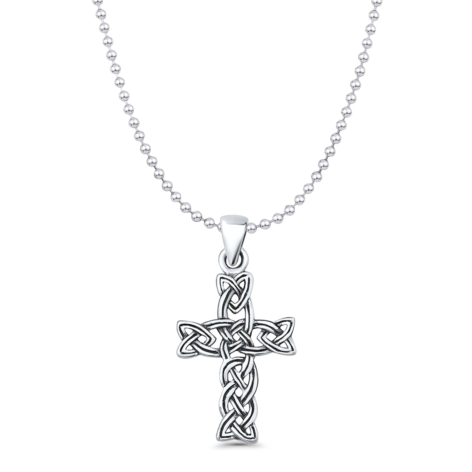 Celtic Cross Pendant Bead Chain Necklace Oxidized 925 Sterling Silver