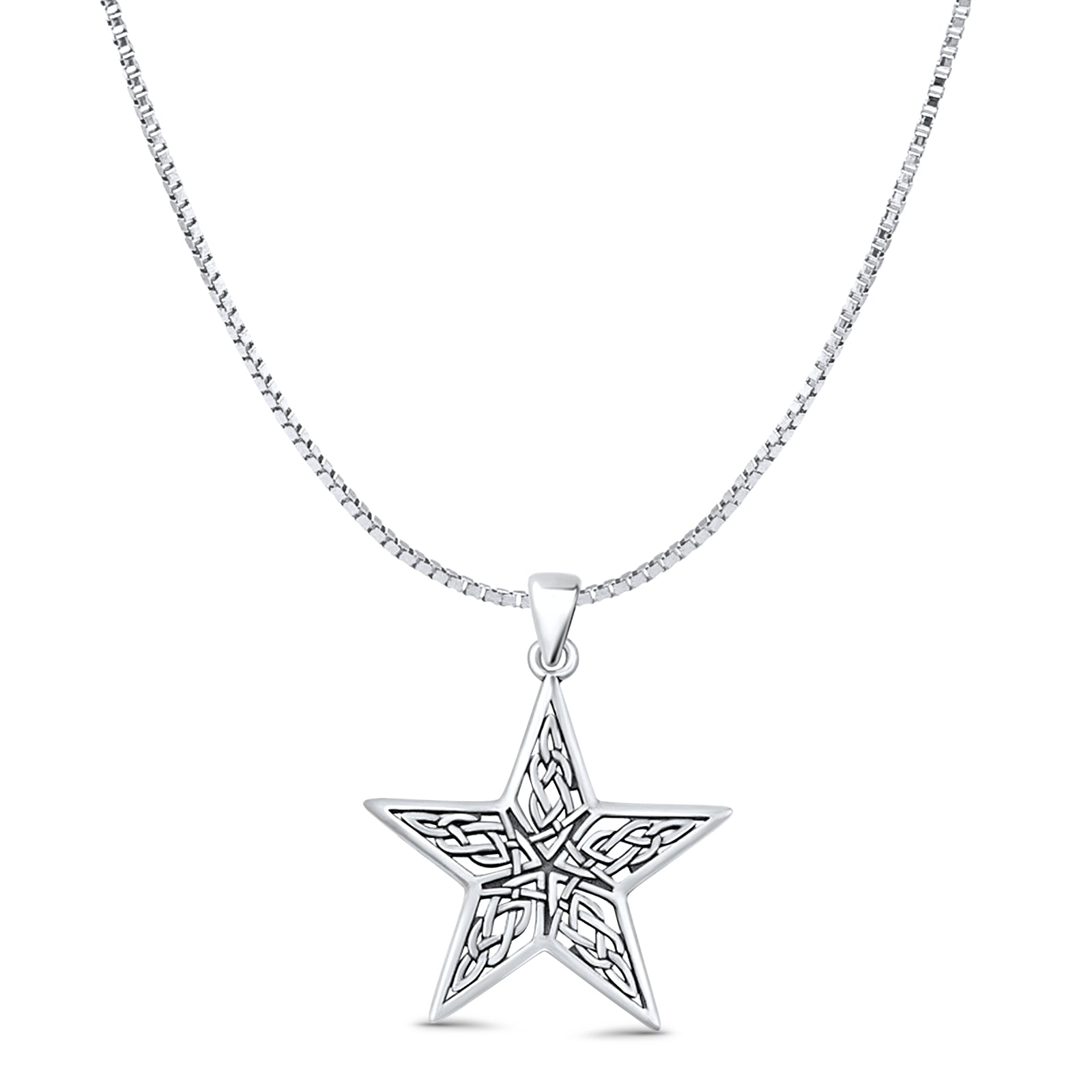 Celtic Style Star Pendant Box Chain Necklace Oxidized 925 Sterling Silver