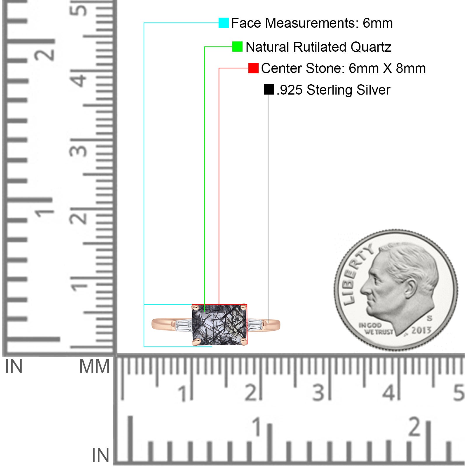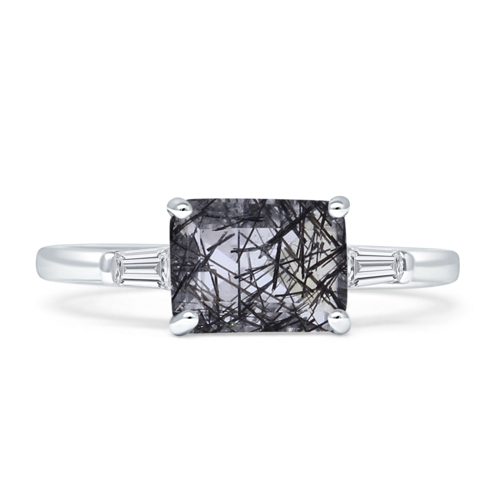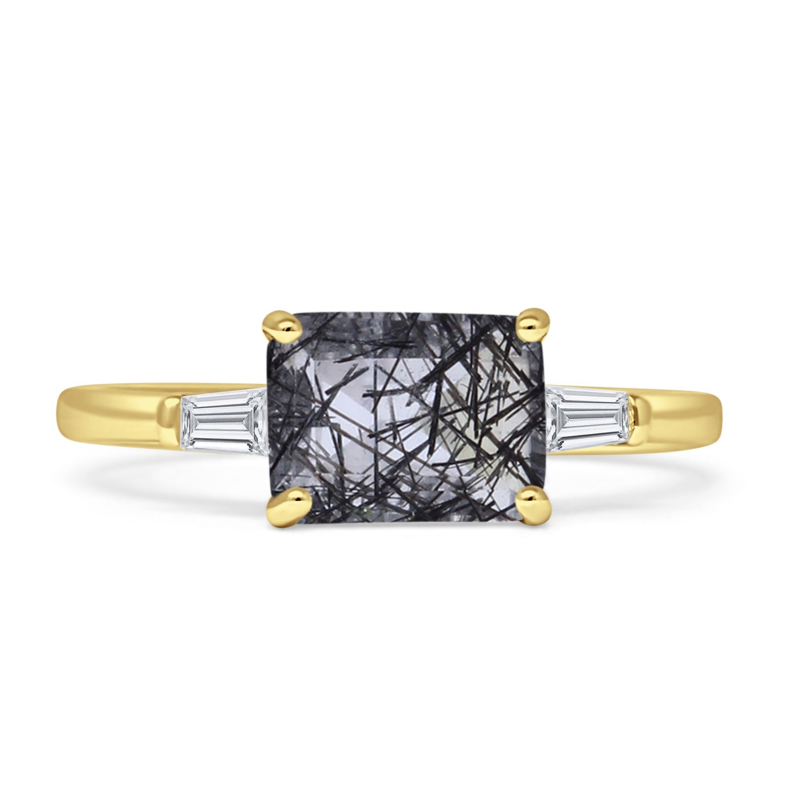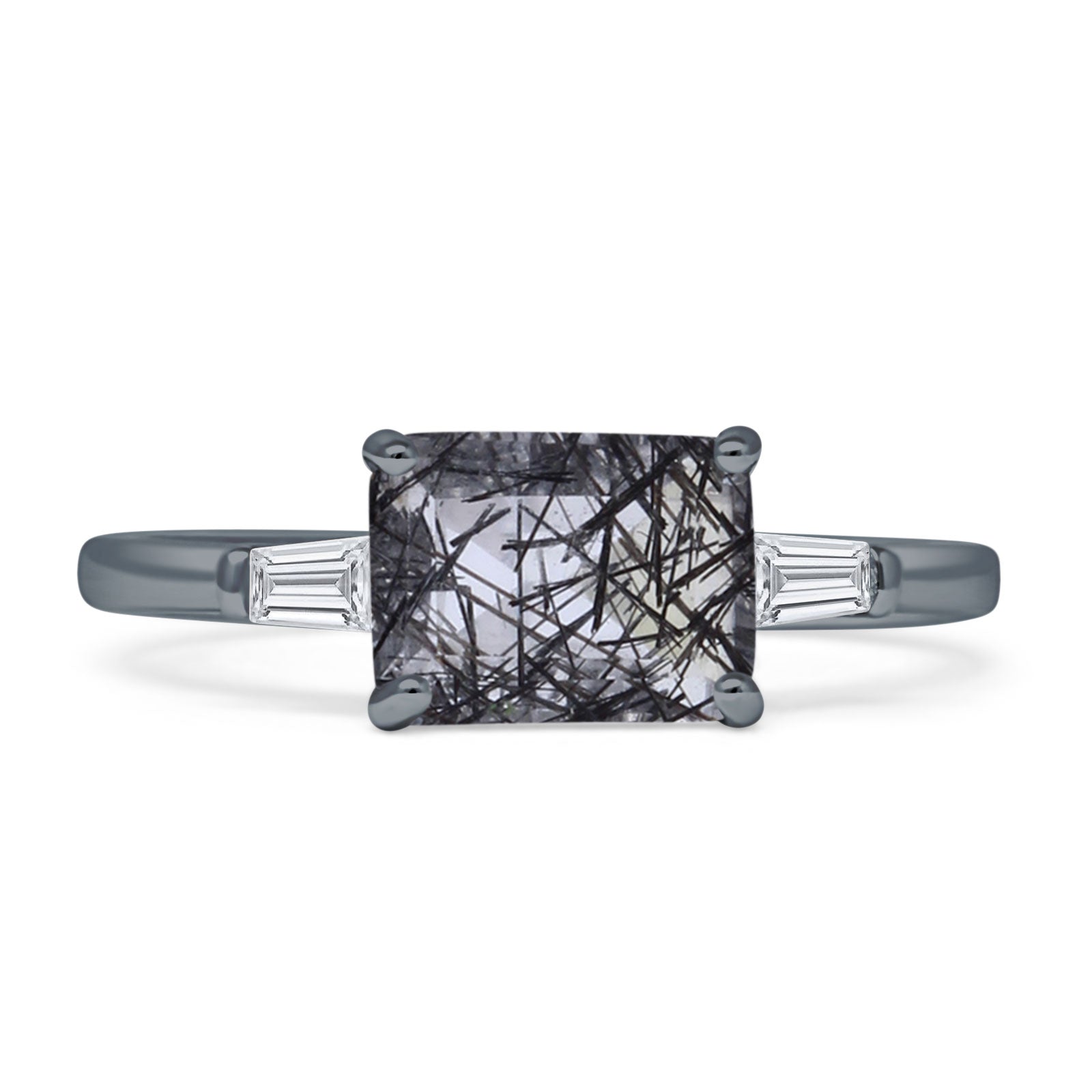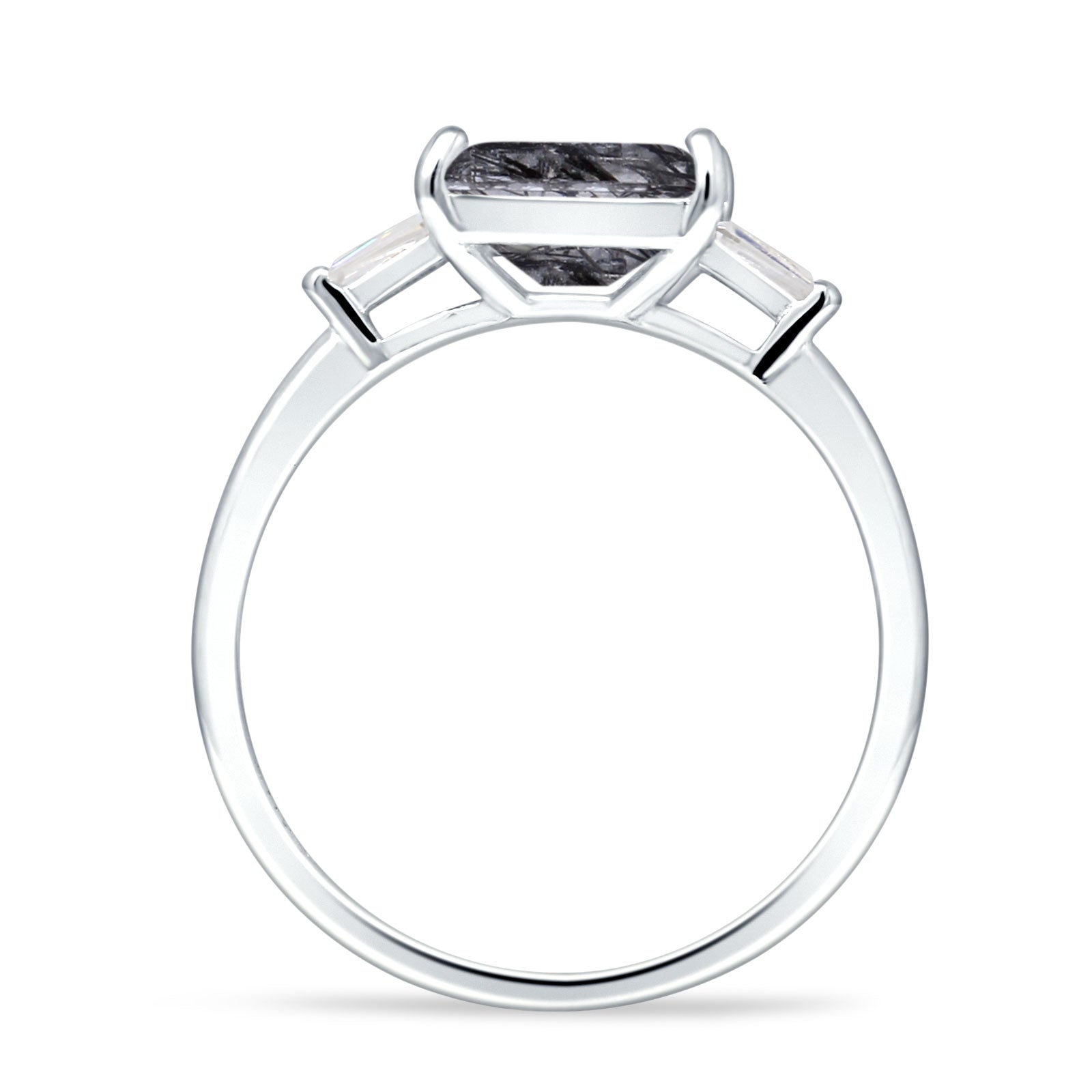 Emerald Cut Natural Rutilated Quartz Solitaire Trio Ring 925 Sterling Silver