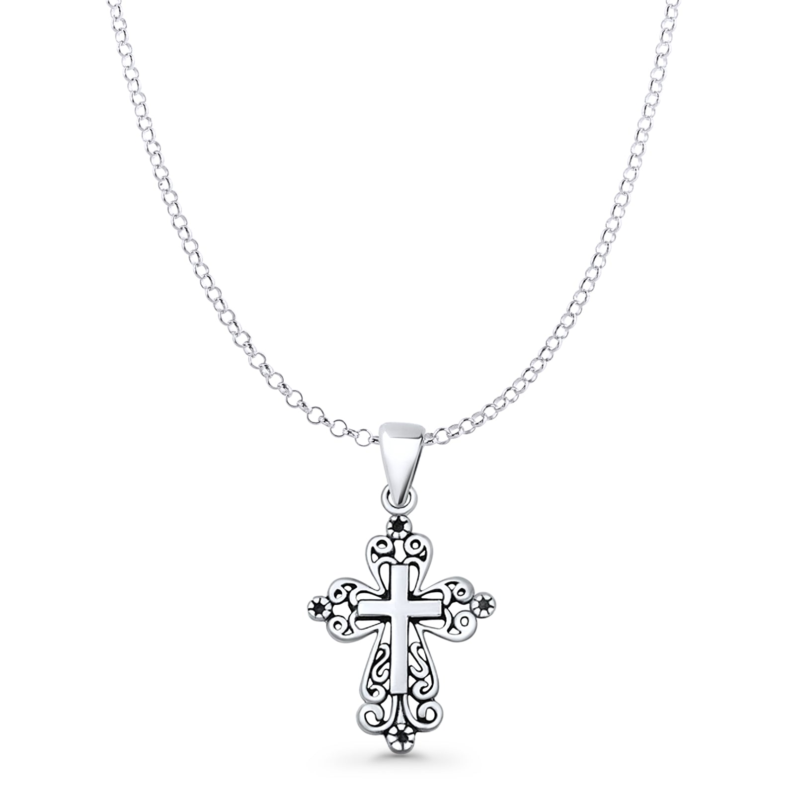 Filigree Cross Pendant Rolo Chain Necklace Oxidized 925 Sterling Silver