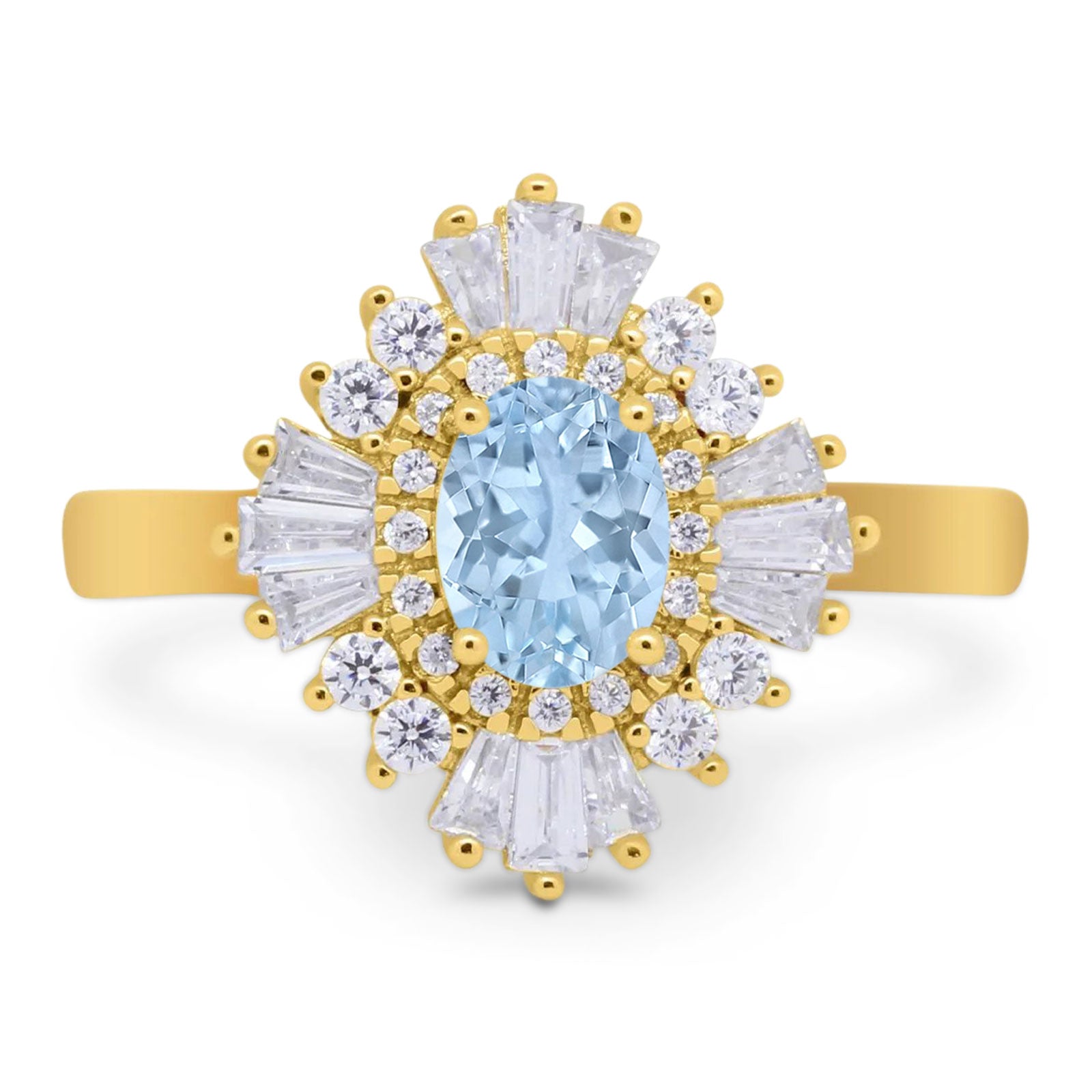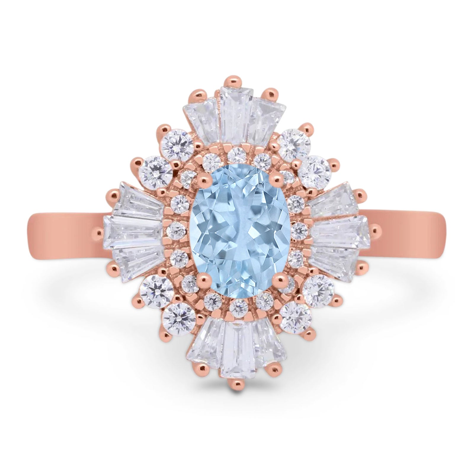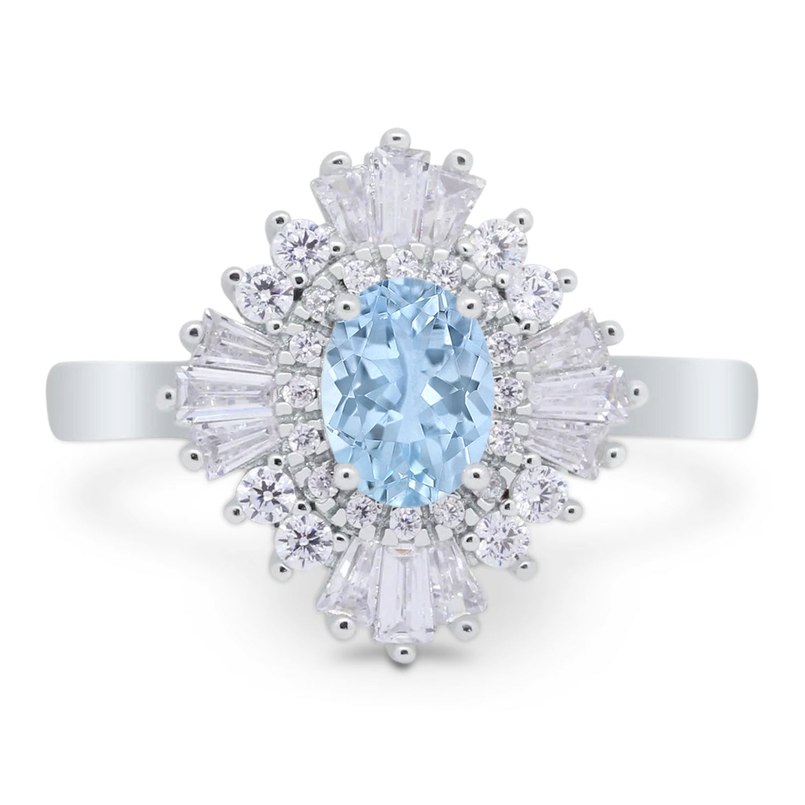 Floral Art Deco Ring Oval Natural Aquamarine Tapered Baguette 925 Sterling Silver
