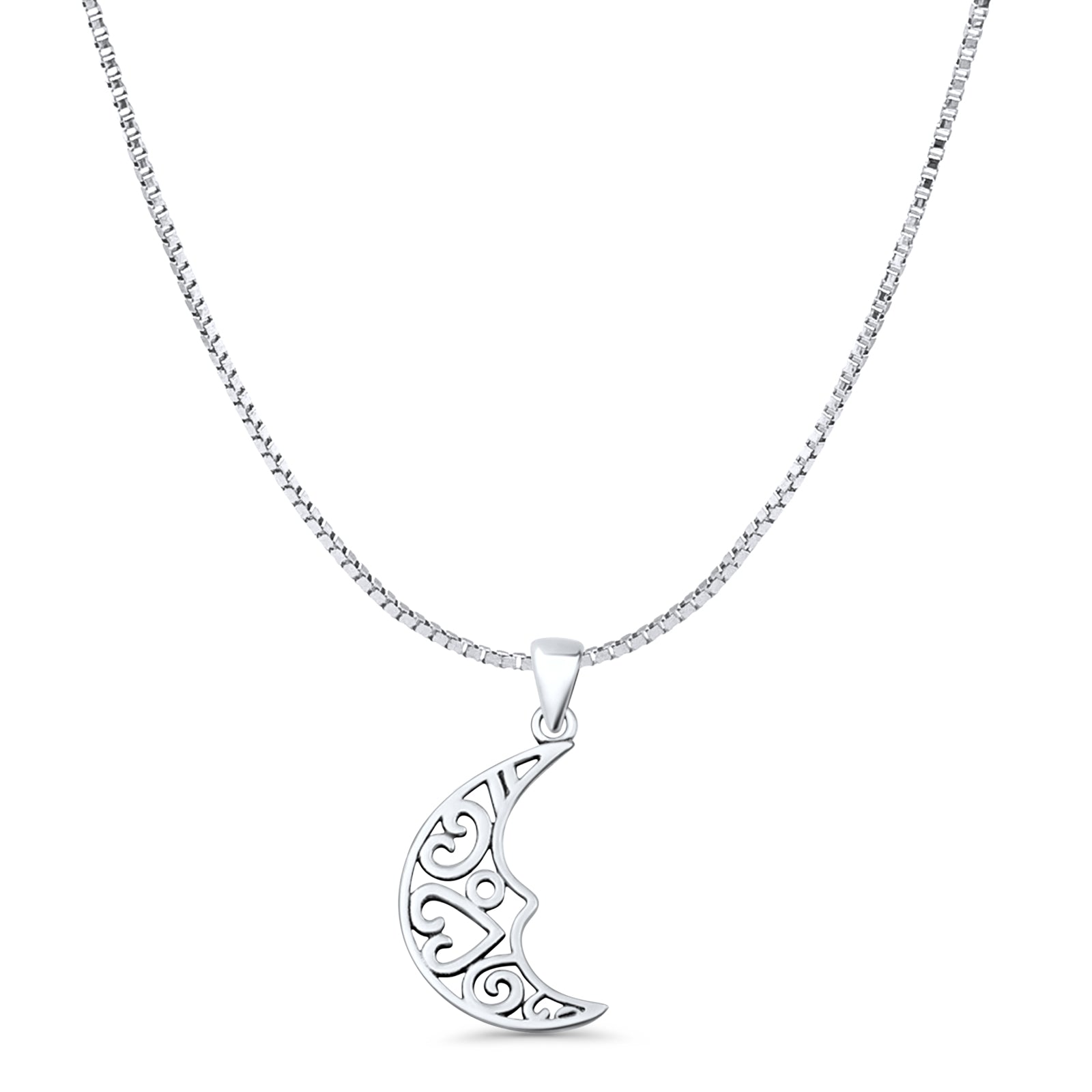Hearts & Moon Pendant Box Chain Necklace Oxidized 925 Sterling Silver