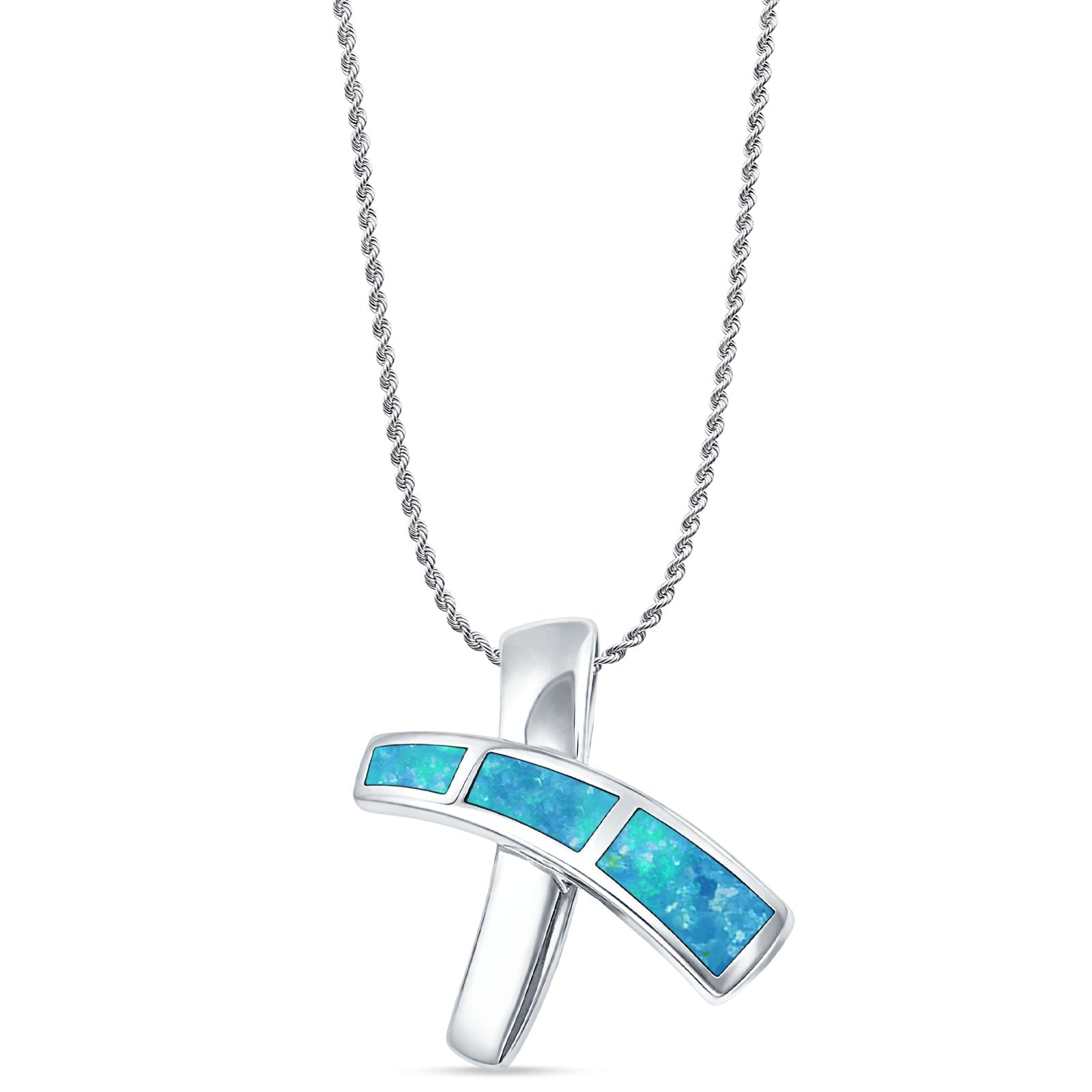 Lab Created Blue Opal Cross Pendant Rope Chain Necklace 925 Sterling Silver