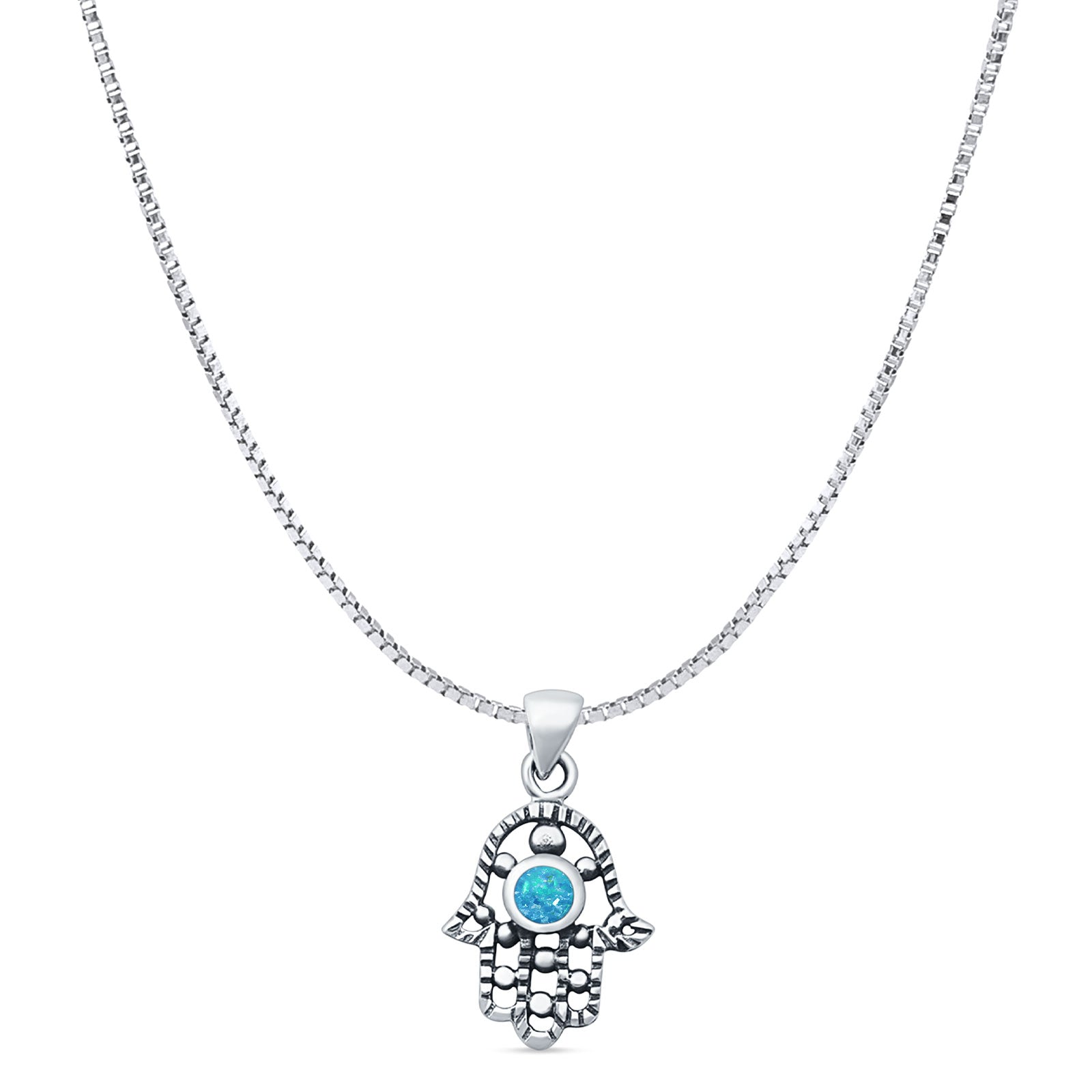 Lab Created Blue Opal Hand Of Hamsa Pendant Box Chain Necklace Oxidized 925 Sterling Silver