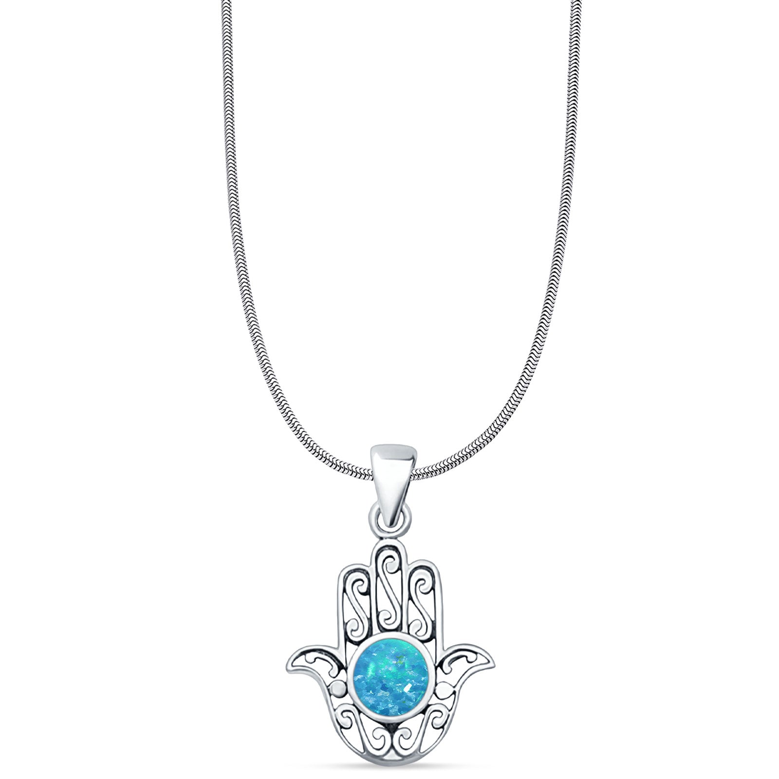 Lab Created Blue Opal Hand Of Hamsa Pendant Snake Chain Necklace Oxidized 925 Sterling Silver