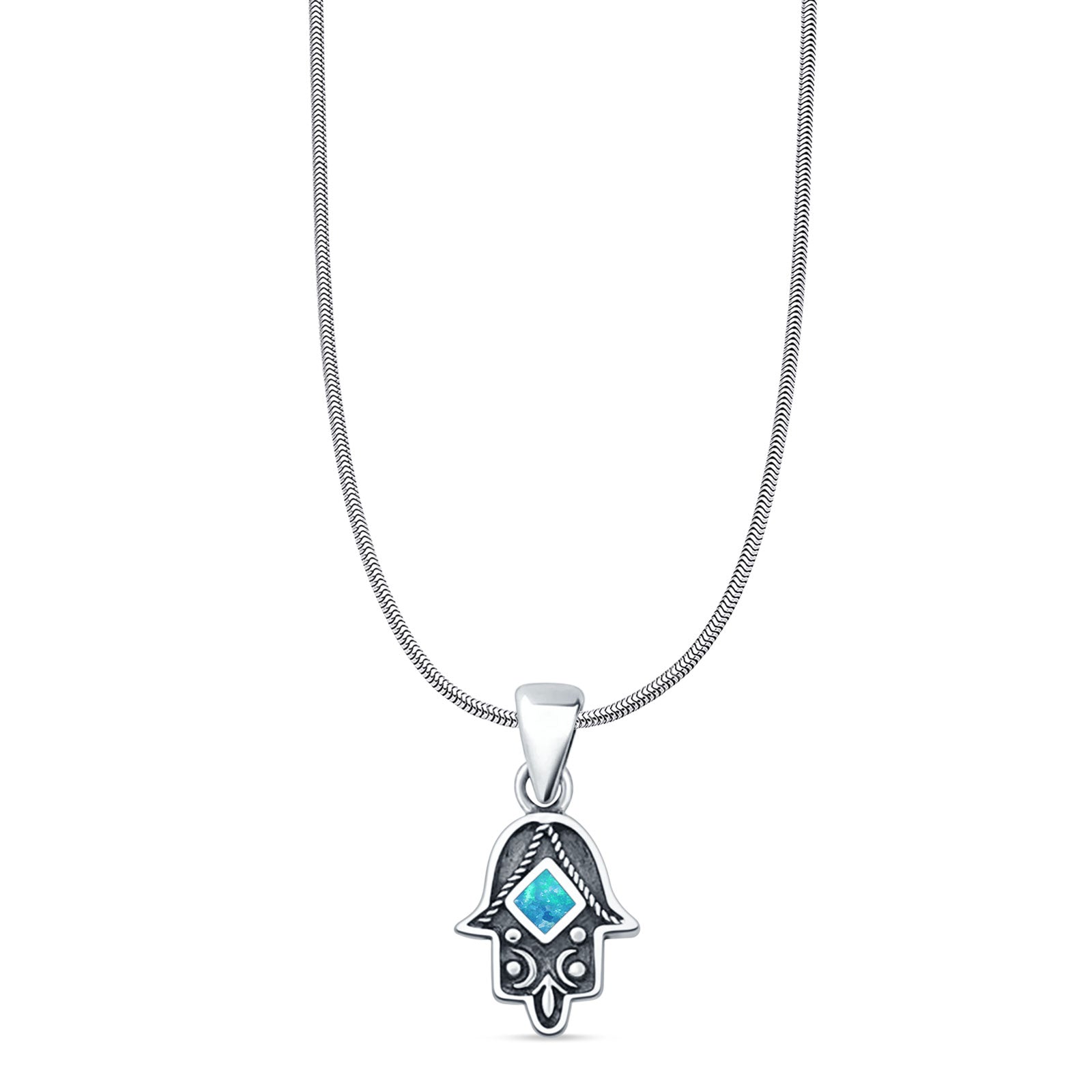 Lab Created Blue Opal Hand Of Hamsa Pendant Snake Chain Necklace Oxidized 925 Sterling Silver