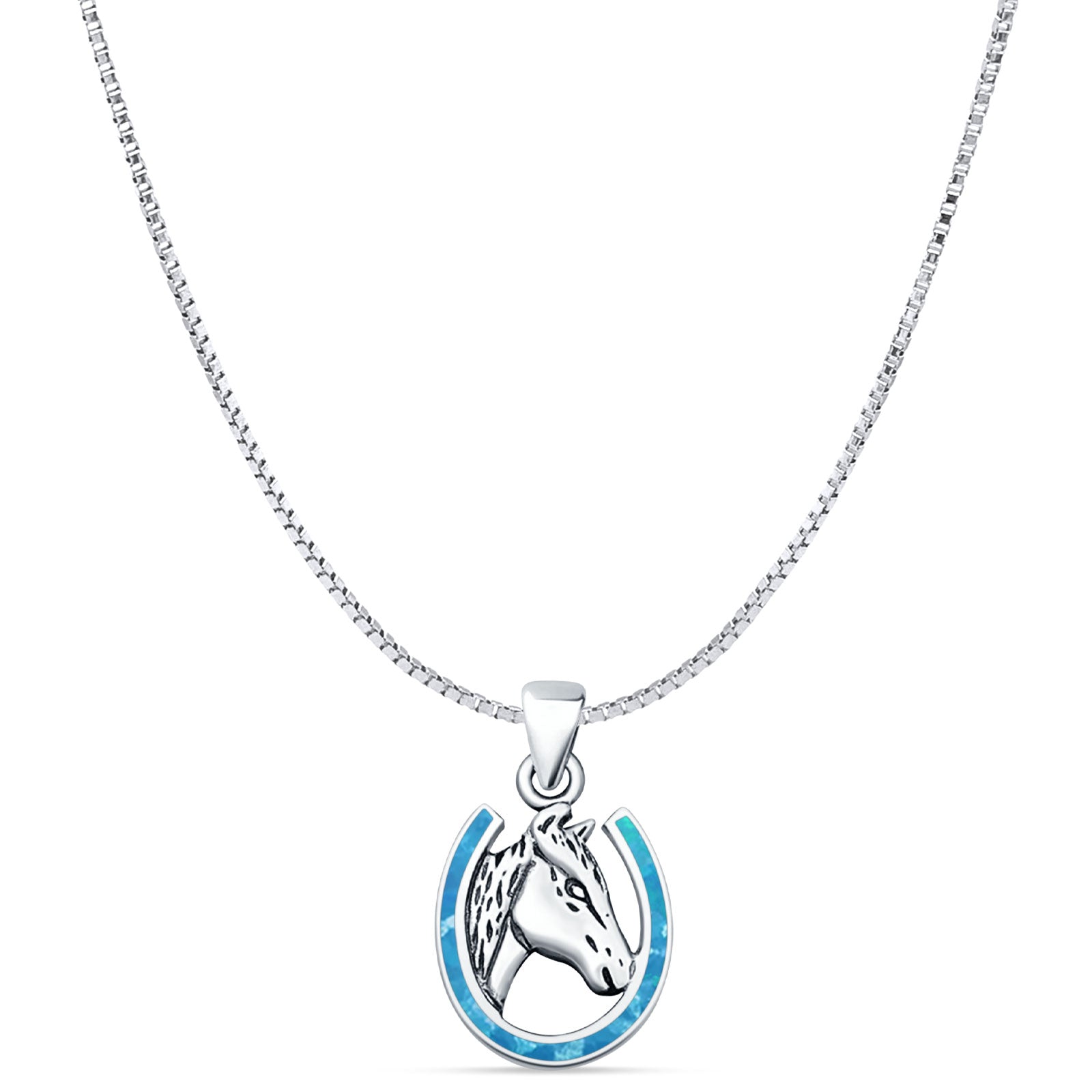 Lab Created Blue Opal Horse & Horseshoe Pendant Box Chain Necklace Oxidized 925 Sterling Silver