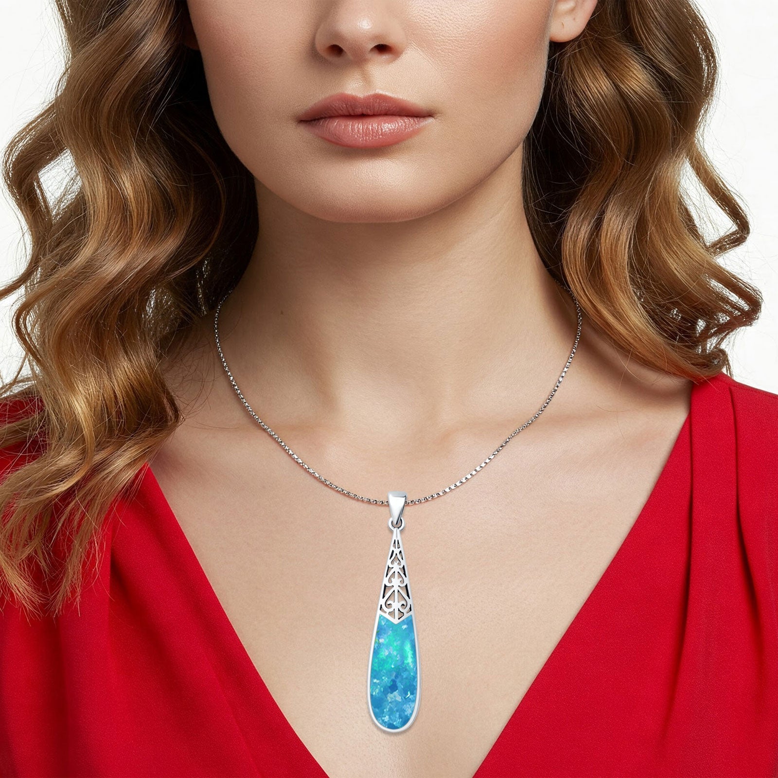 Style: Oxidized Lab Created Blue Opal Pear Dangle Drop Pendant Necklace