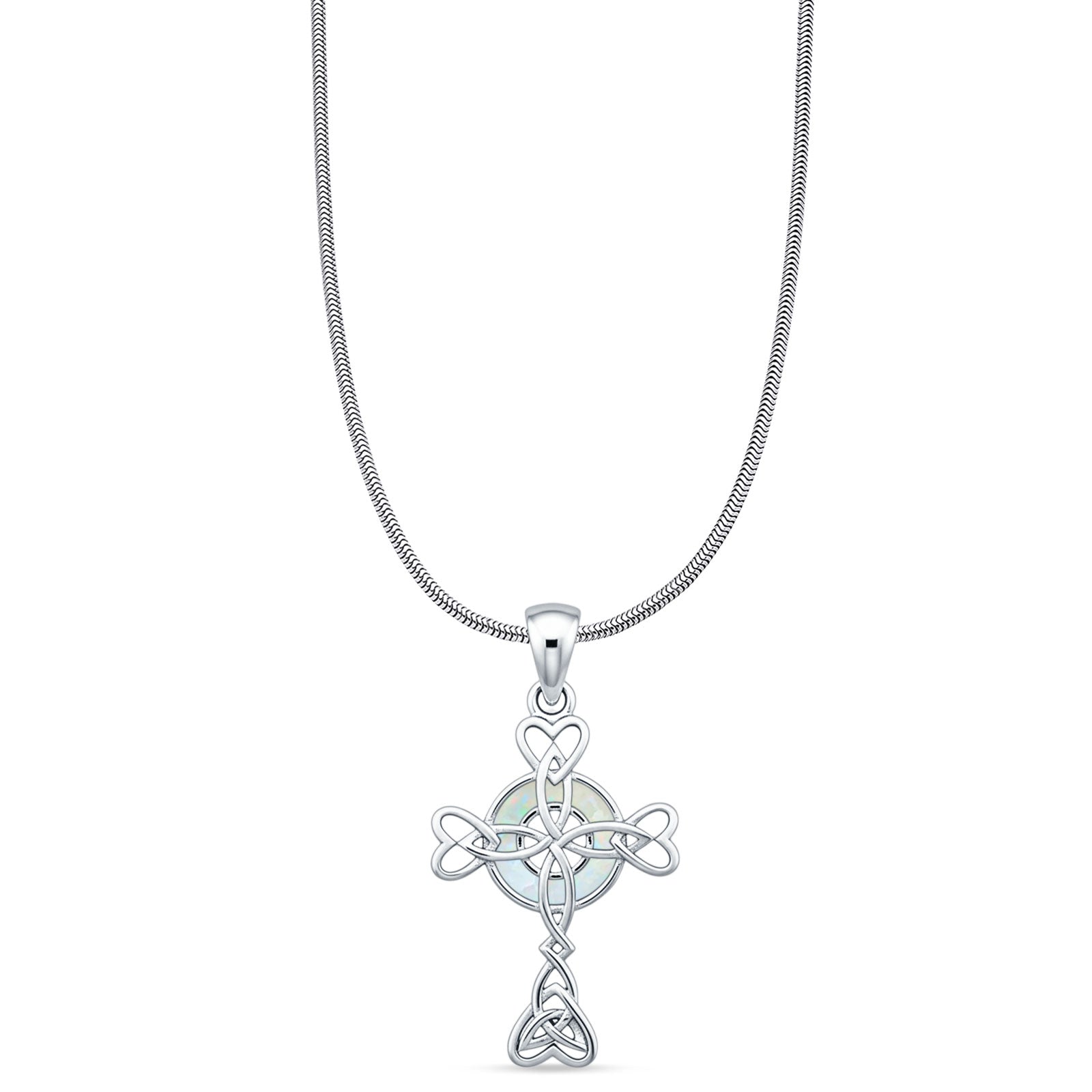 Lab Created White Opal Celtic Cross Pendant Snake Chain Necklace 925 Sterling Silver
