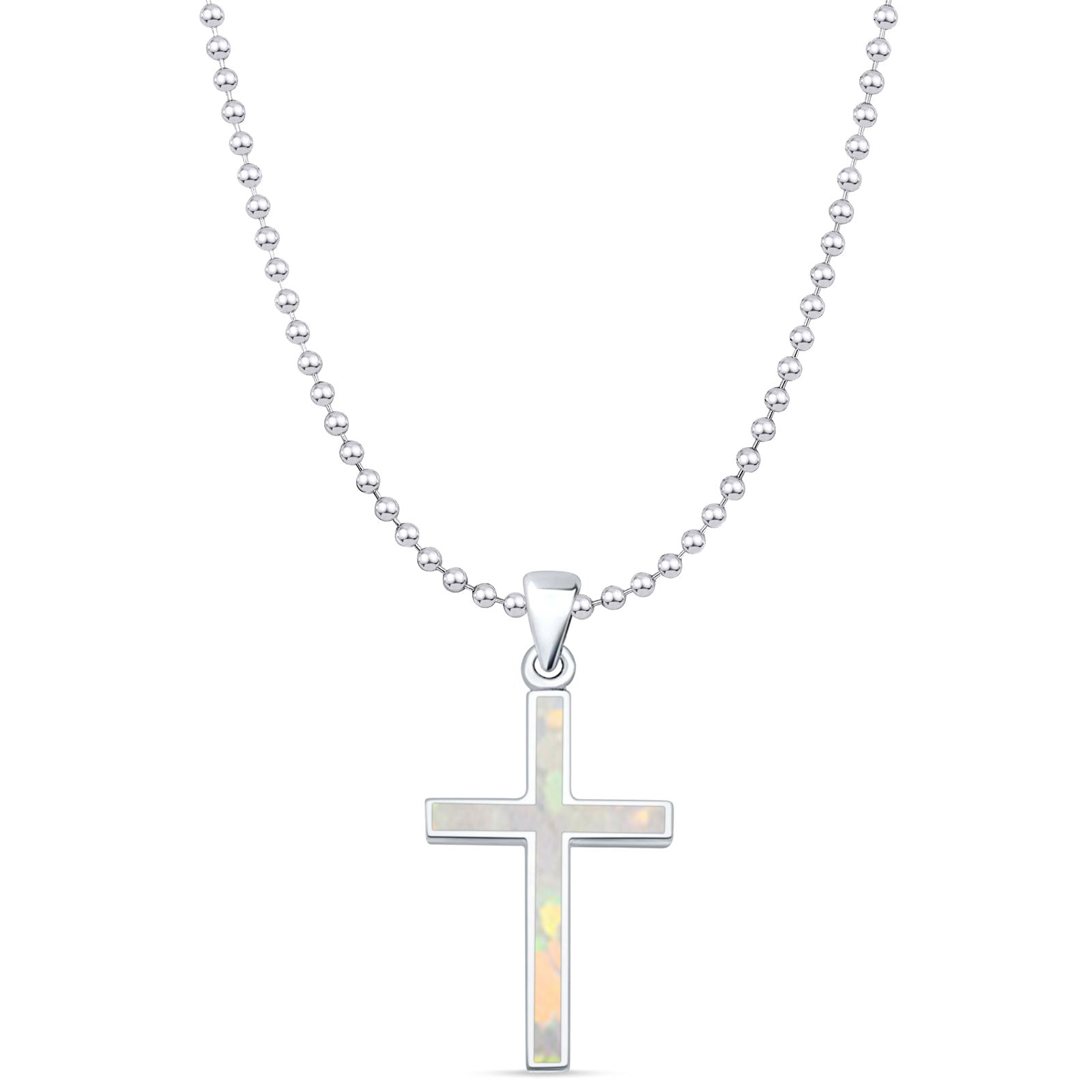 Lab Created White Opal Cross Pendant Bead Chain Necklace 925 Sterling Silver