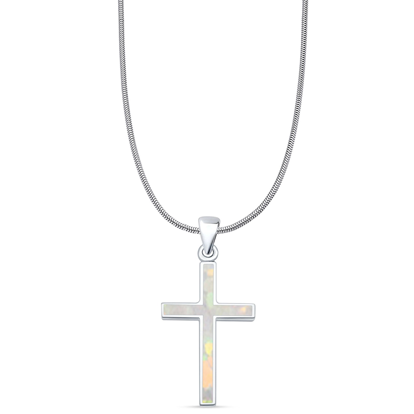 Lab Created White Opal Cross Pendant Snake Chain Necklace 925 Sterling Silver