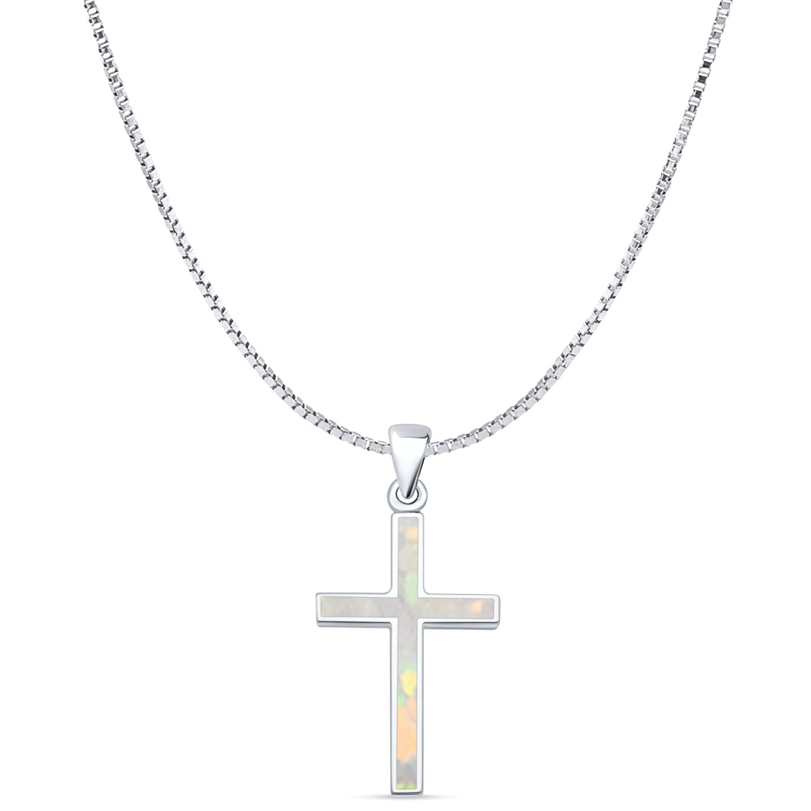 Lab Created White Opal Cross Pendant Box Chain Necklace 925 Sterling Silver