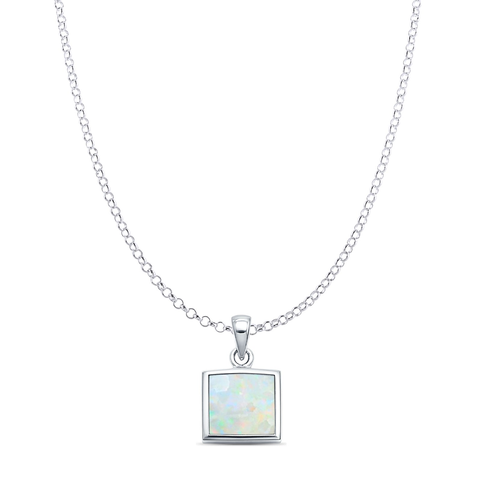 Lab Created White Opal Princess Cut Pendant Rolo Chain Necklace 925 Sterling Silver