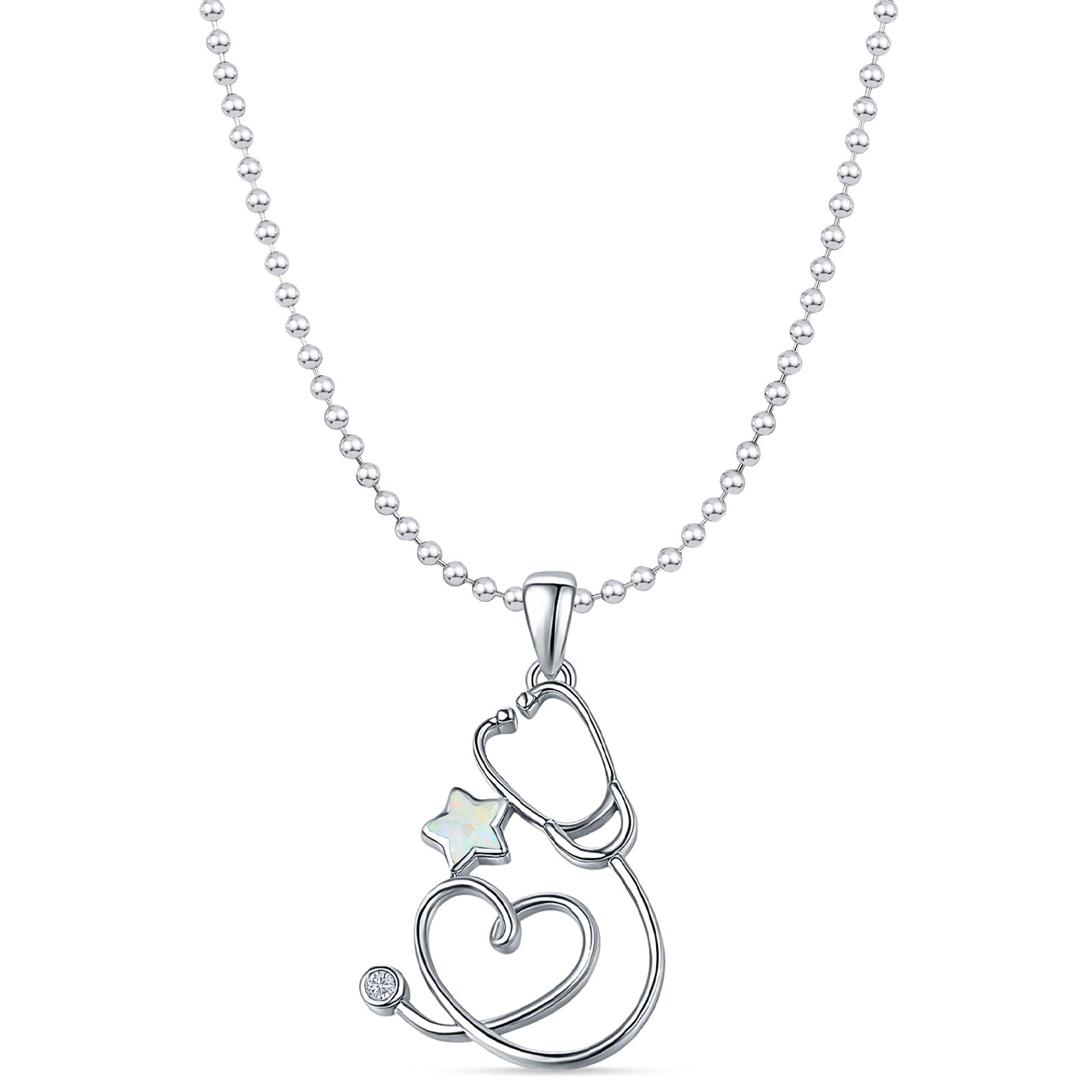 Lab Created White Opal Star & Stethoscope Pendant Bead Chain Necklace 925 Sterling Silver