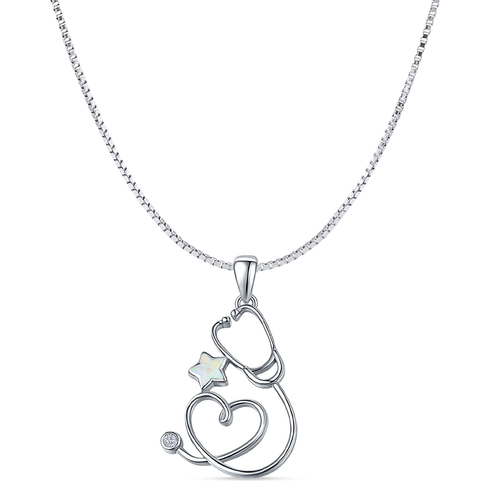 Style: Lab Created White Opal Star & Stethoscope Pendant Necklace