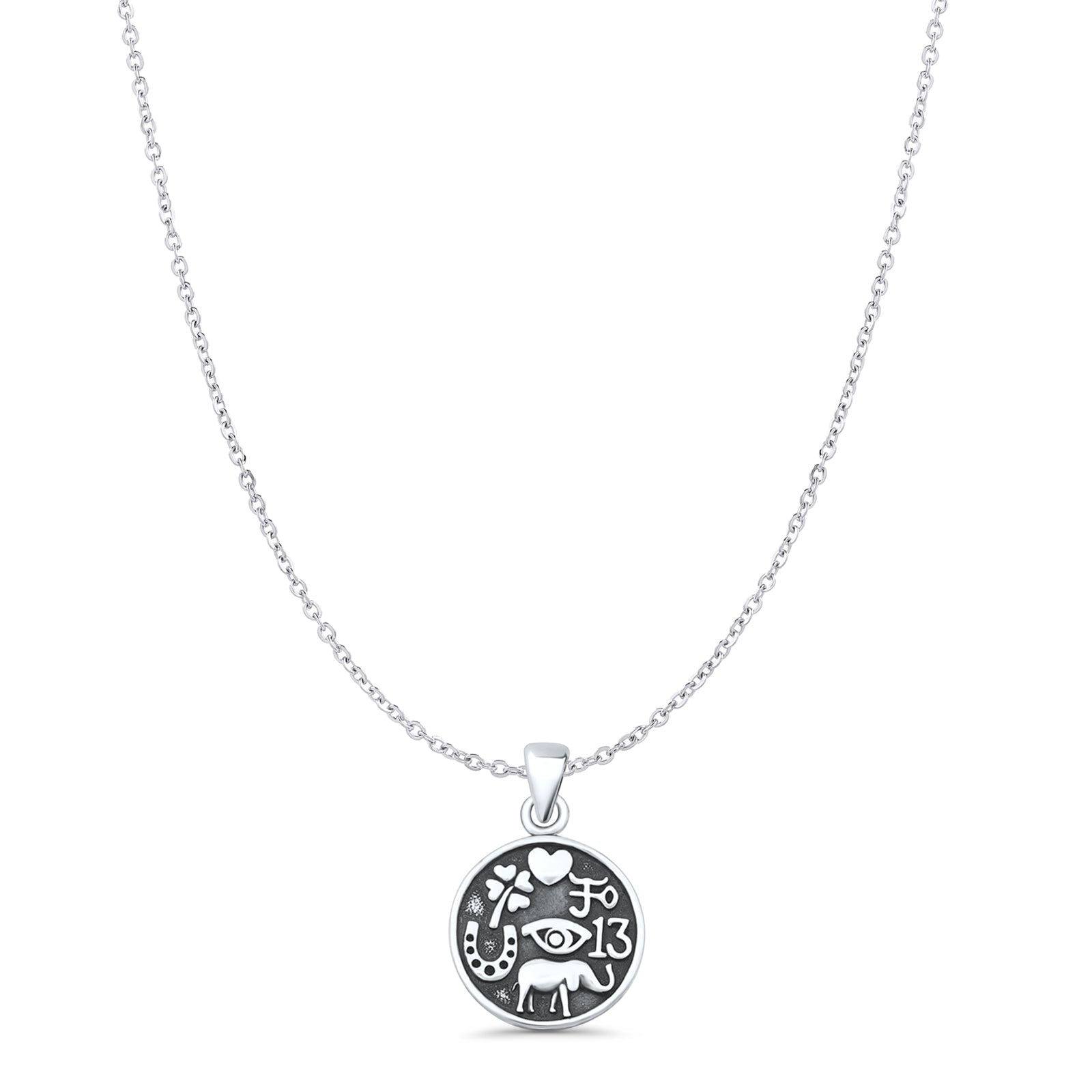 Lucky Symbols Pendant Oxidized Cable Chain Necklace 925 Sterling Silver