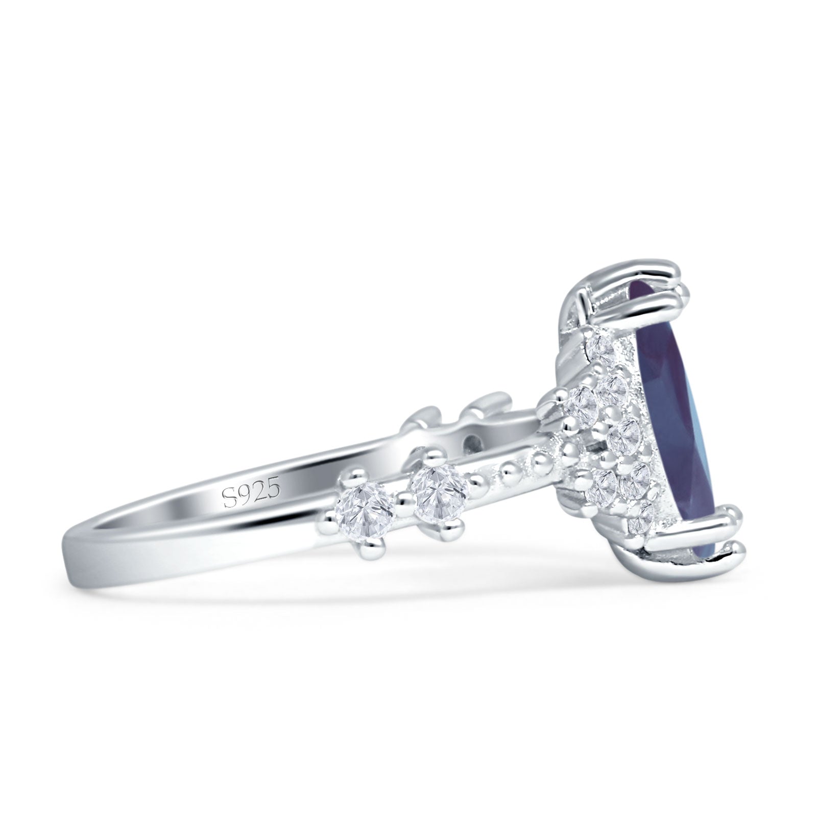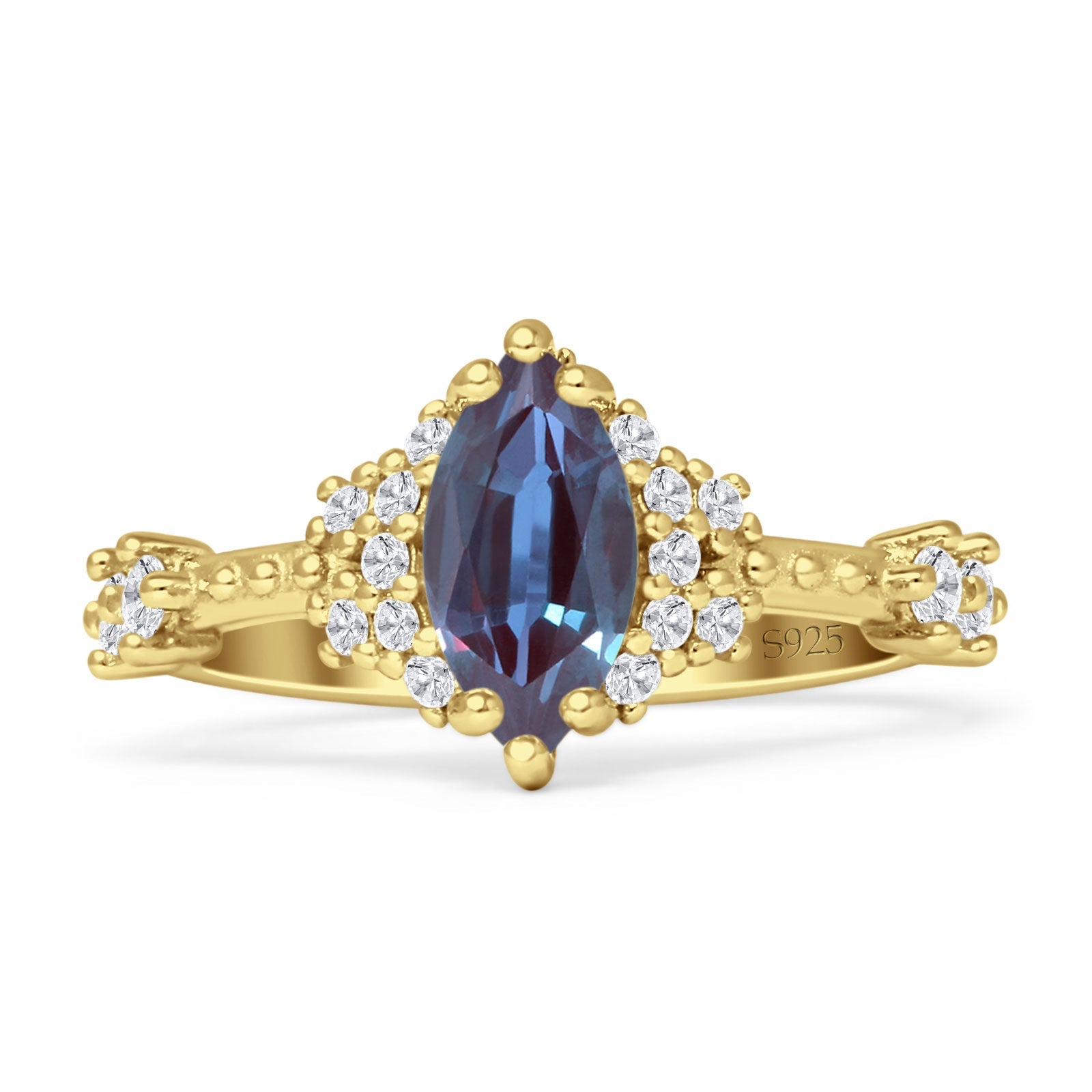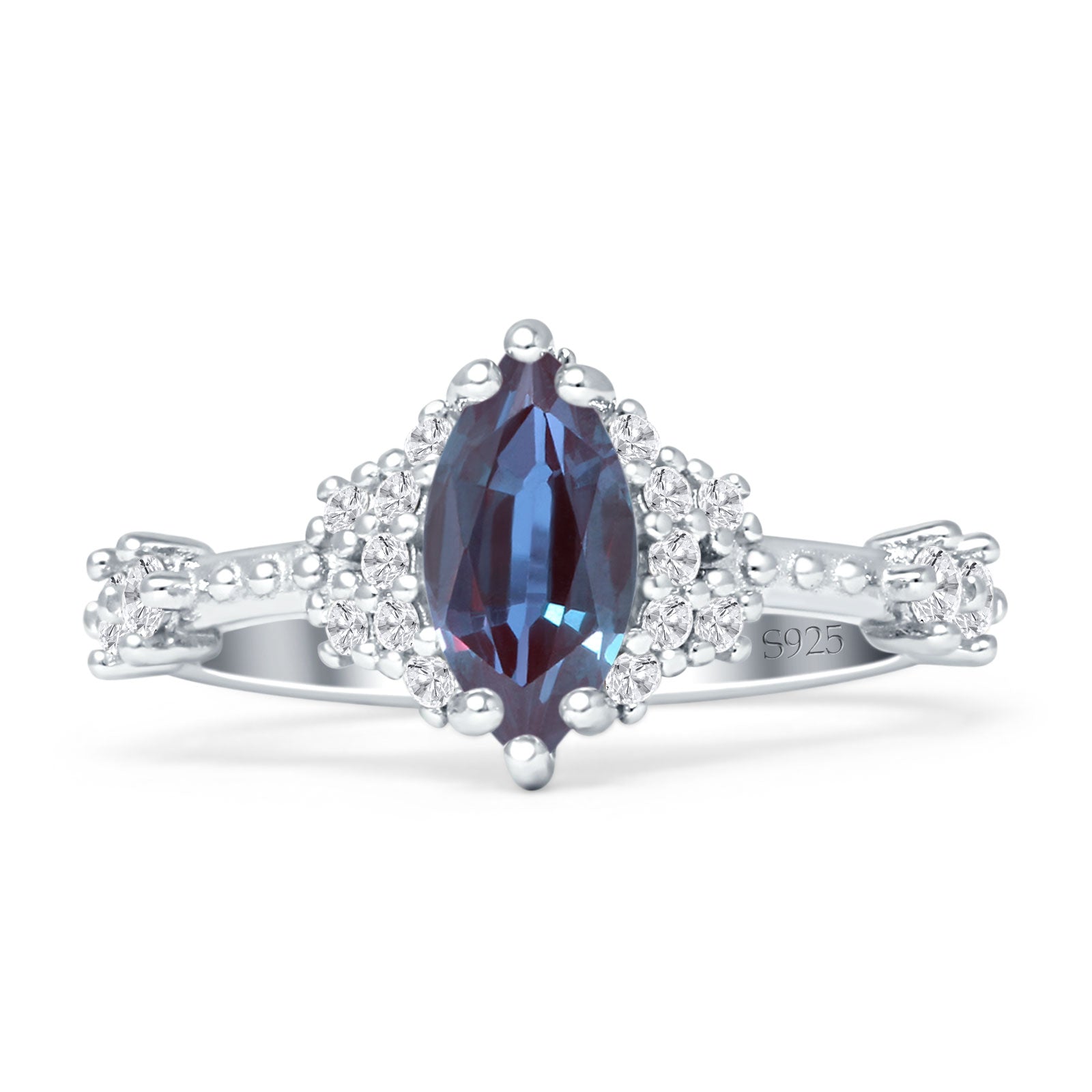 Product Description:The "marquise Lab Alexandrite halo beaded ring" is a celebration of sophistication in 925 sterling silver. Featuring a stunning marquise-cut Alexandrite, this ring is encircled by a halo of meticulously crafted beads, accentuating the gemstone’s tranquil blue. The sterling silver band, adorned with its own beaded details, complements the centerpiece, making this ring a timeless choice for those who appreciate the fine artistry of the past with the shine of the present.