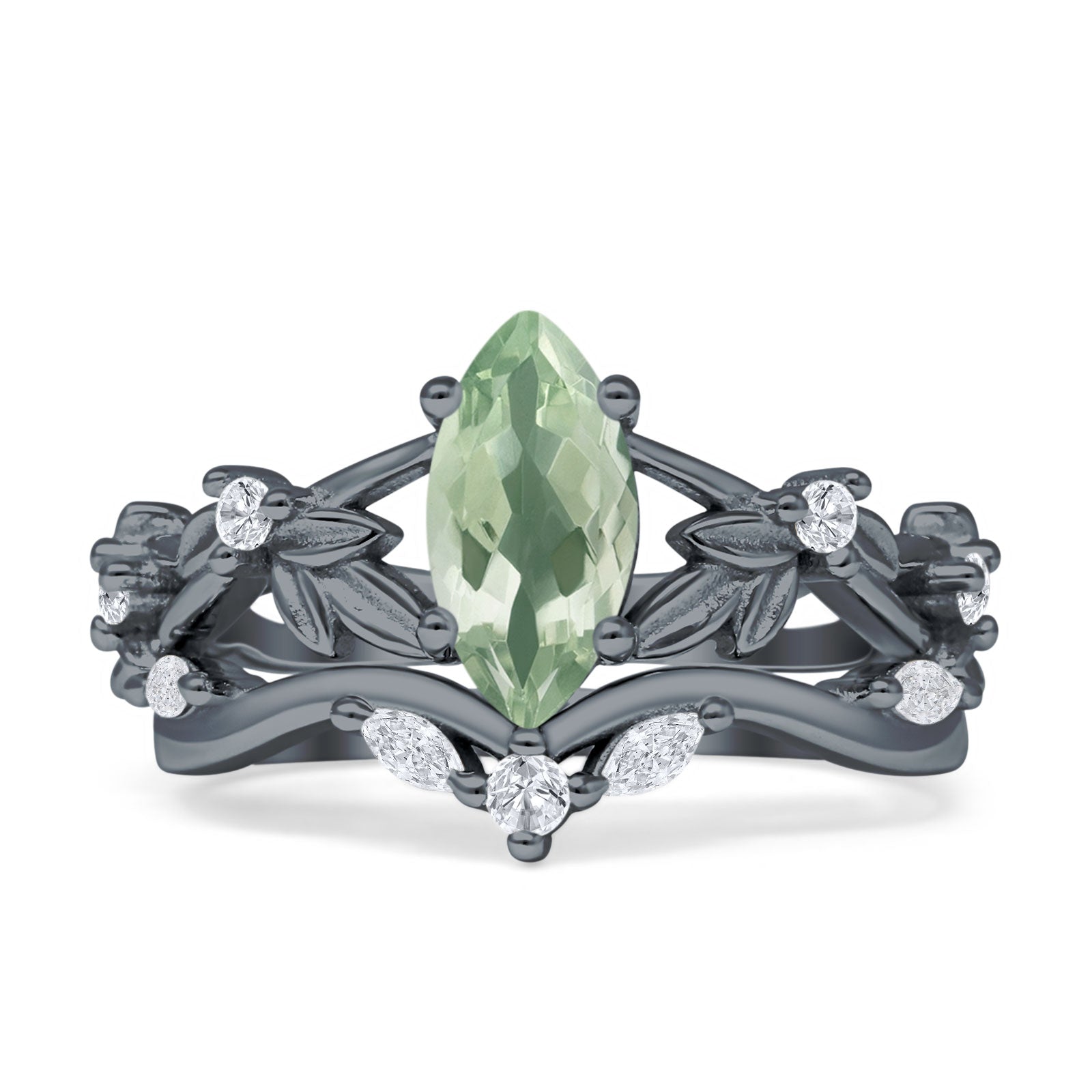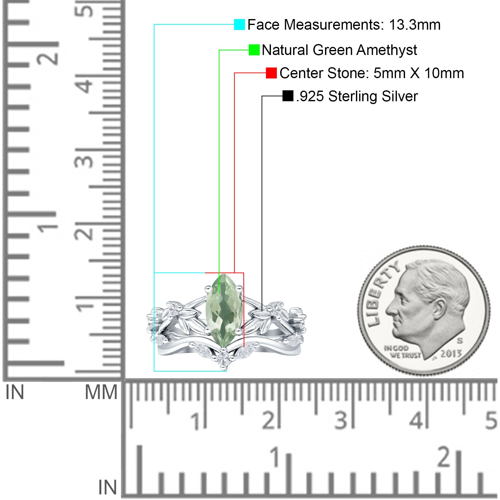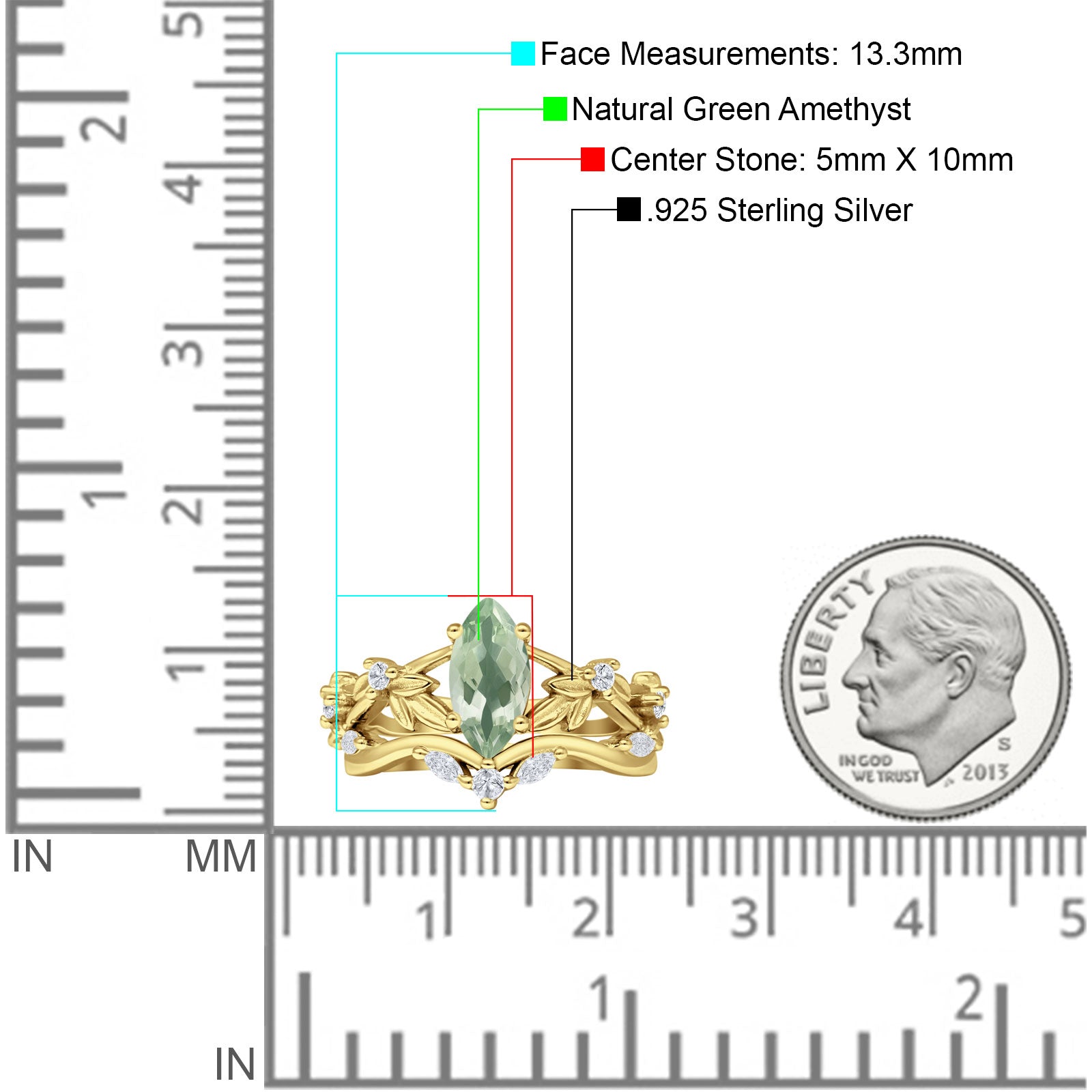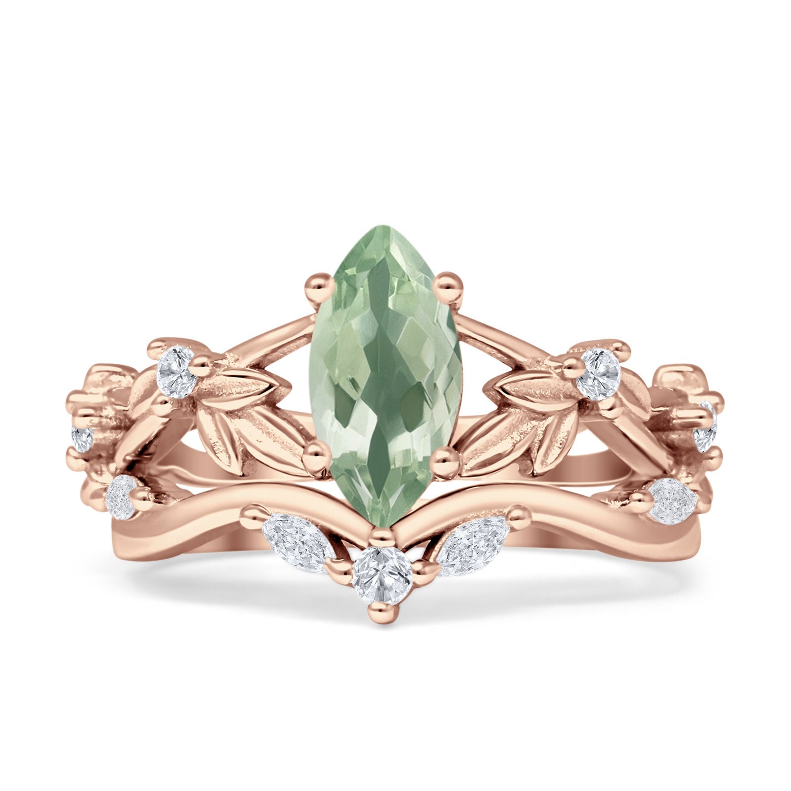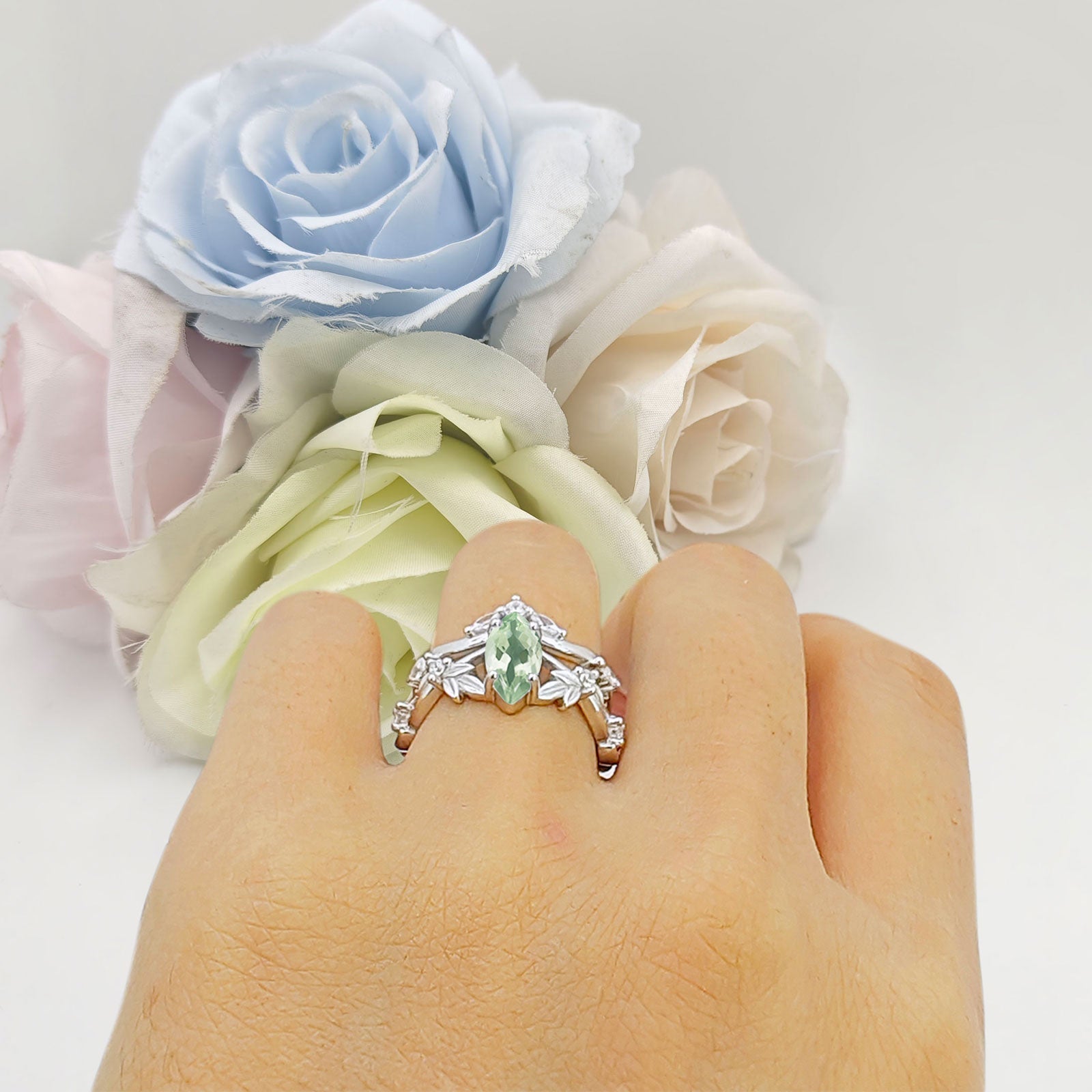Product Description: Indulge in timeless elegance with our marquise natural Green Amethyst Prasiolite split shank ring. Crafted from sterling silver, it features a stunning marquise-cut Green Amethyst Prasiolite gemstone set amidst intricate leaf and floral detailing. A perfect blend of vintage style and modern sophistication, this ring is a captivating choice for any occasion.
