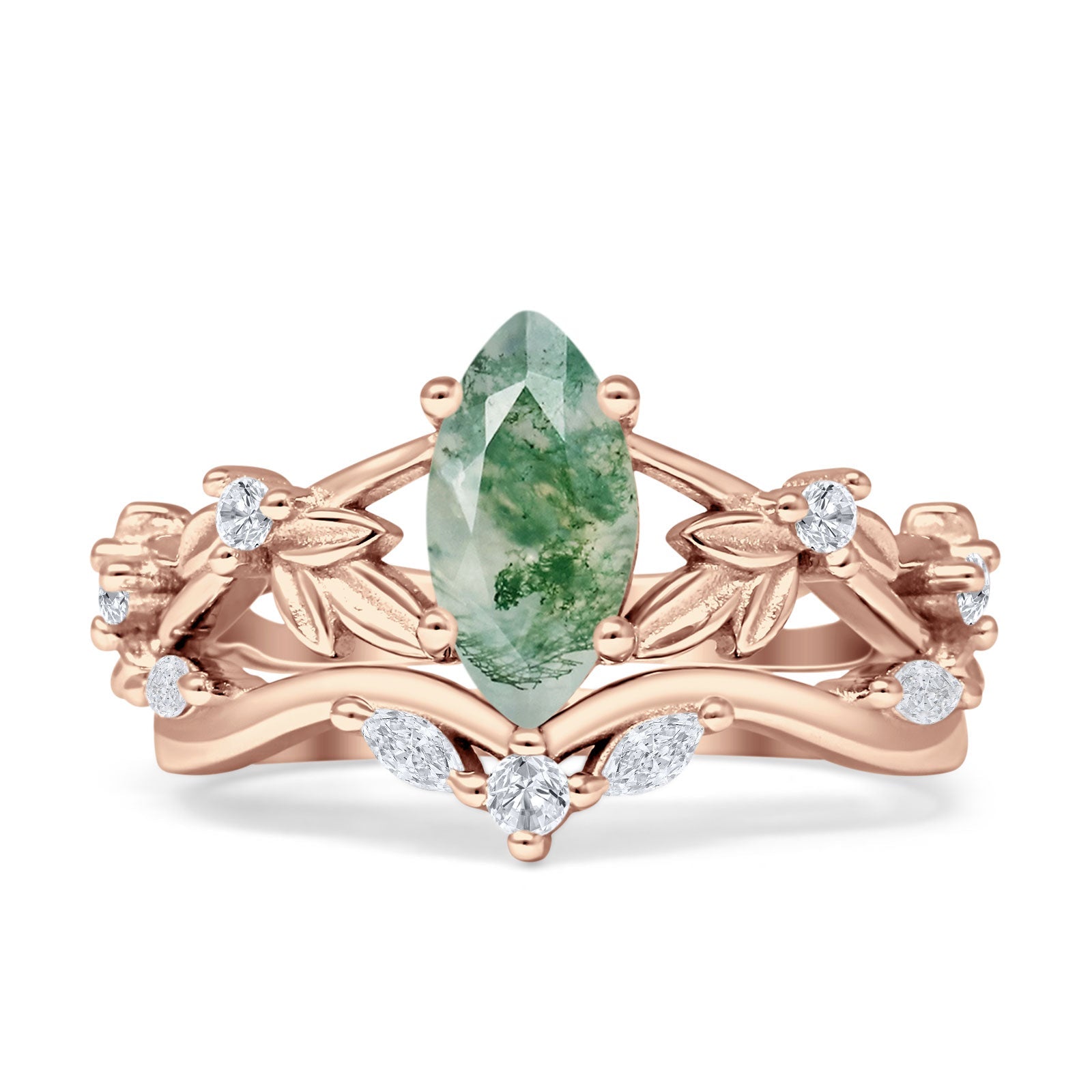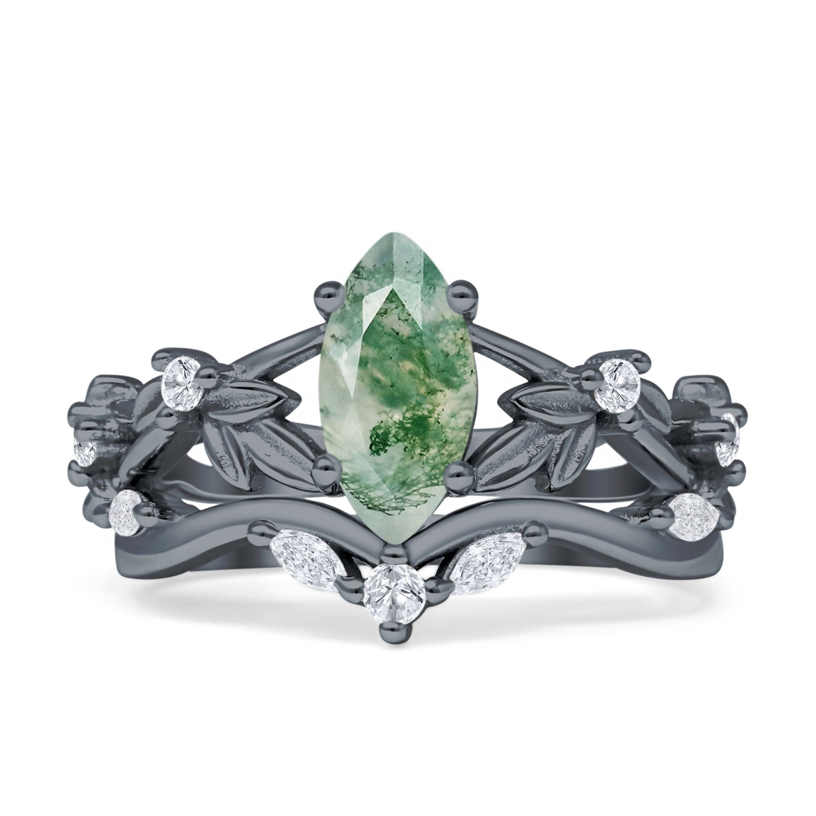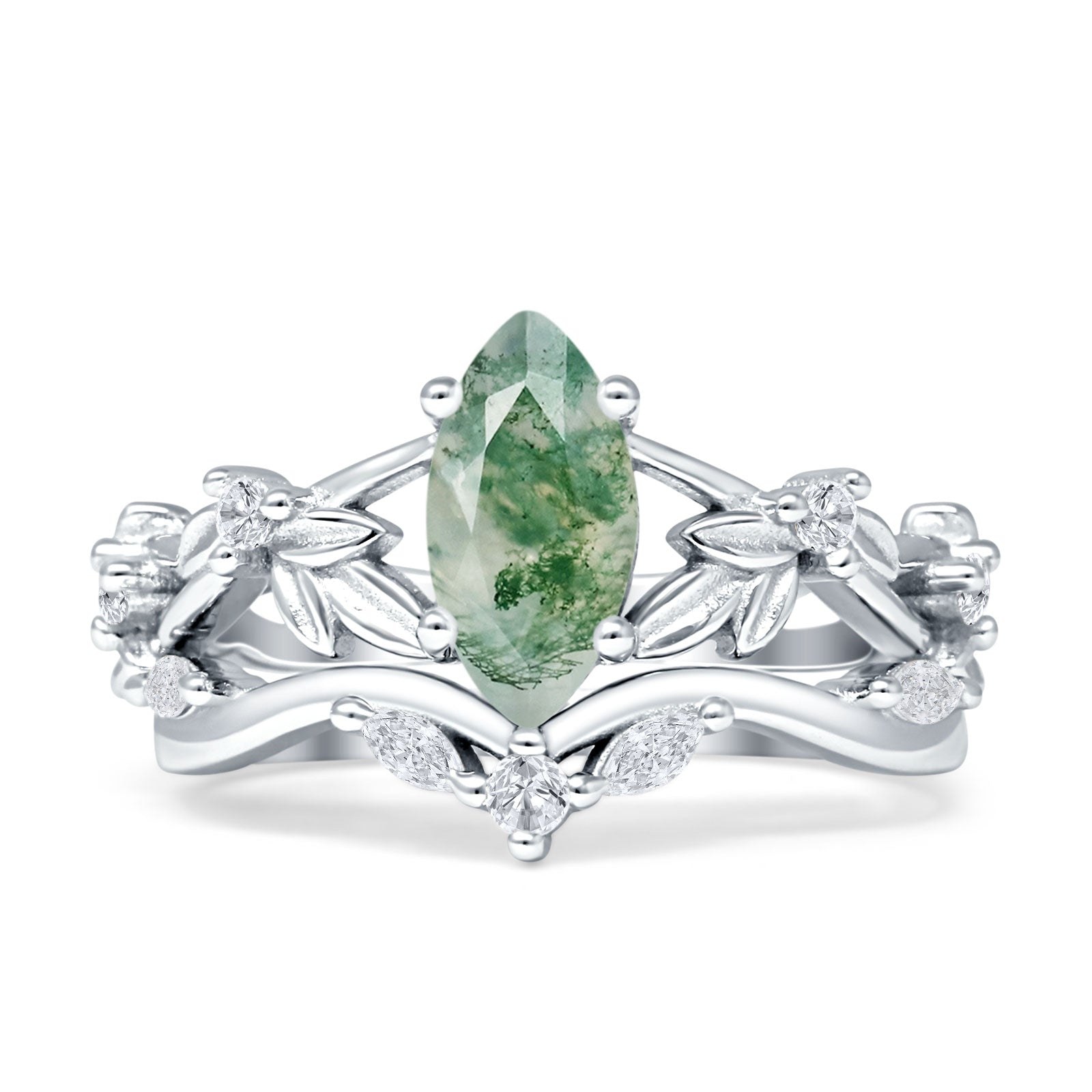 Product Description:Indulge in timeless elegance with our marquise natural Green Moss Agate split shank ring. Crafted from sterling silver, it features a stunning marquise-cut Green Moss Agate gemstone set amidst intricate leaf and floral detailing. A perfect blend of vintage style and modern sophistication, this ring is a captivating choice for any occasion.