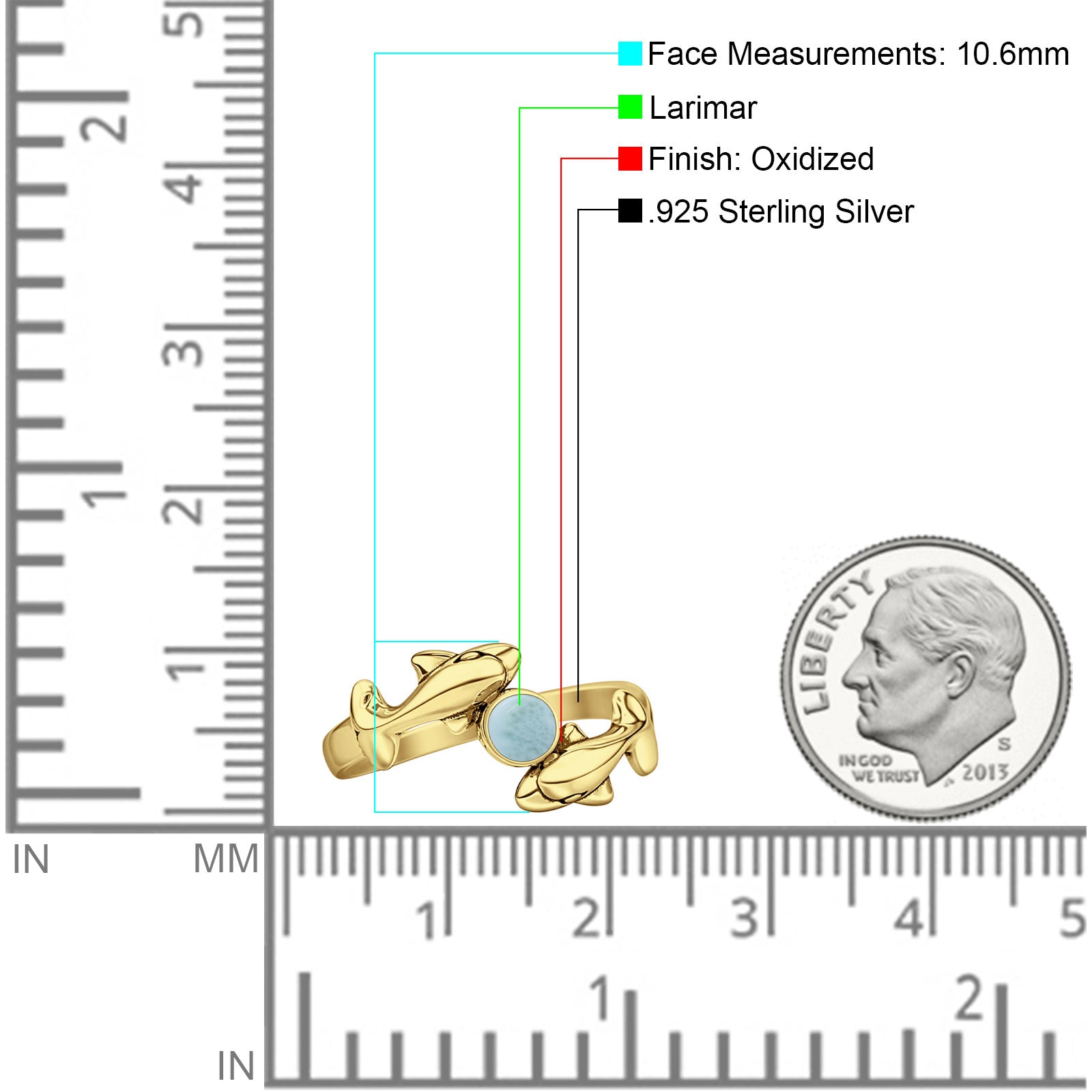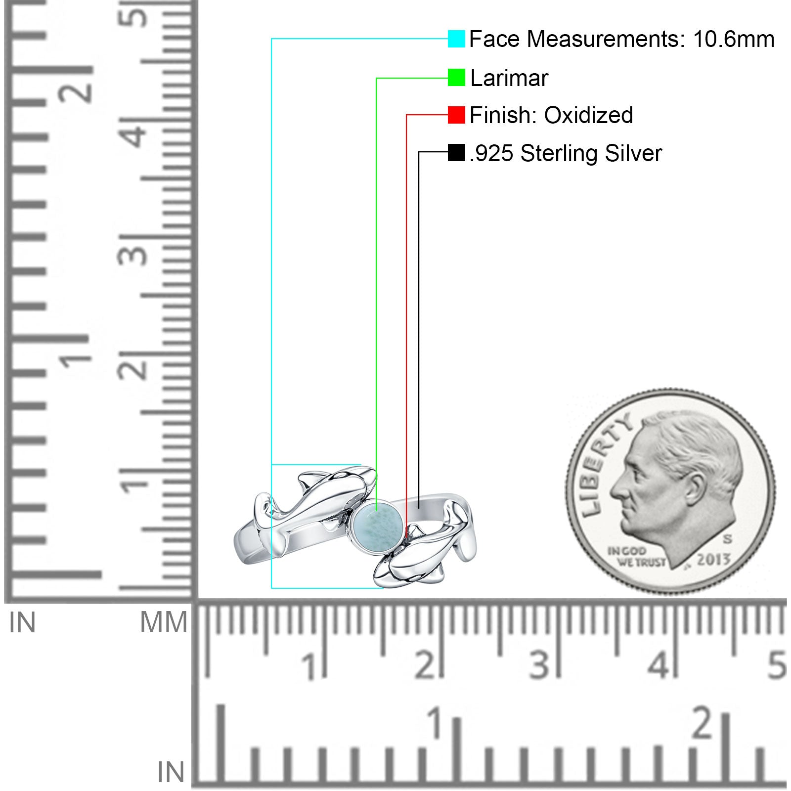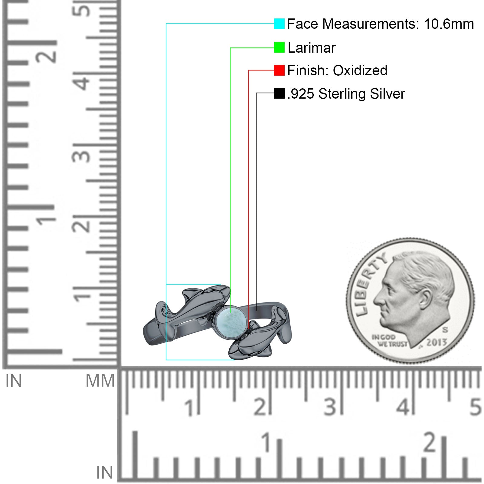 Minimalist 10.6mm Round Larimar Dolphin Ring Oxidized 925 Sterling Silver