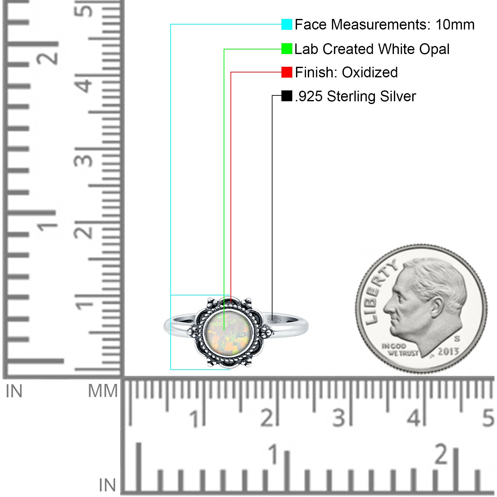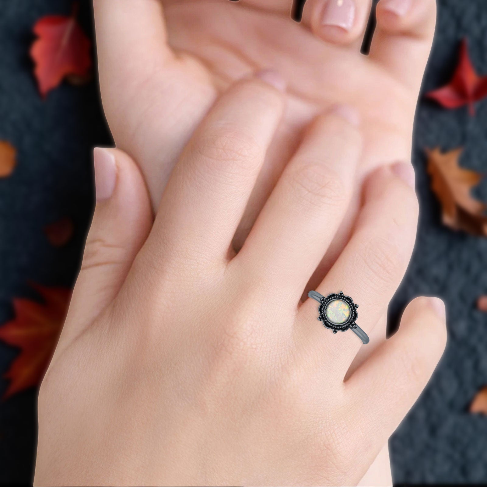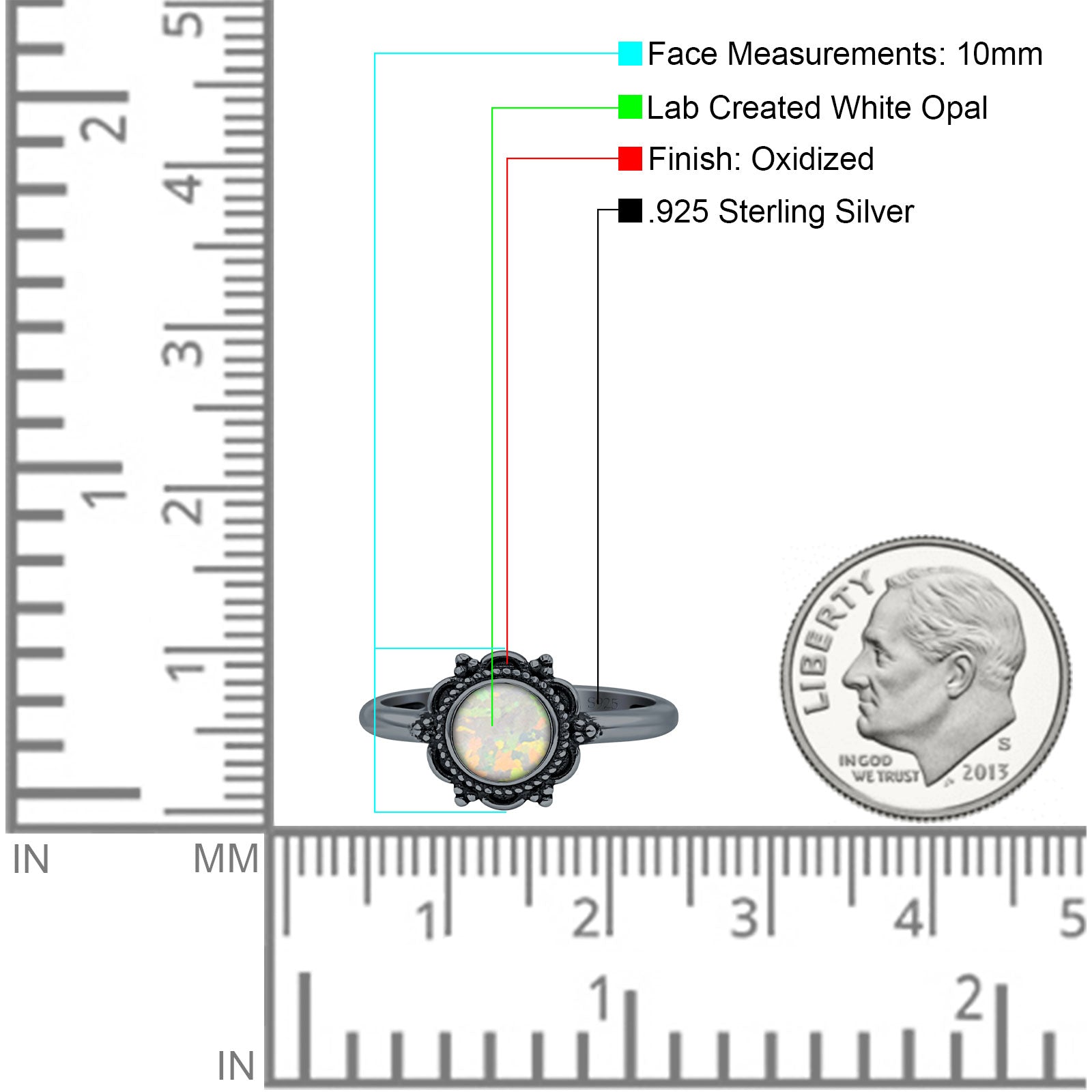 Minimalist 10mm Lab Created White Opal Beaded Flower Oxidized Ring 925 Sterling Silver
