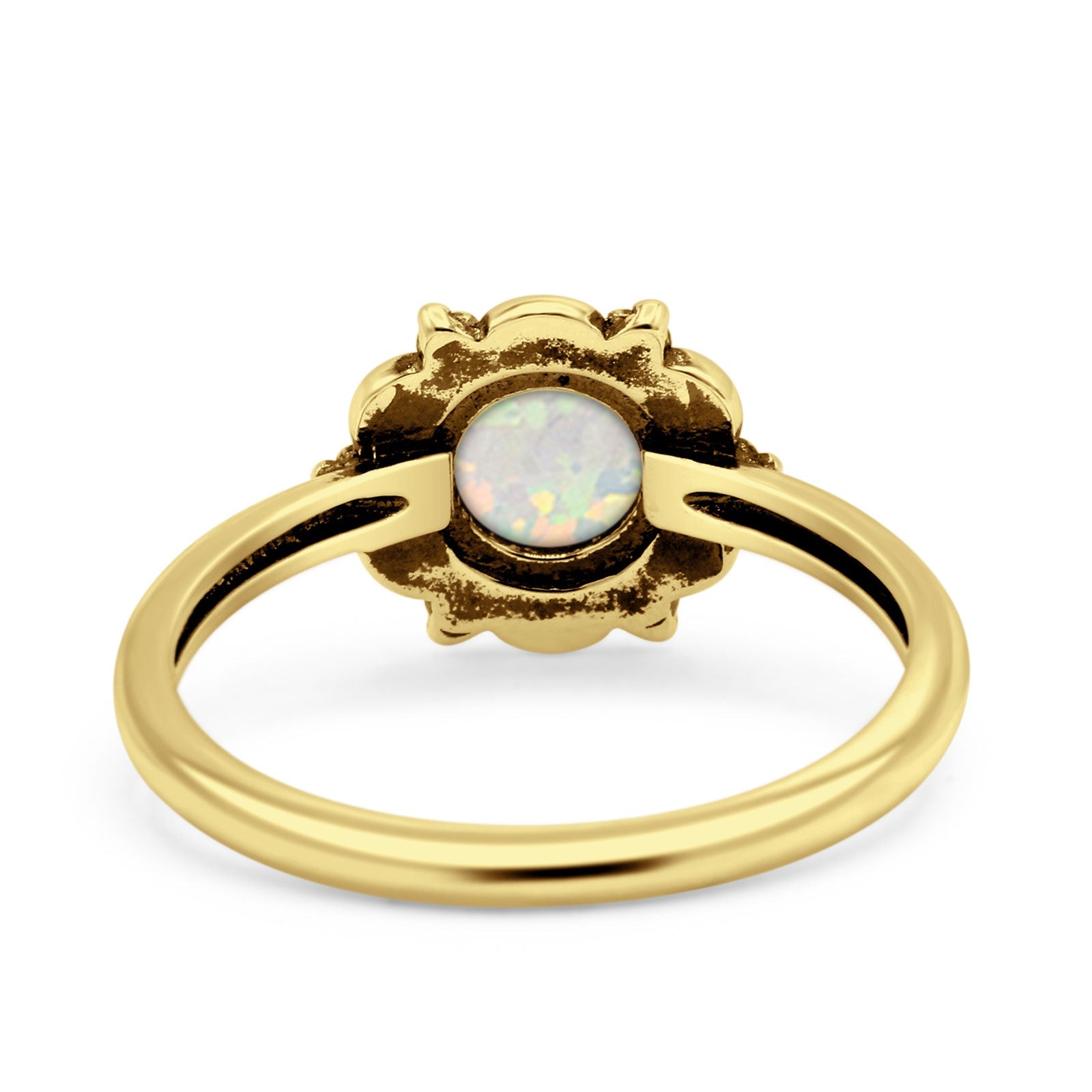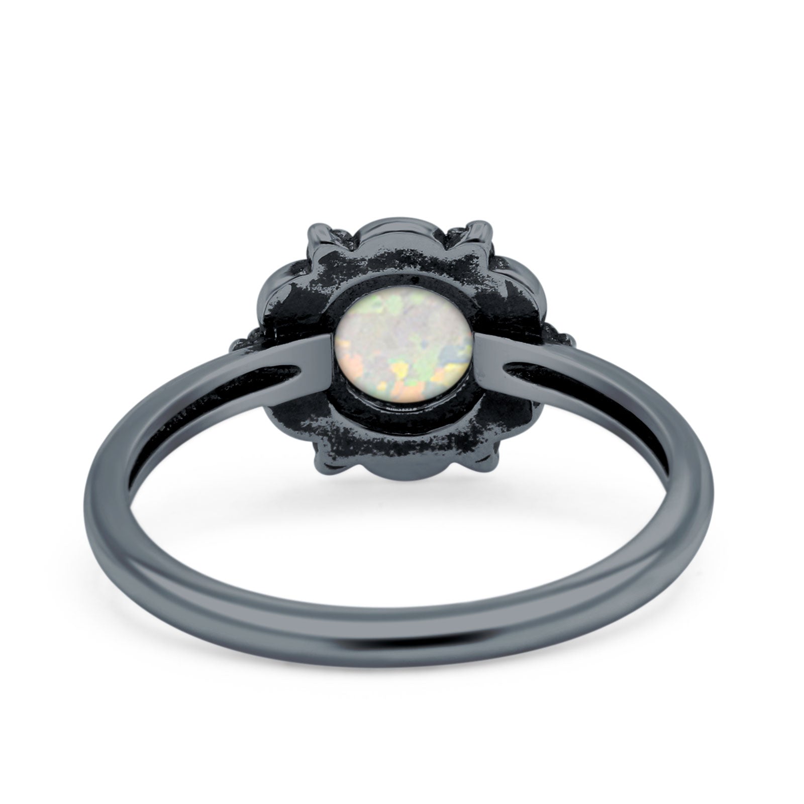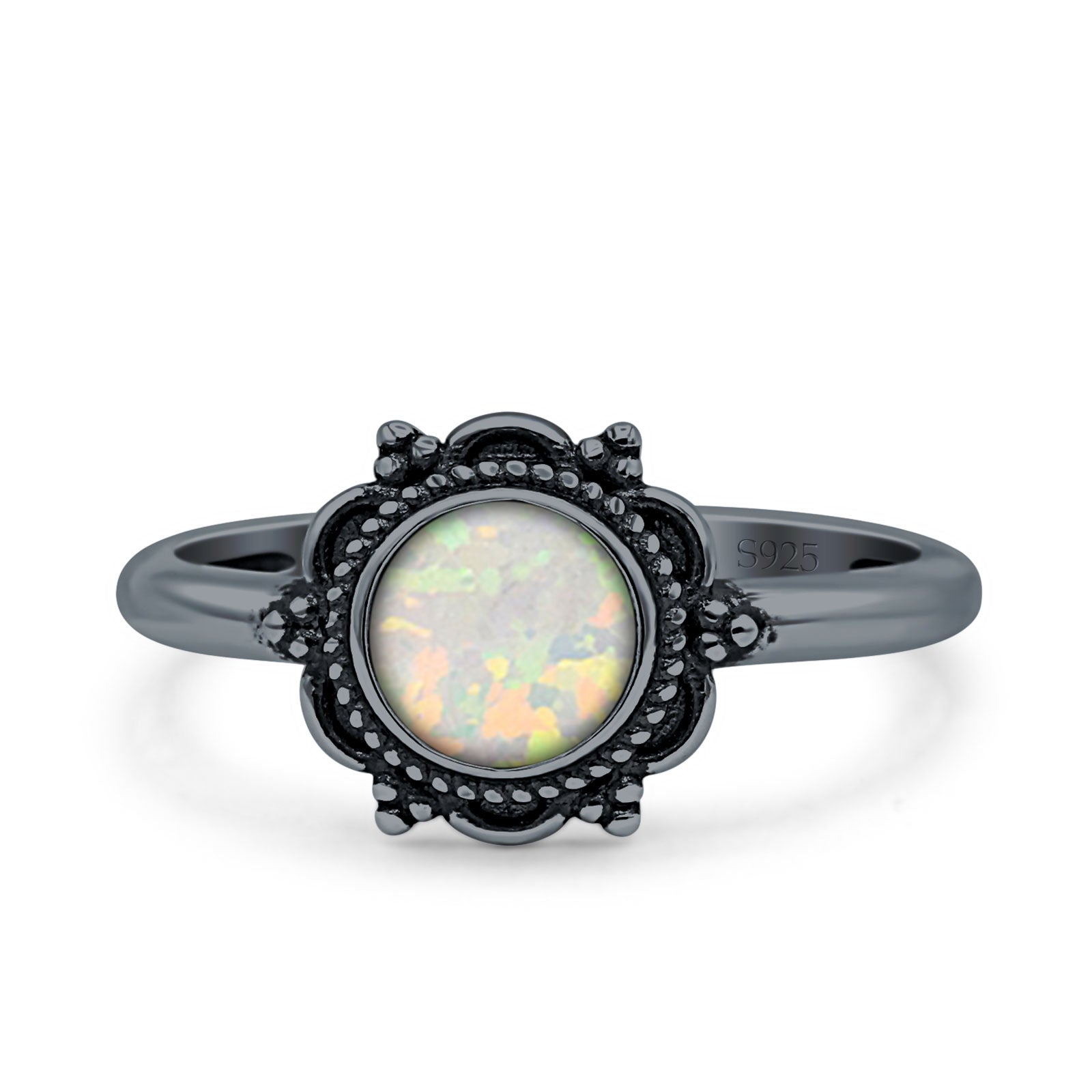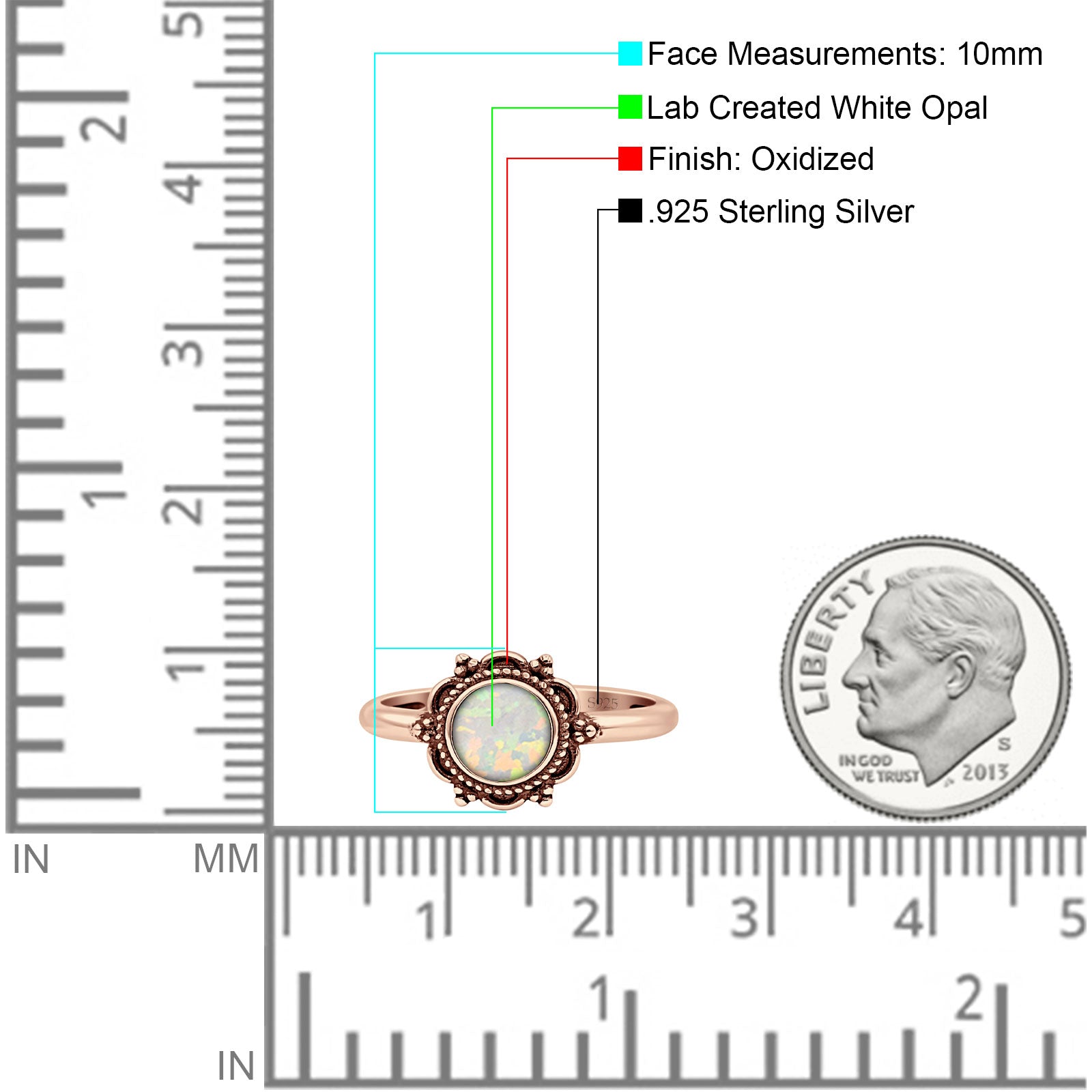 Minimalist 10mm Lab Created White Opal Beaded Flower Oxidized Ring 925 Sterling Silver