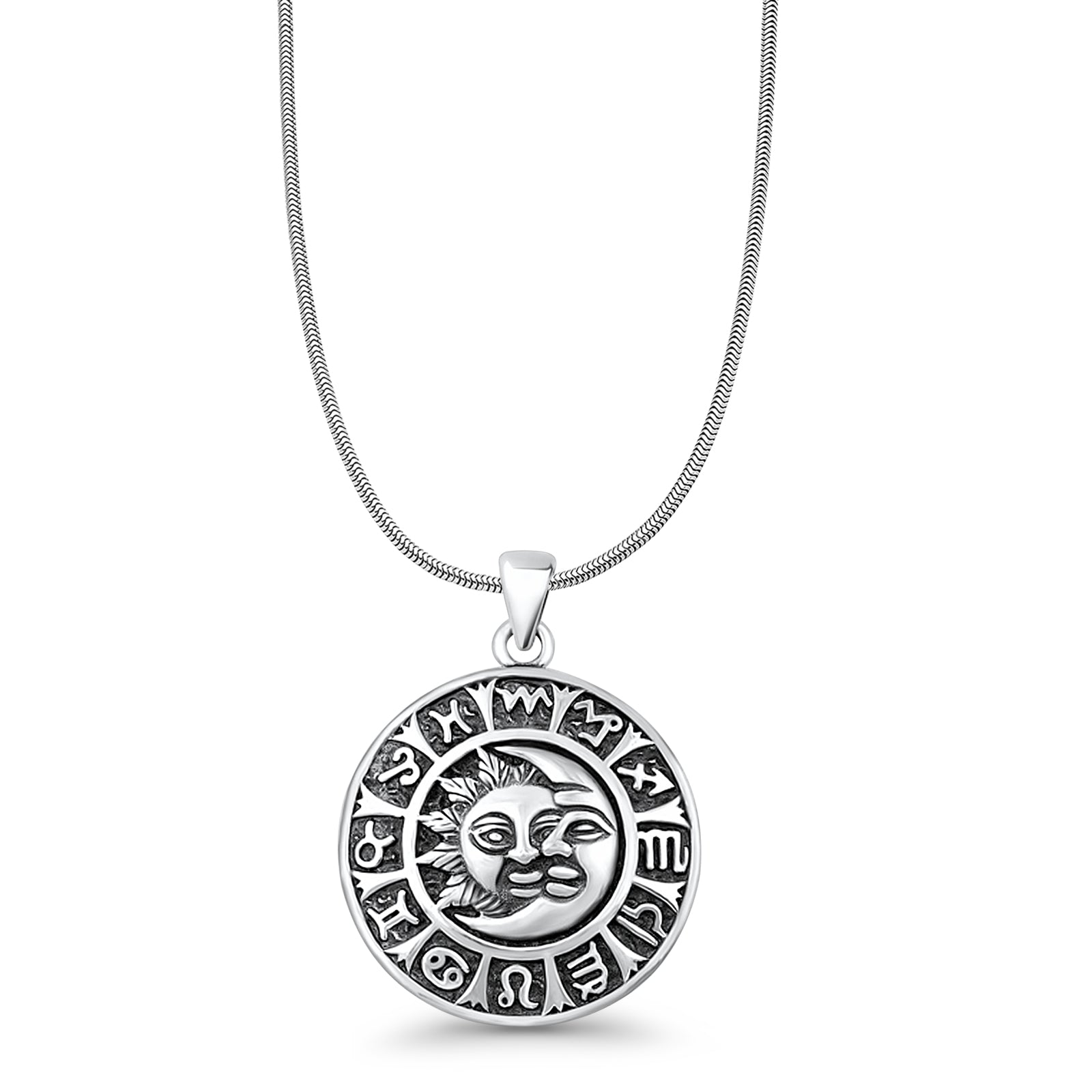 Moon, Sun & Runes Pendant Snake Chain Necklace Oxidized 925 Sterling Silver