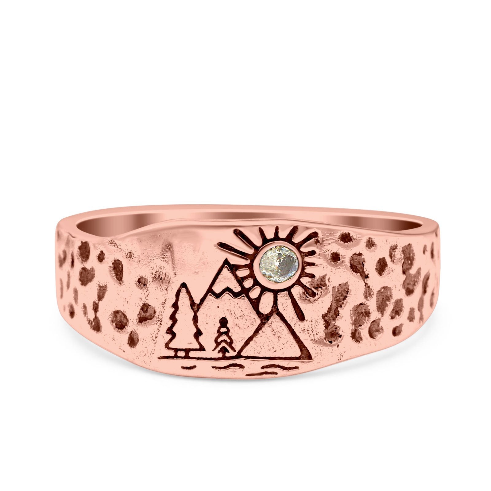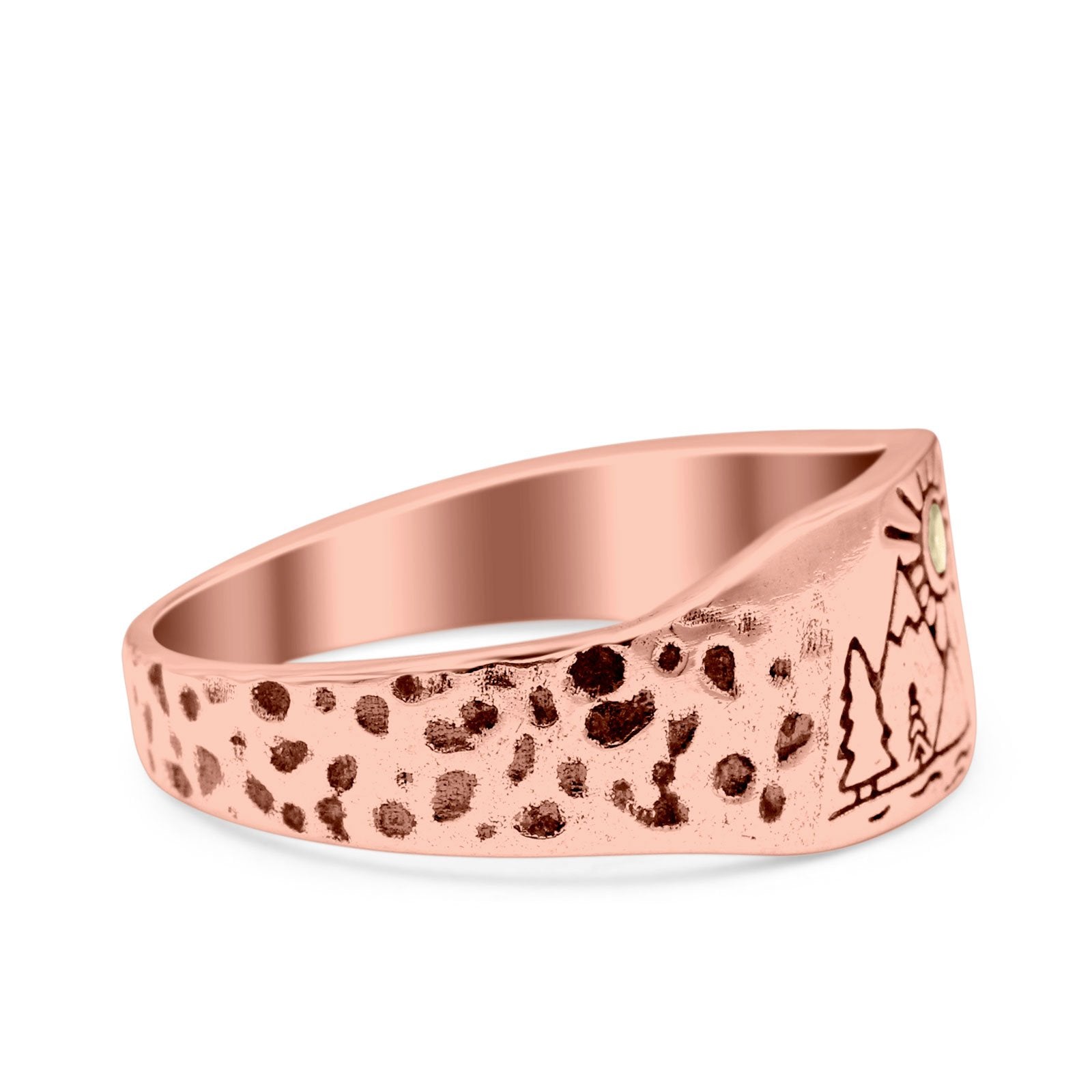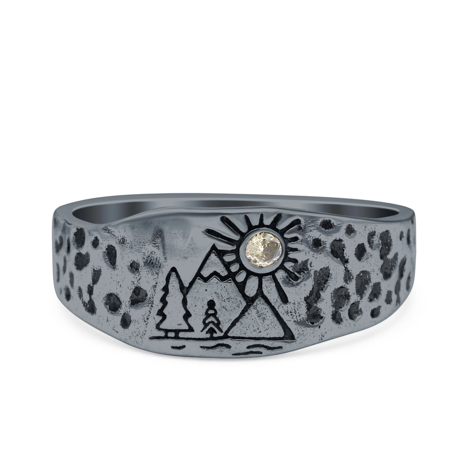 Mountains, Trees Sun Ring Oxidized Band Solid 925 Sterling Silver Thumb Ring (8mm)