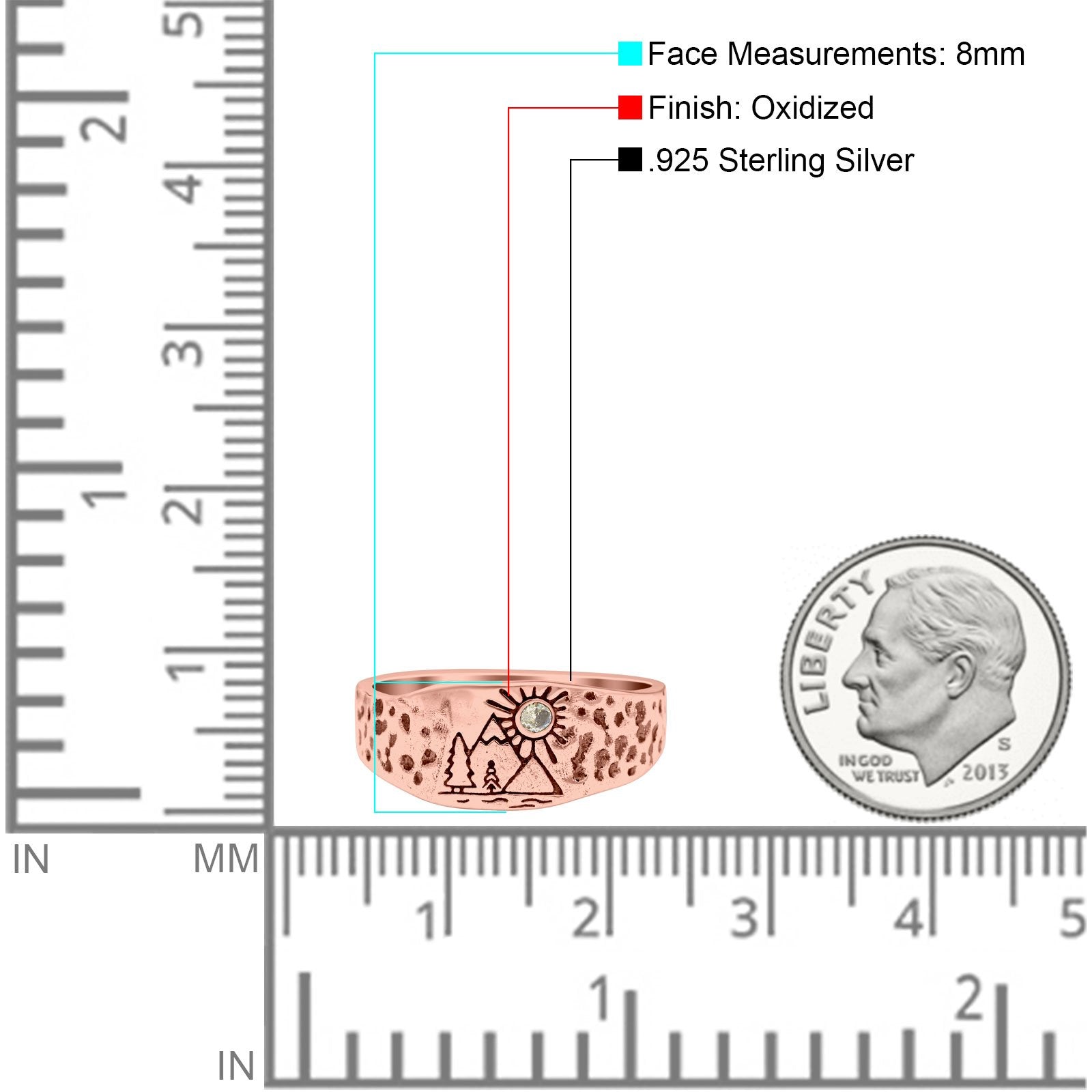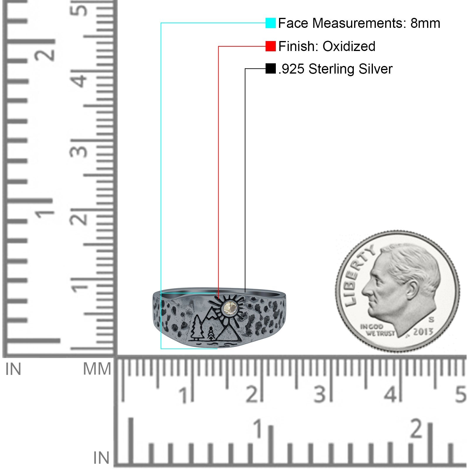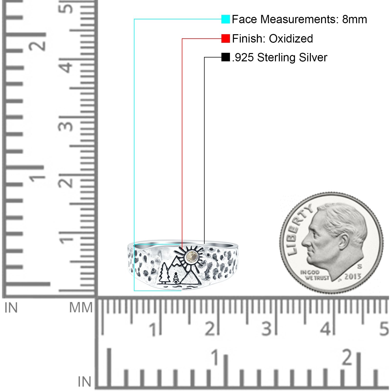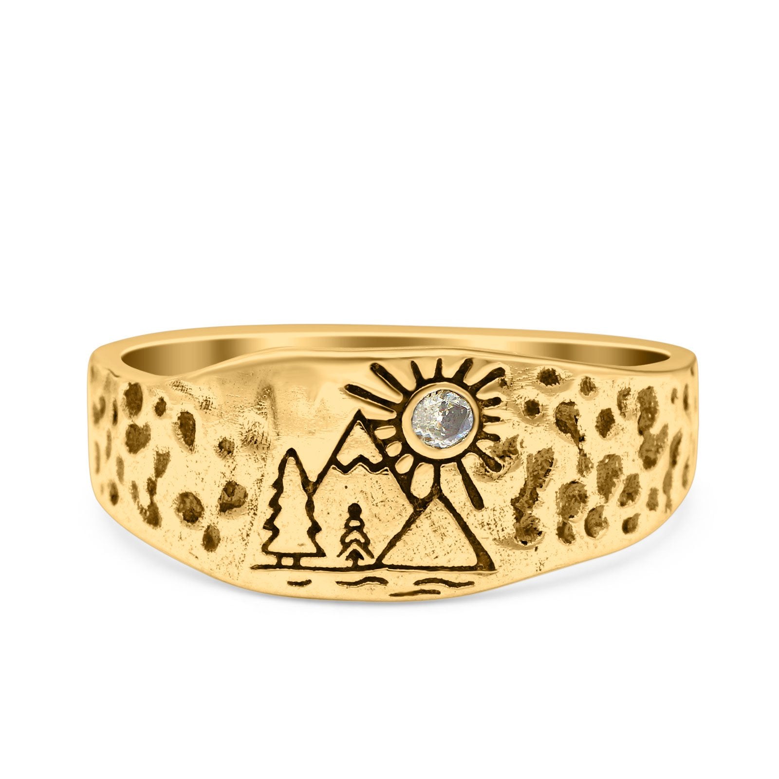 Mountains, Trees Sun Ring Oxidized Band Solid 925 Sterling Silver Thumb Ring (8mm)