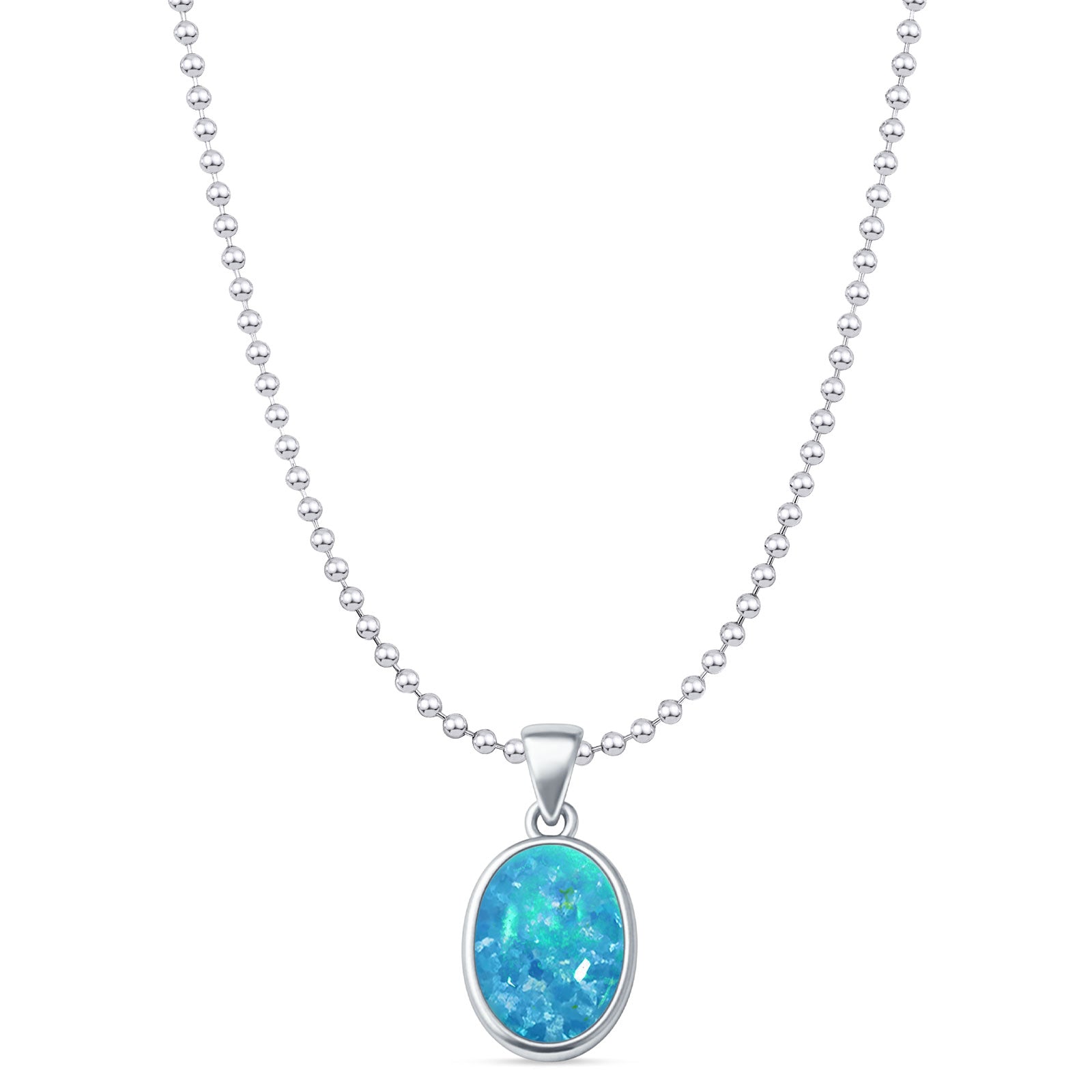 Oval Lab Created Blue Opal Solitaire Pendant Bead Chain Necklace 925 Sterling Silver