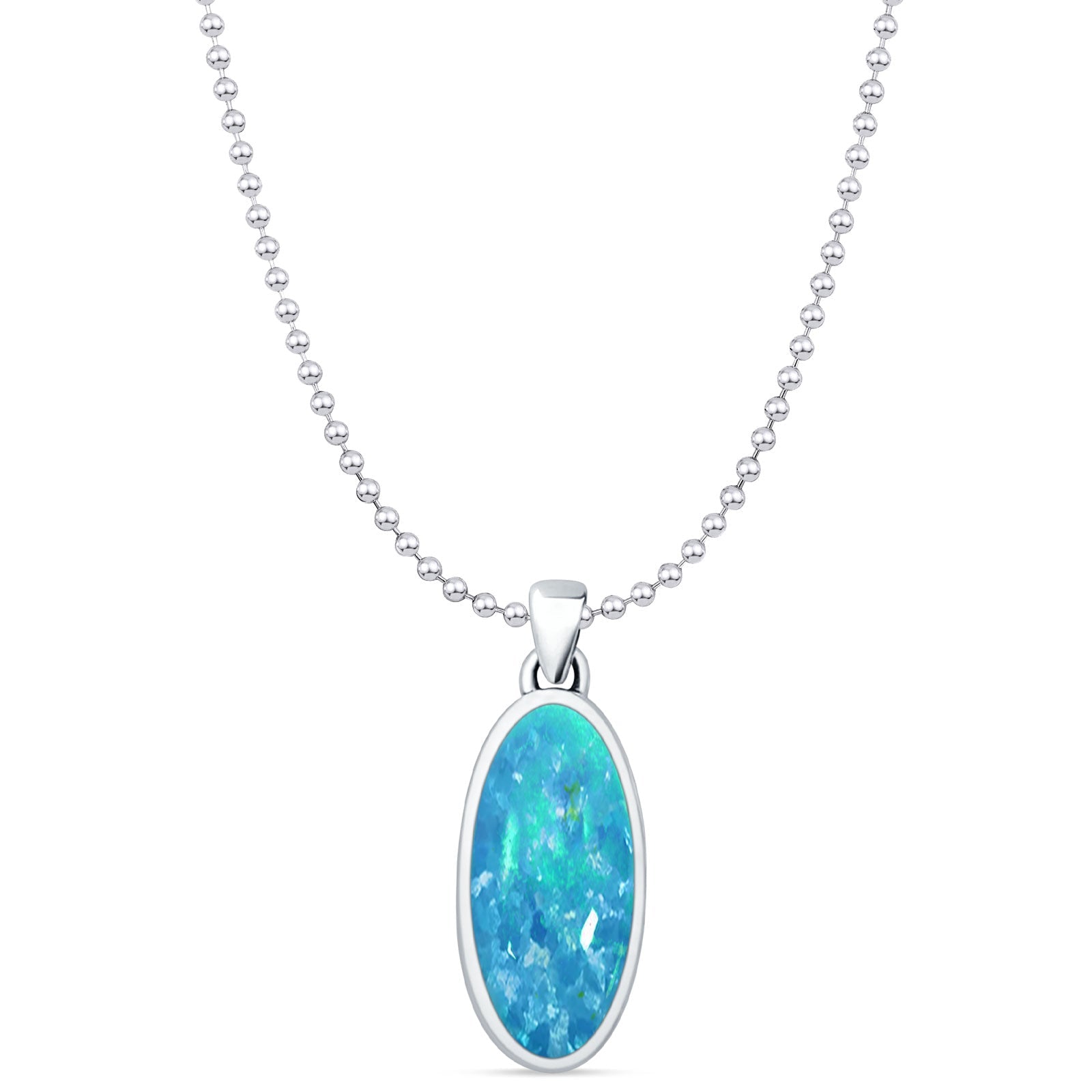 Oval Lab Created Blue Opal Solitaire Pendant Oxidized Bead Chain Necklace 925 Sterling Silver