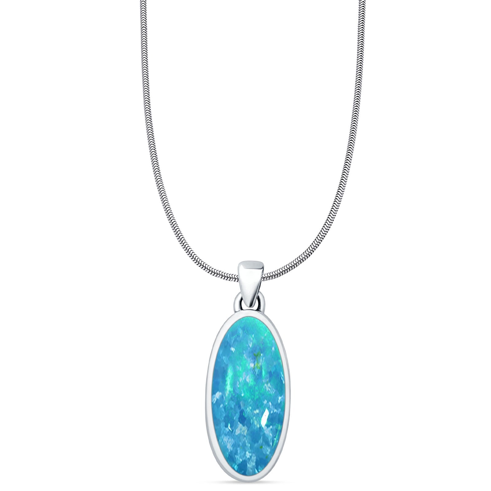 Oval Lab Created Blue Opal Solitaire Pendant Oxidized Snake Chain Necklace 925 Sterling Silver