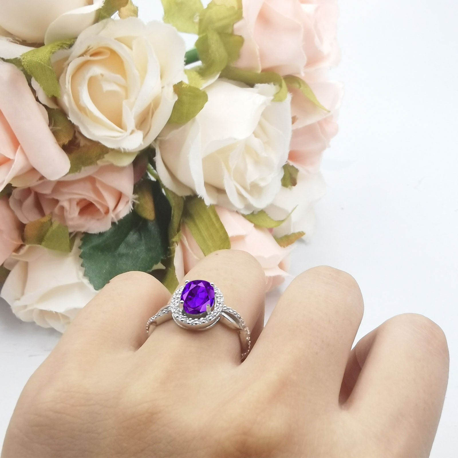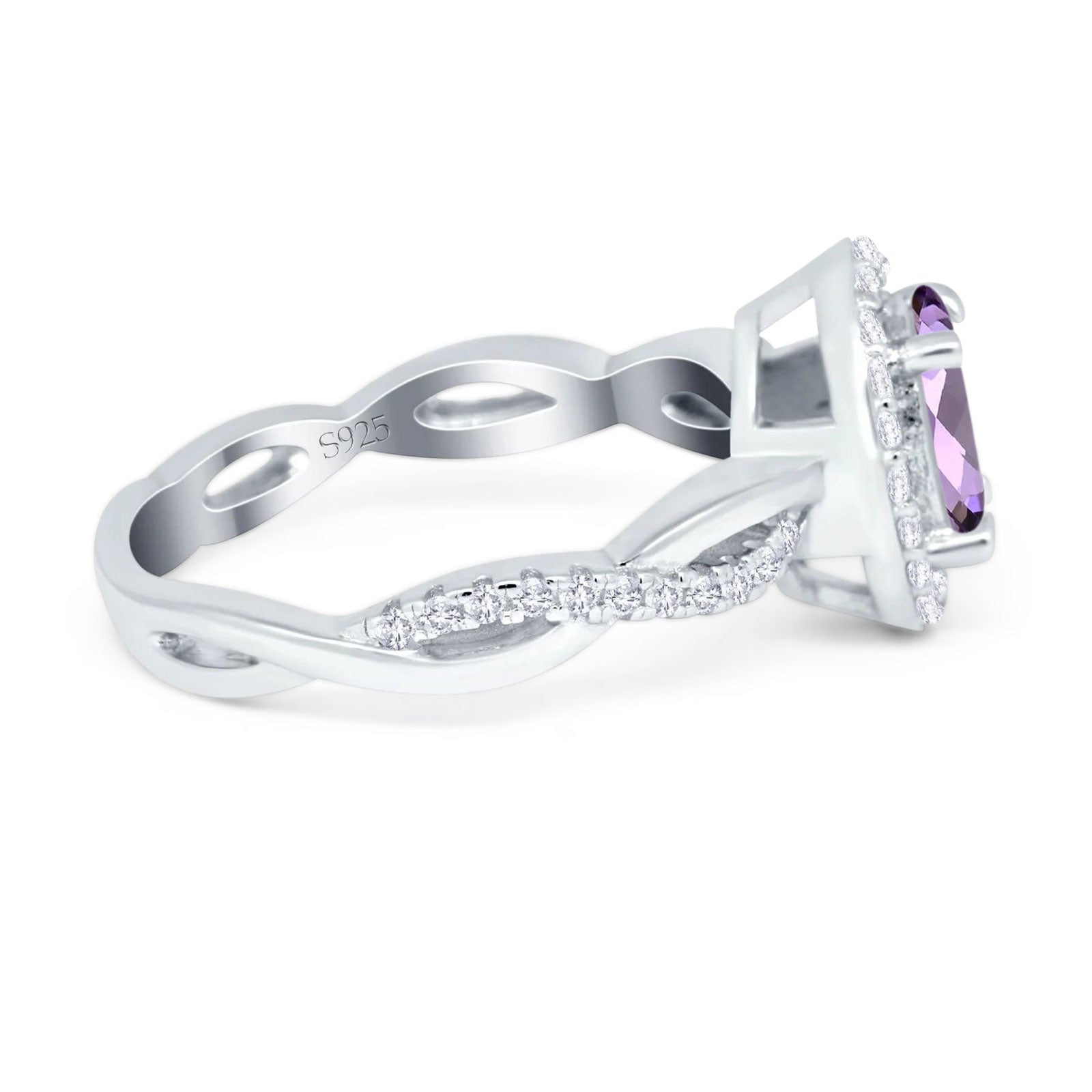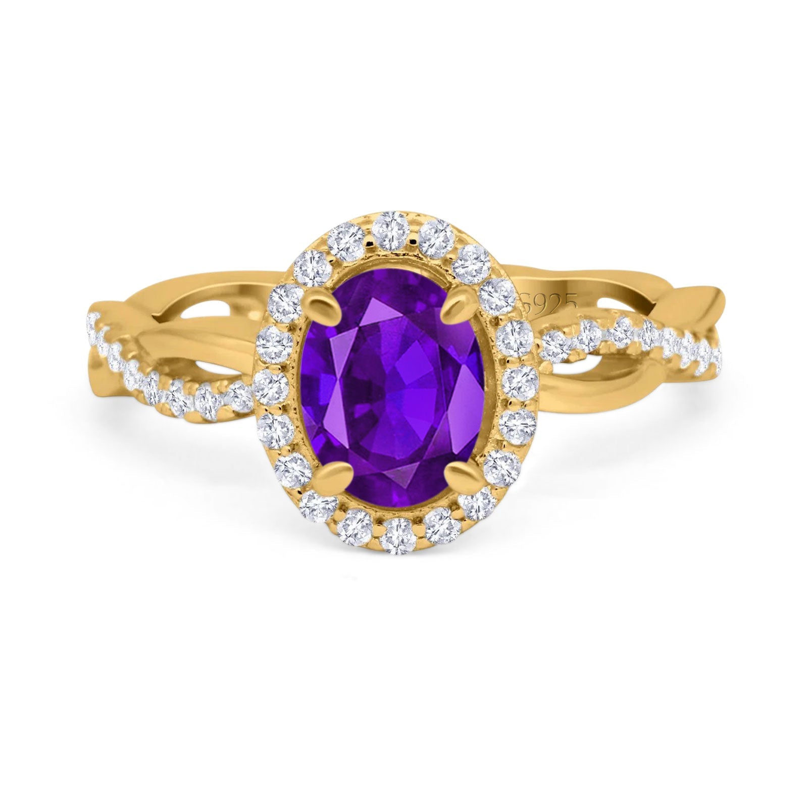 Oval Natural Amethyst Halo CZ Split Shank Twisted Ring 925 Sterling Silver