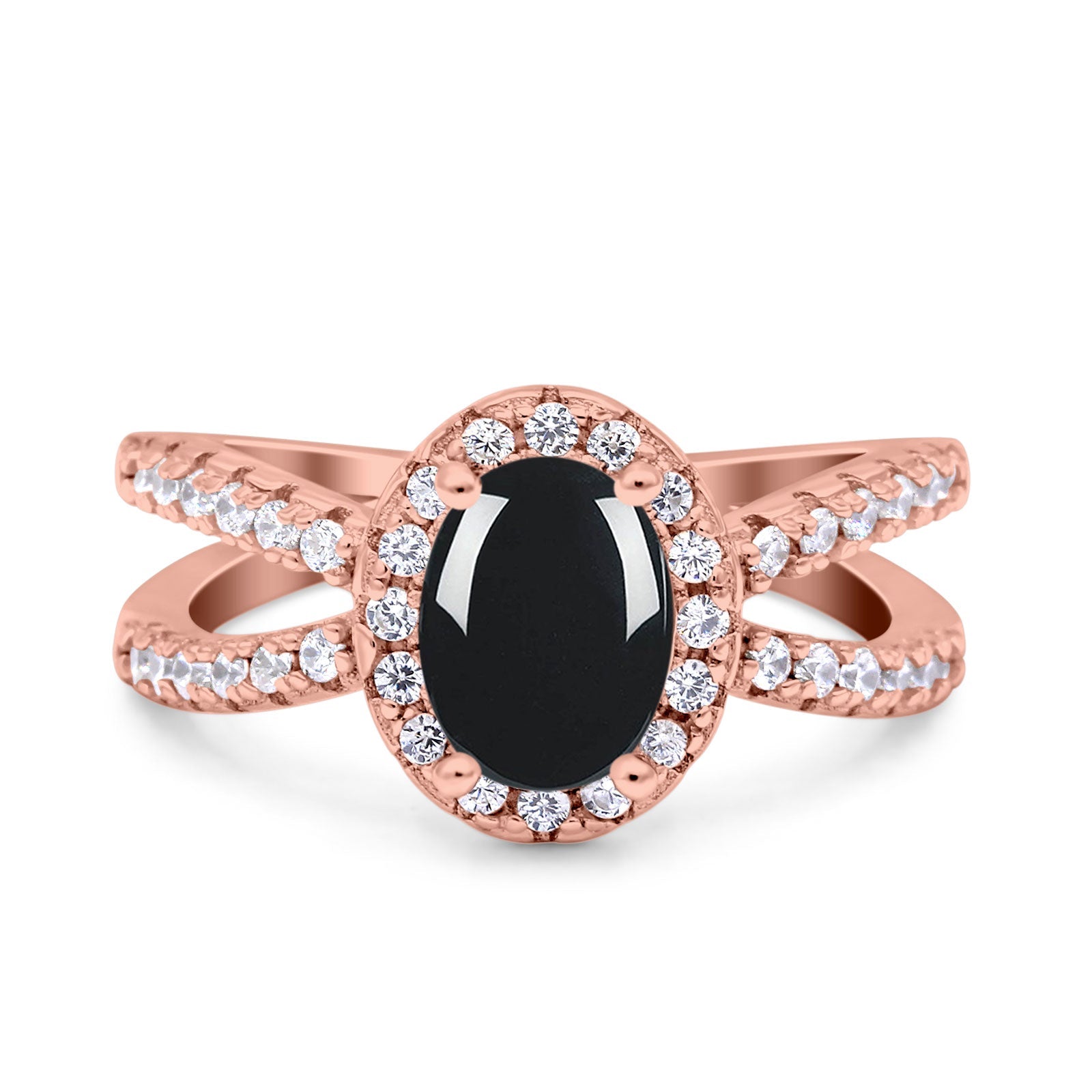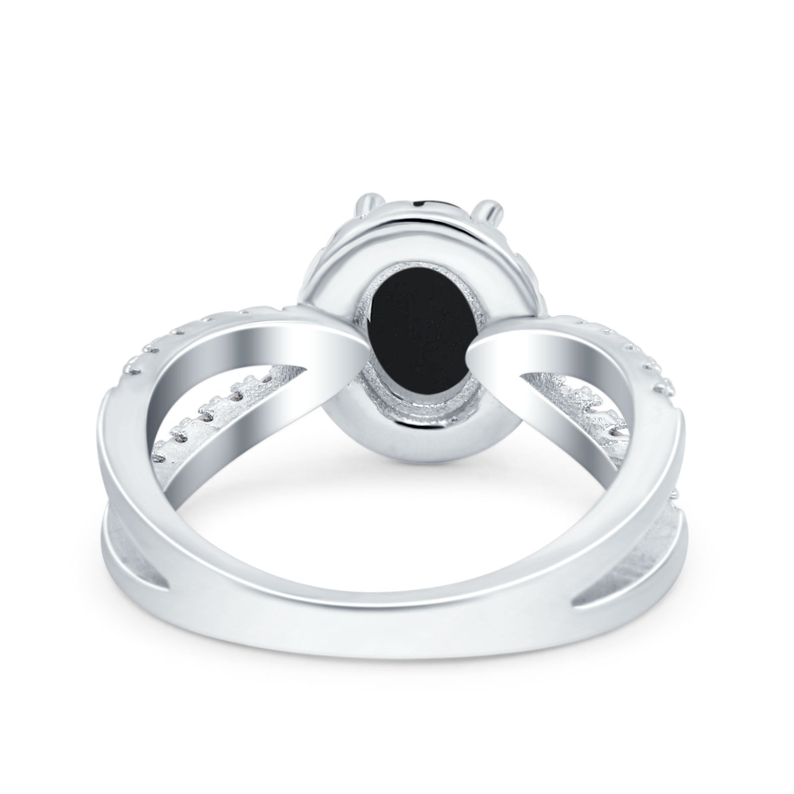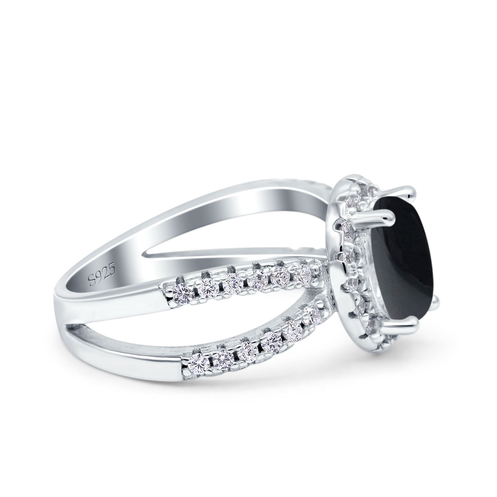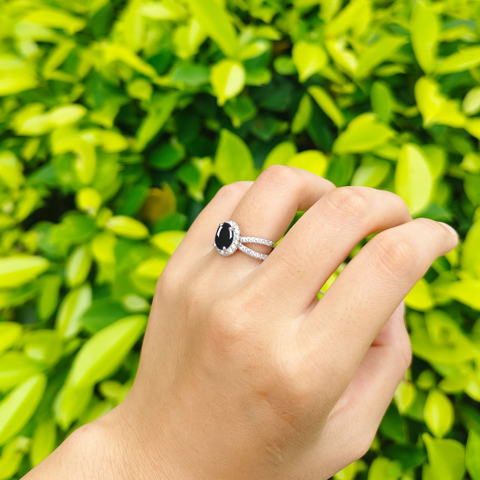 Oval Natural Black Onyx Halo Split Shank Ring 925 Sterling Silver