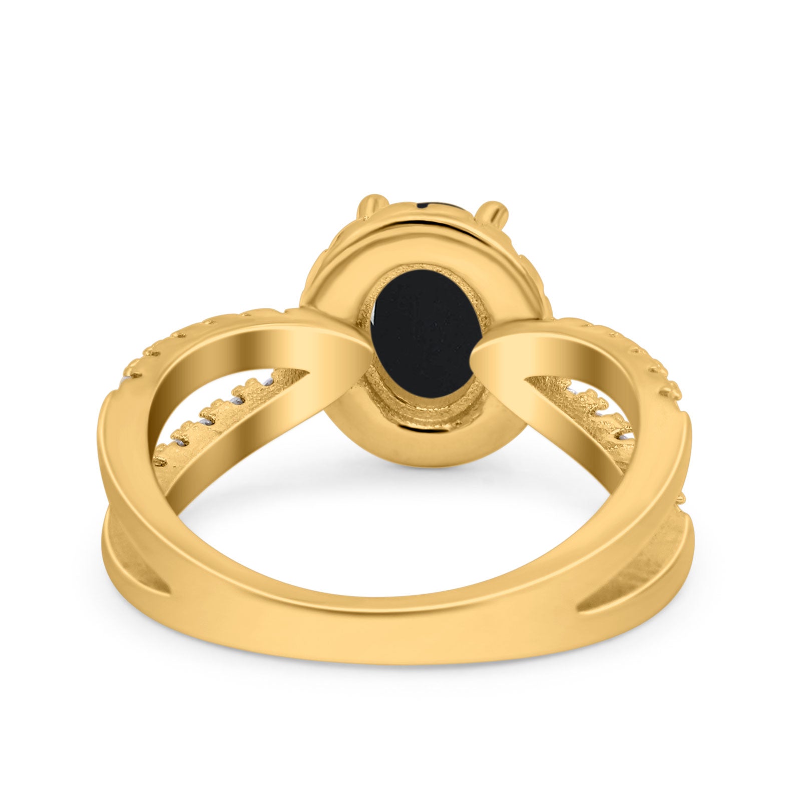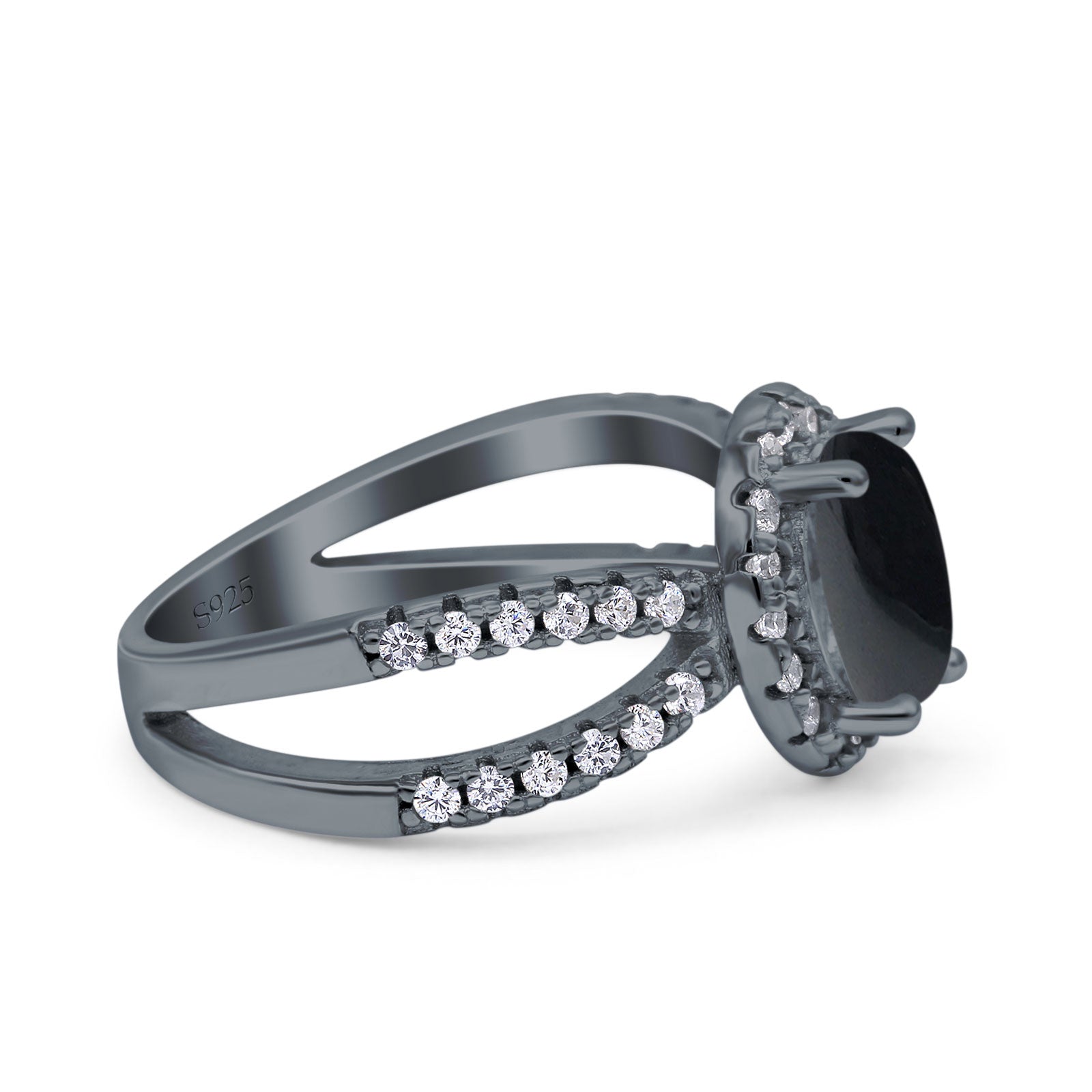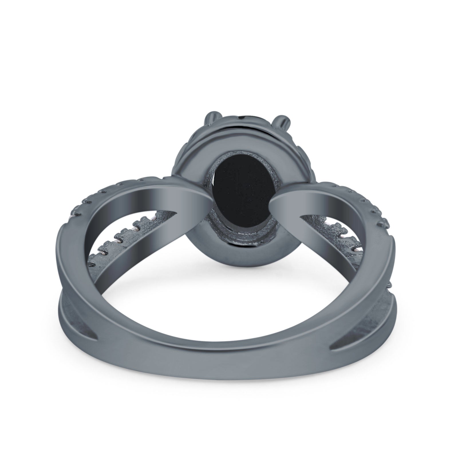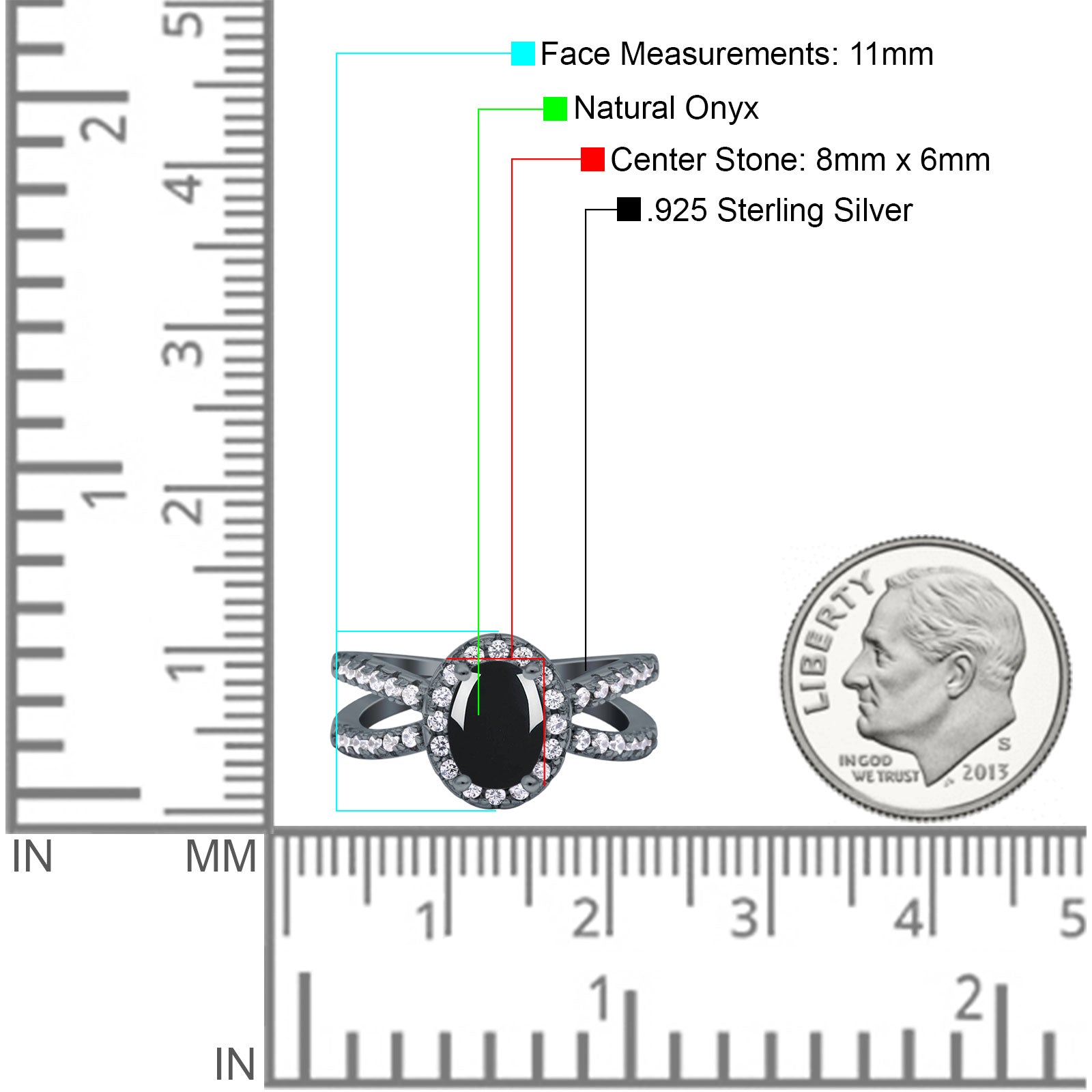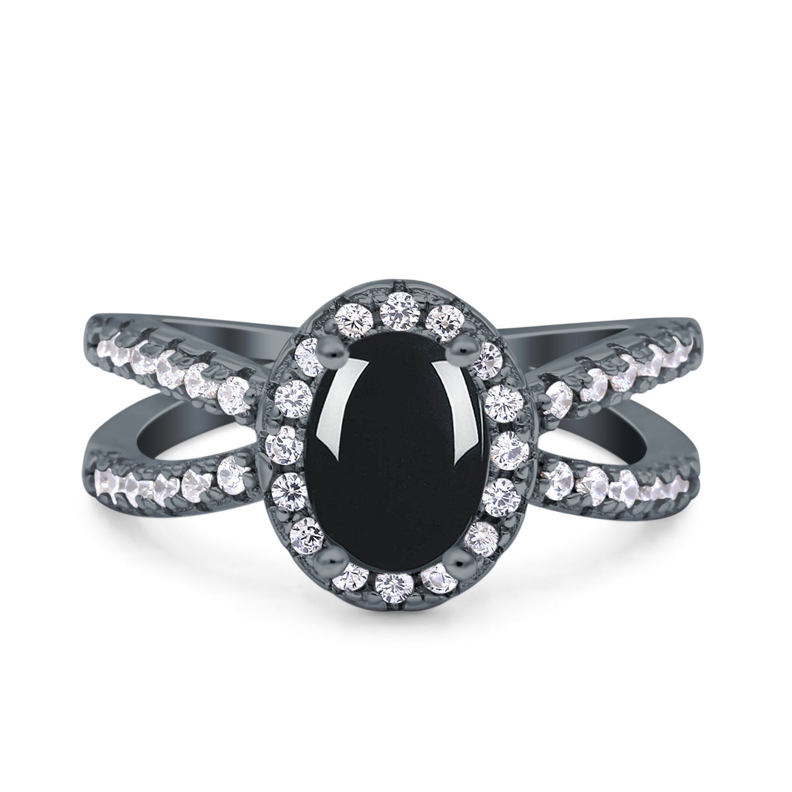 Oval Natural Black Onyx Halo Split Shank Ring 925 Sterling Silver
