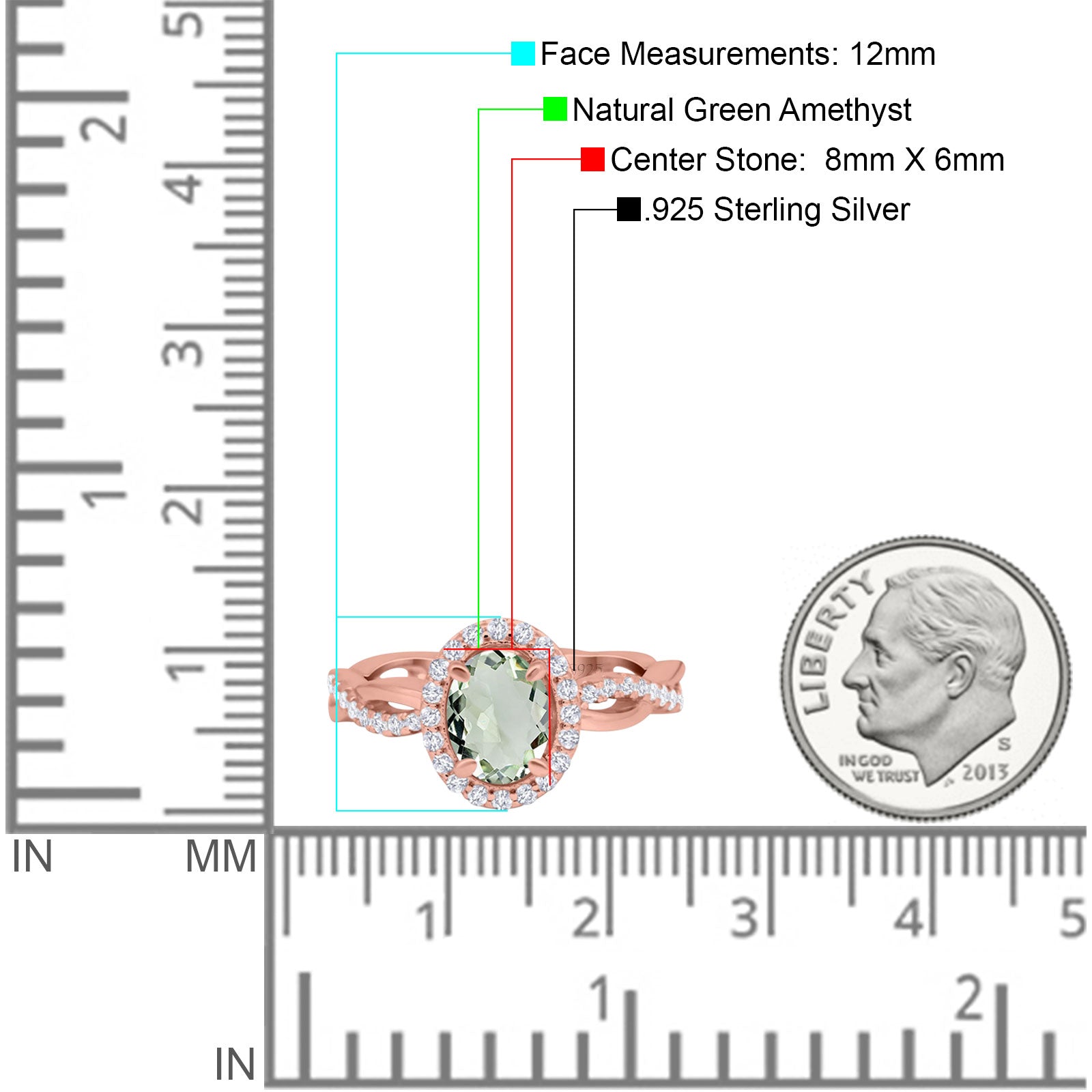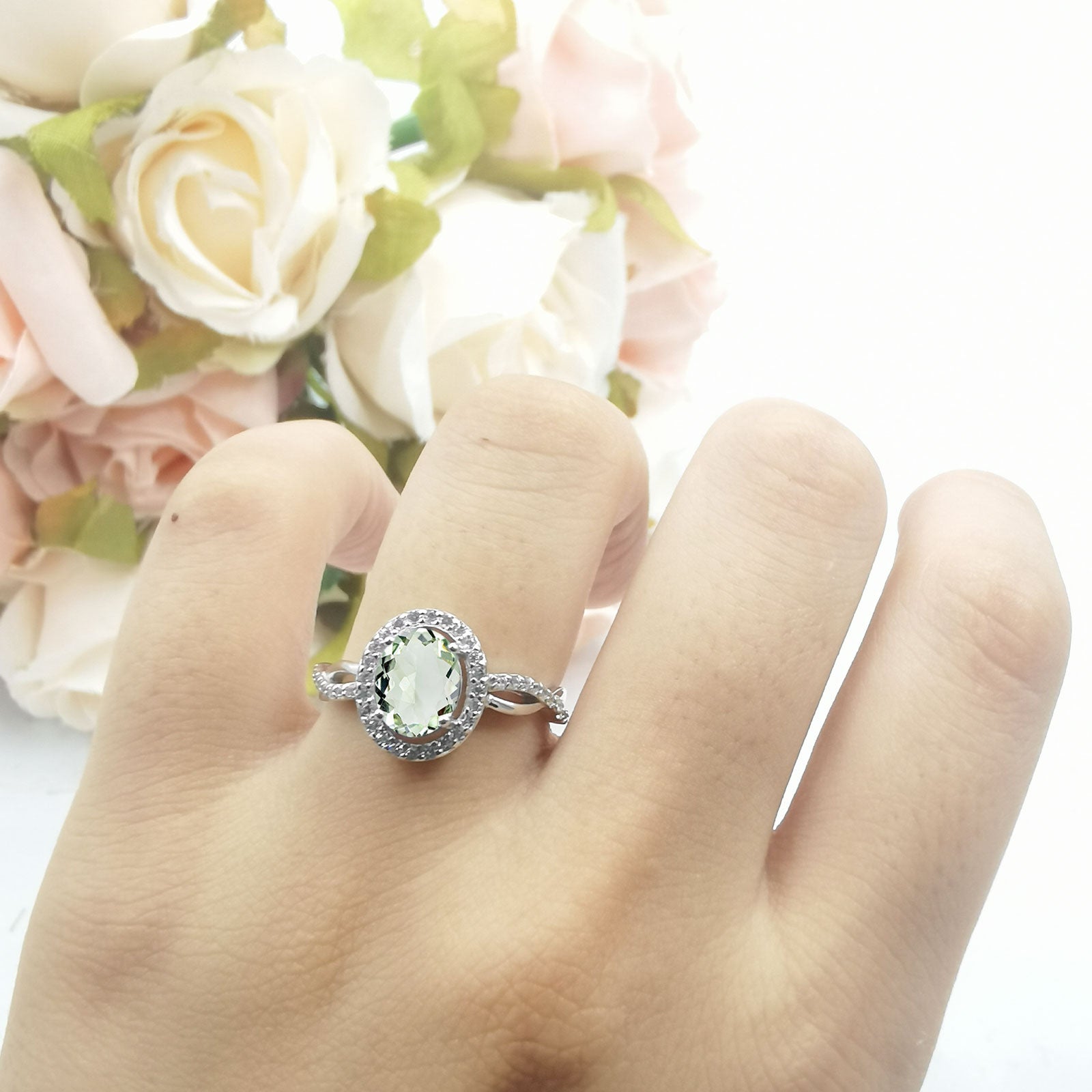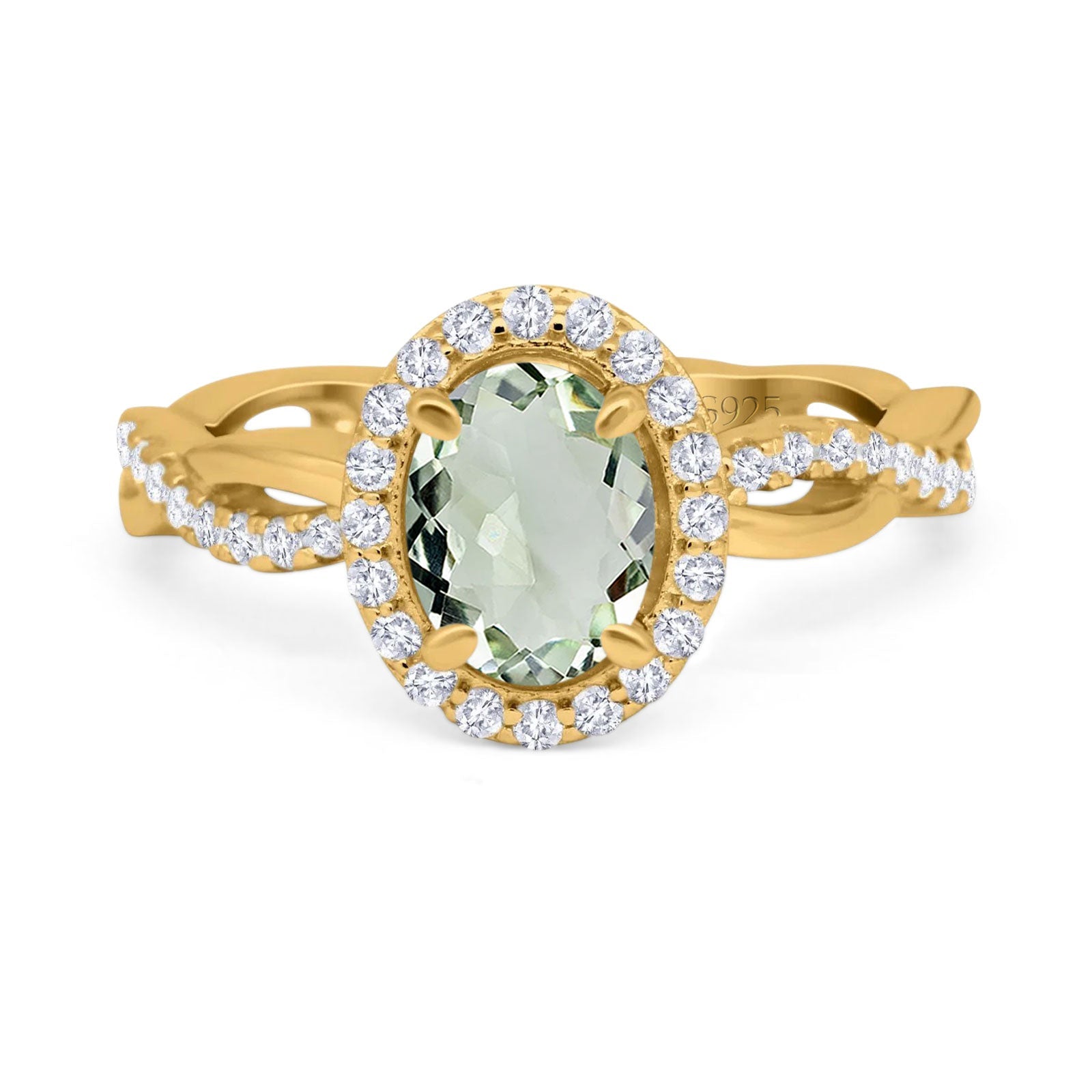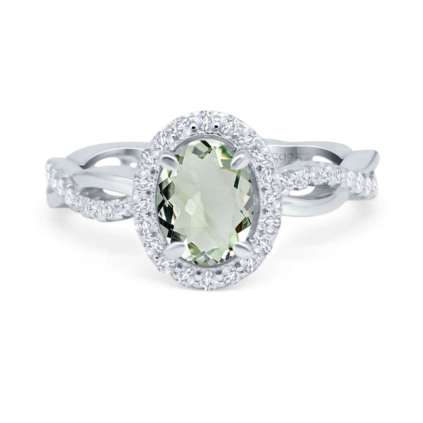 Oval Natural Green Amethyst Prasiolite Halo CZ Split Shank Twisted Ring 925 Sterling Silver