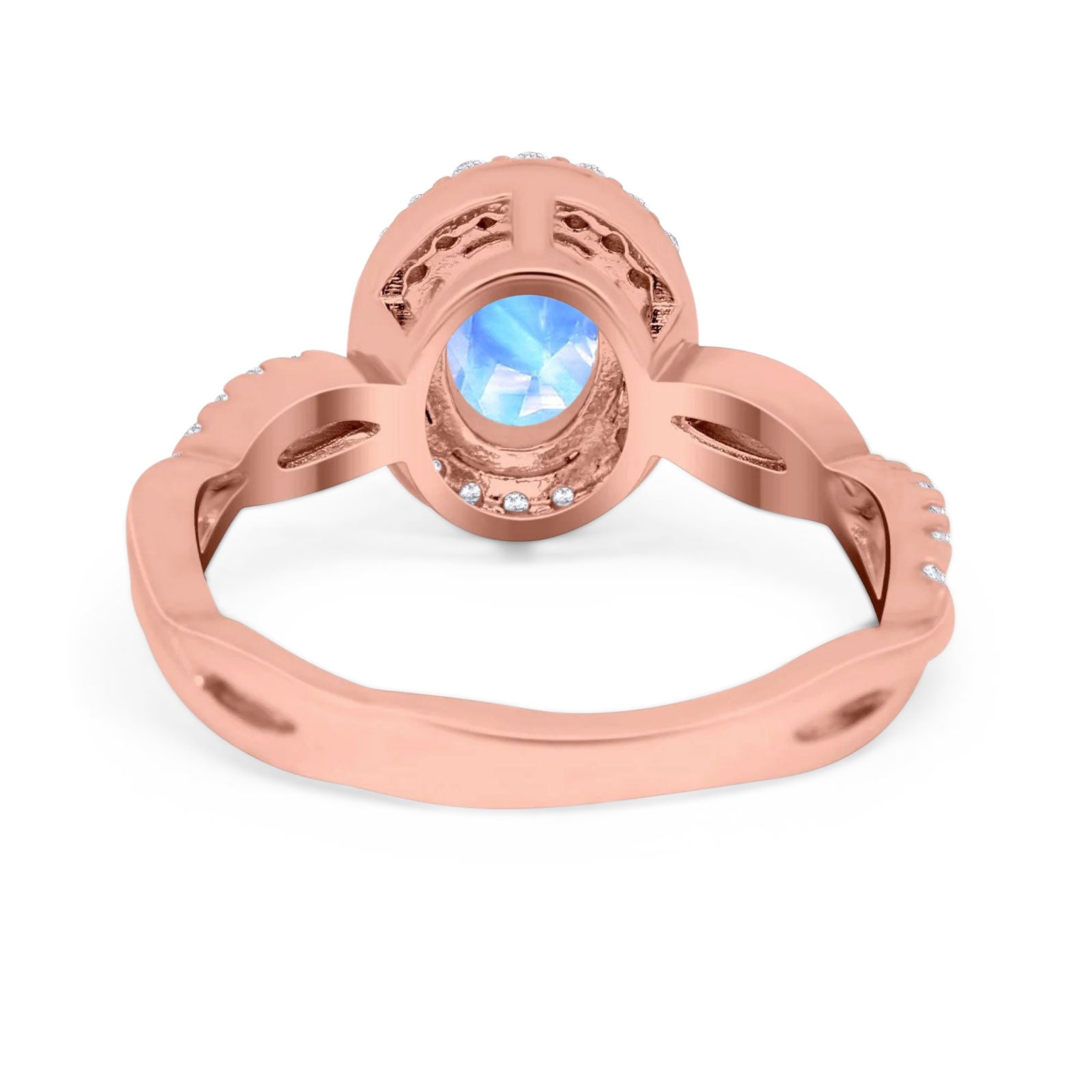 Oval Natural Moonstone Halo CZ Split Shank Twisted Ring 925 Sterling Silver