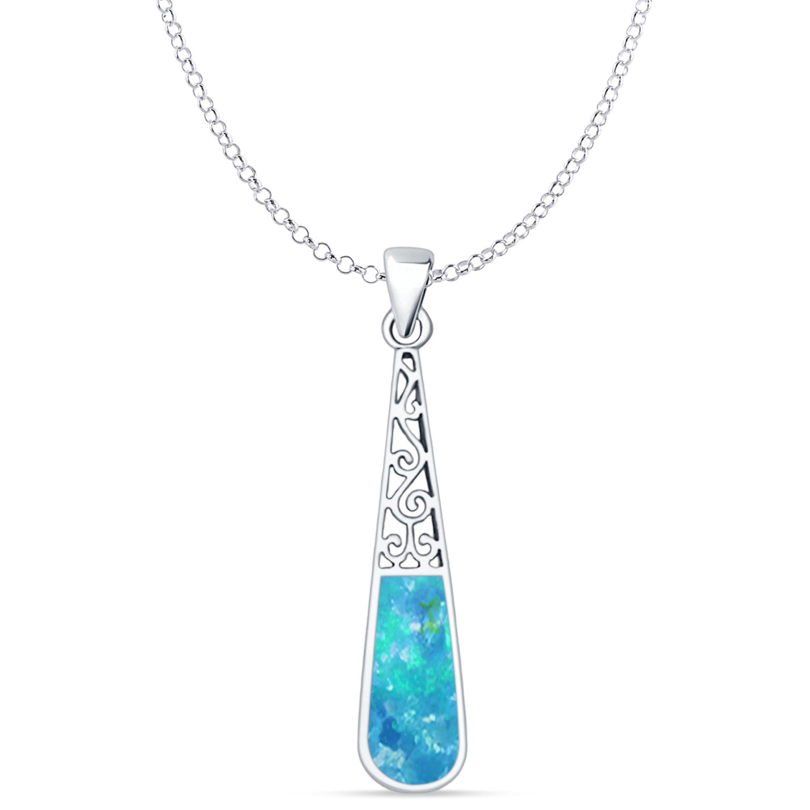 Pear Lab Created Blue Opal Filigree Pendant Oxidized Rolo Chain Necklace 925 Sterling Silver