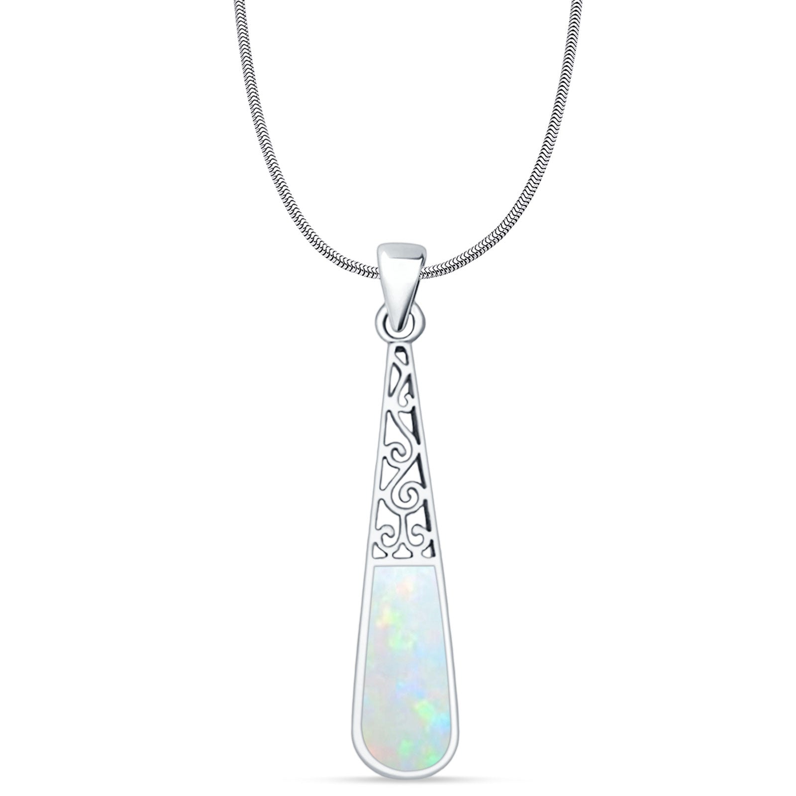 Pear Lab Created White Opal Filigree Pendant Oxidized Snake Chain Necklace 925 Sterling Silver