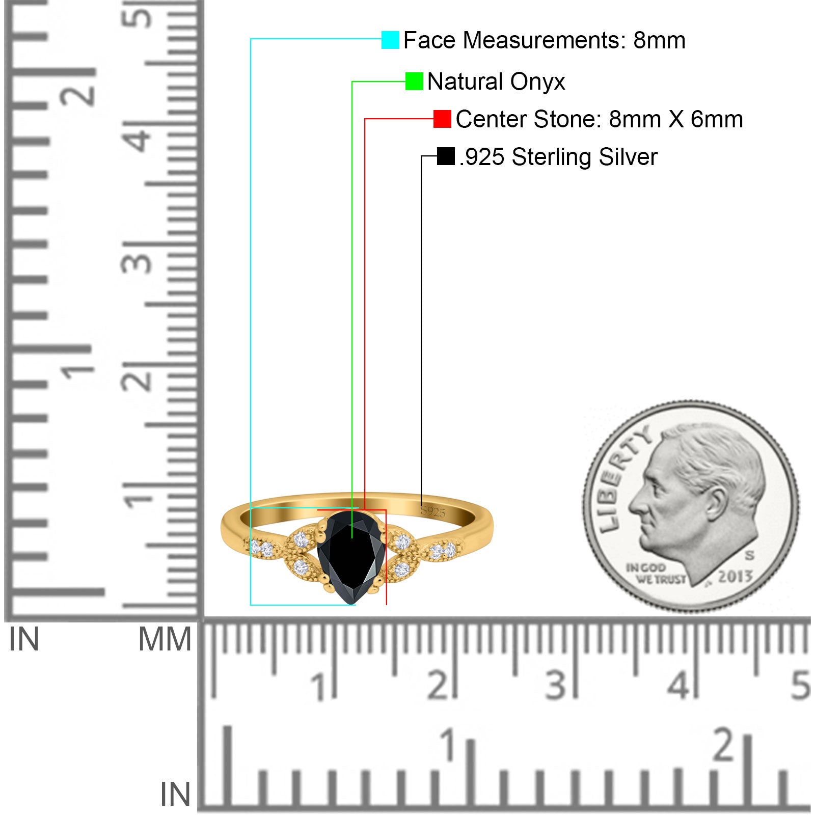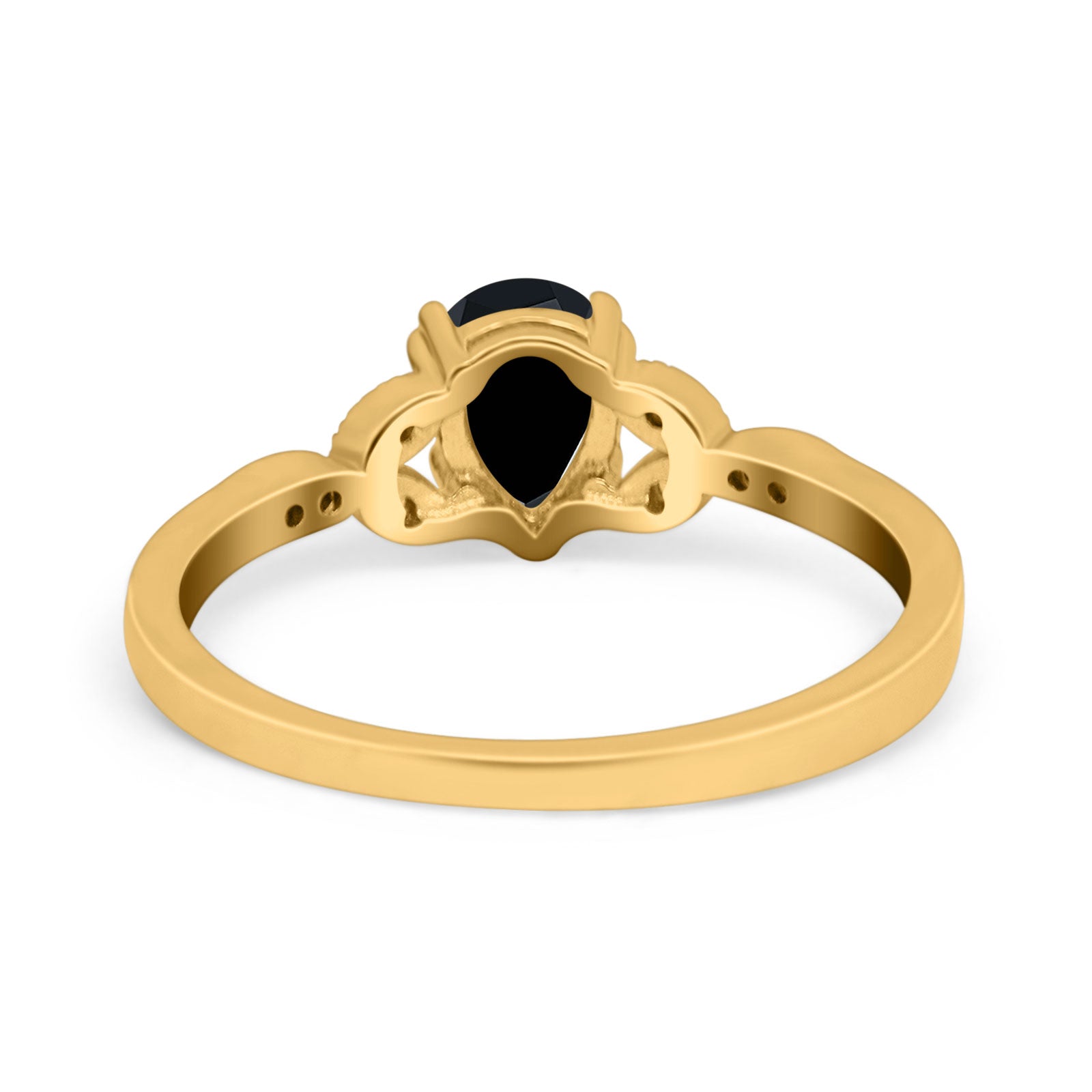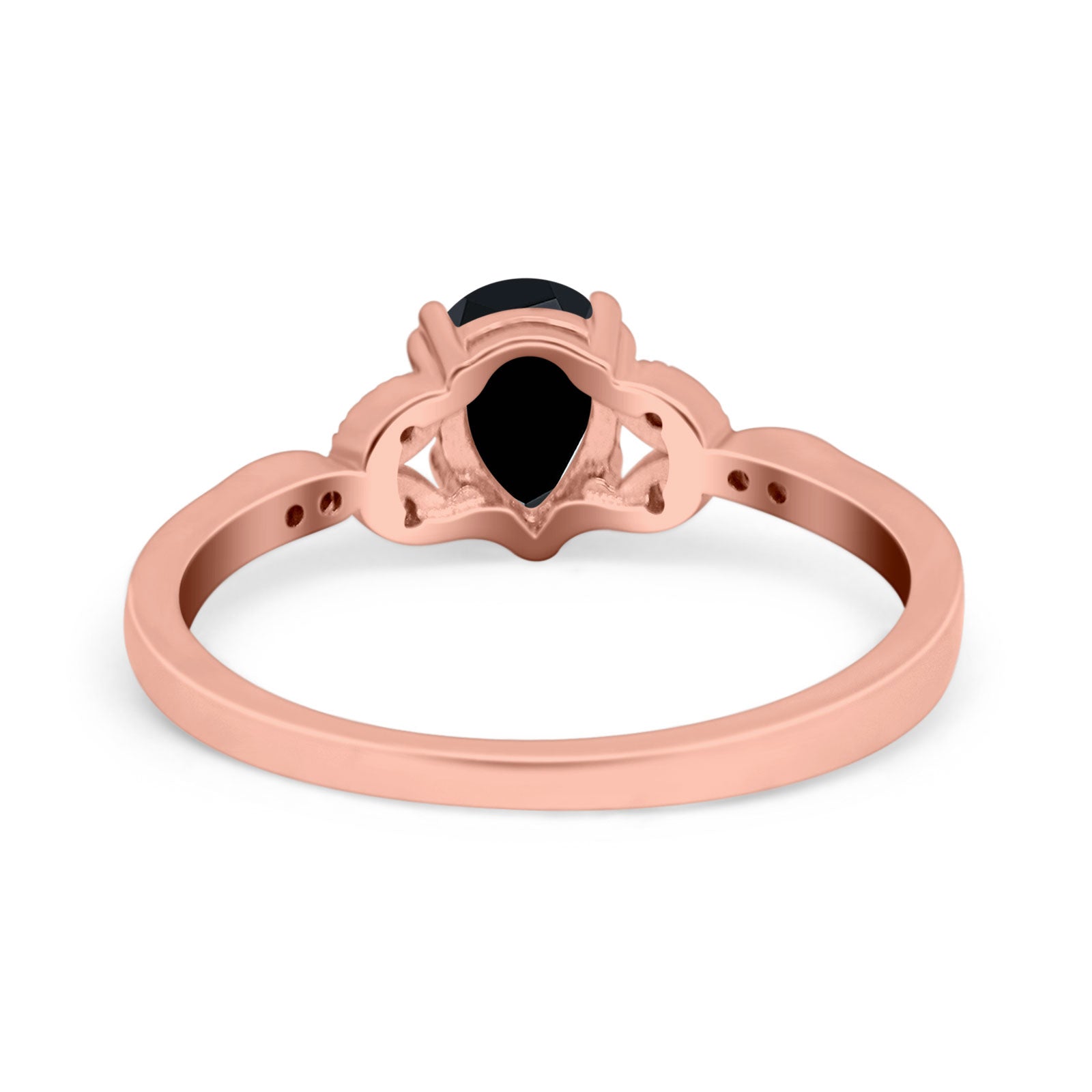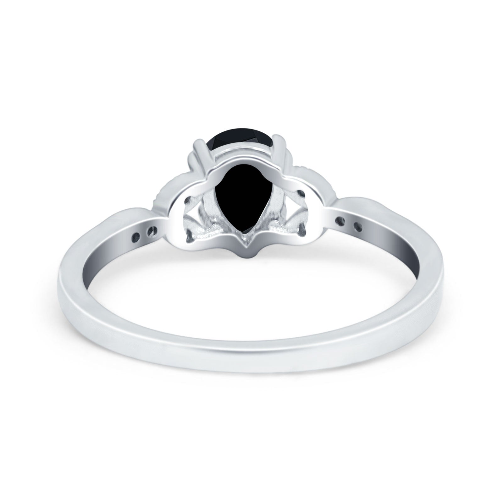 Pear Teardrop Natural Black Onyx Floral Leaf Style Ring 925 Sterling Silver