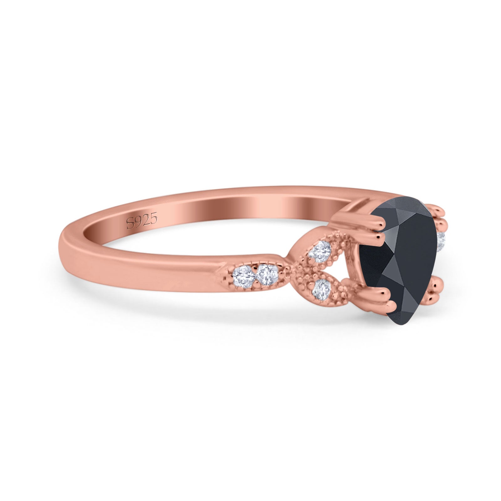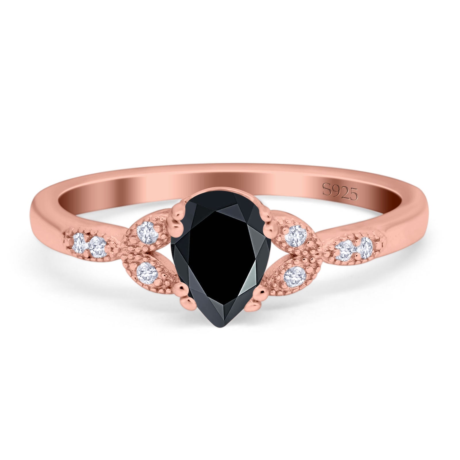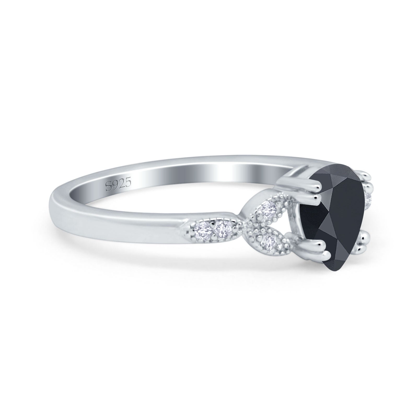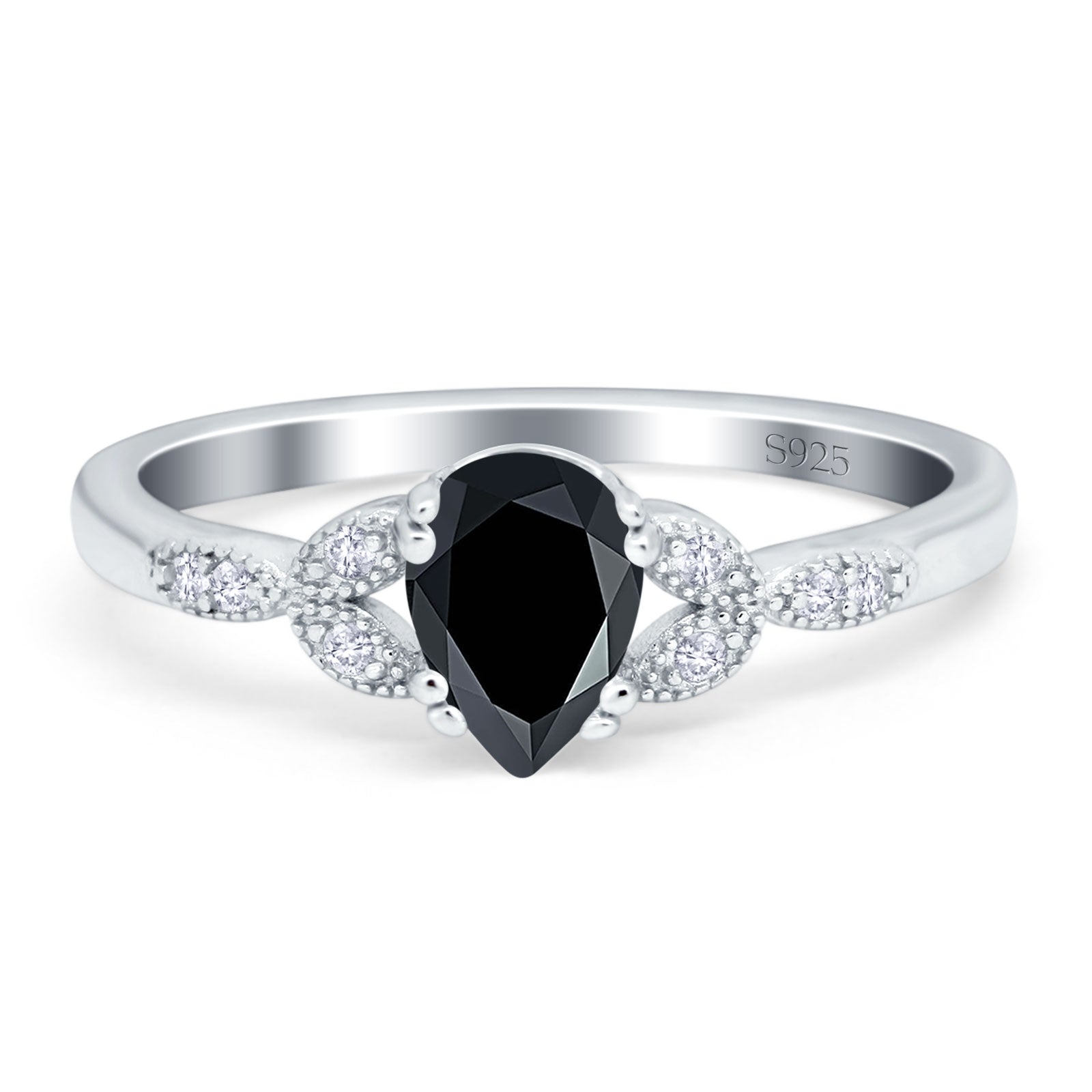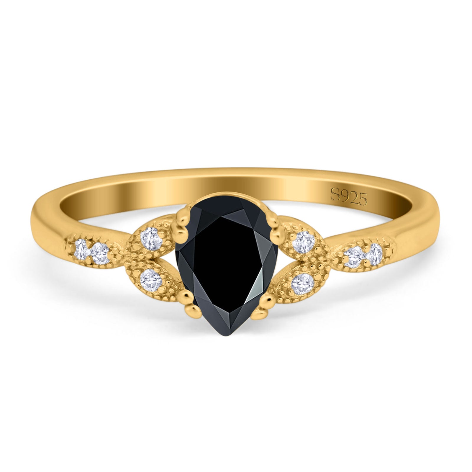 Pear Teardrop Natural Black Onyx Floral Leaf Style Ring 925 Sterling Silver