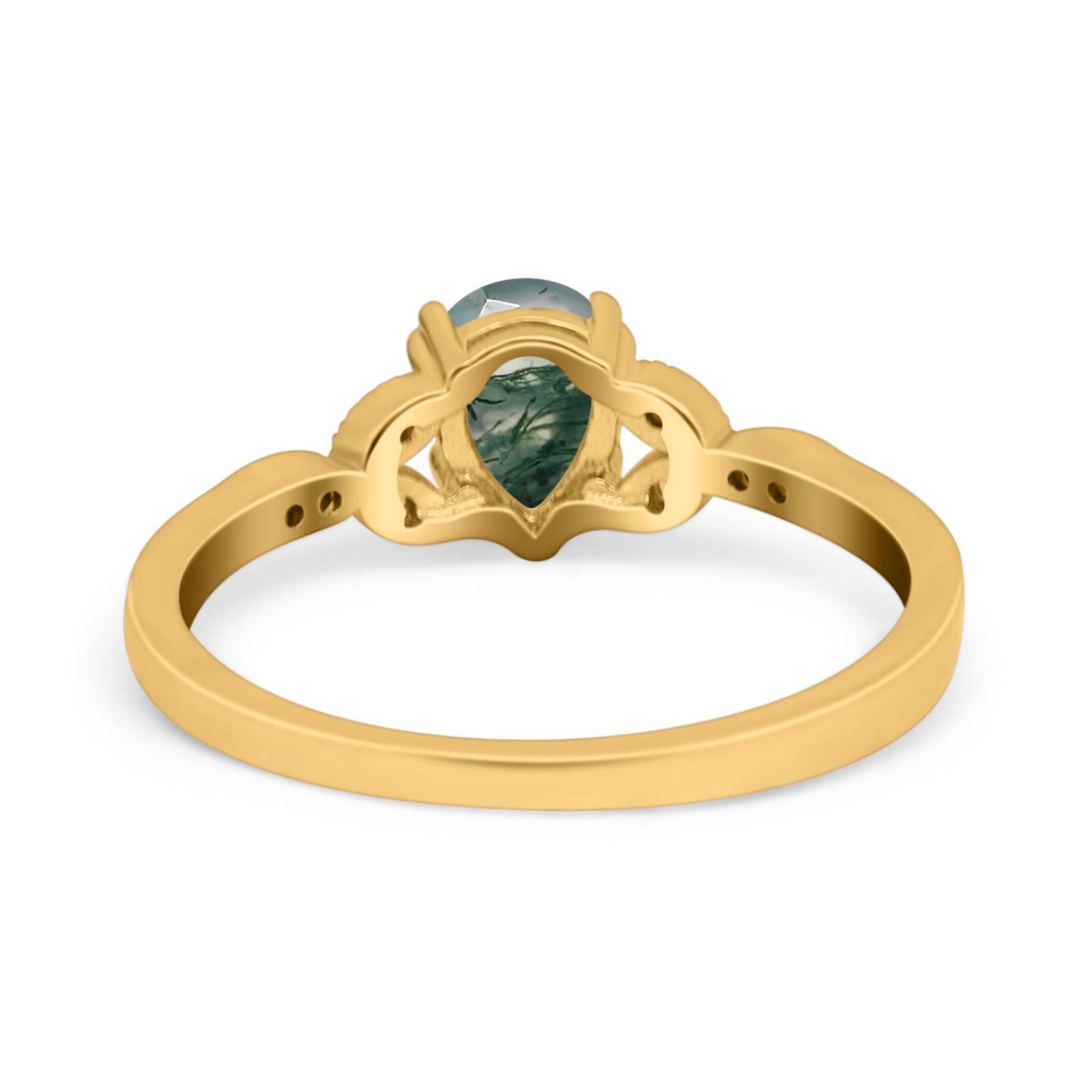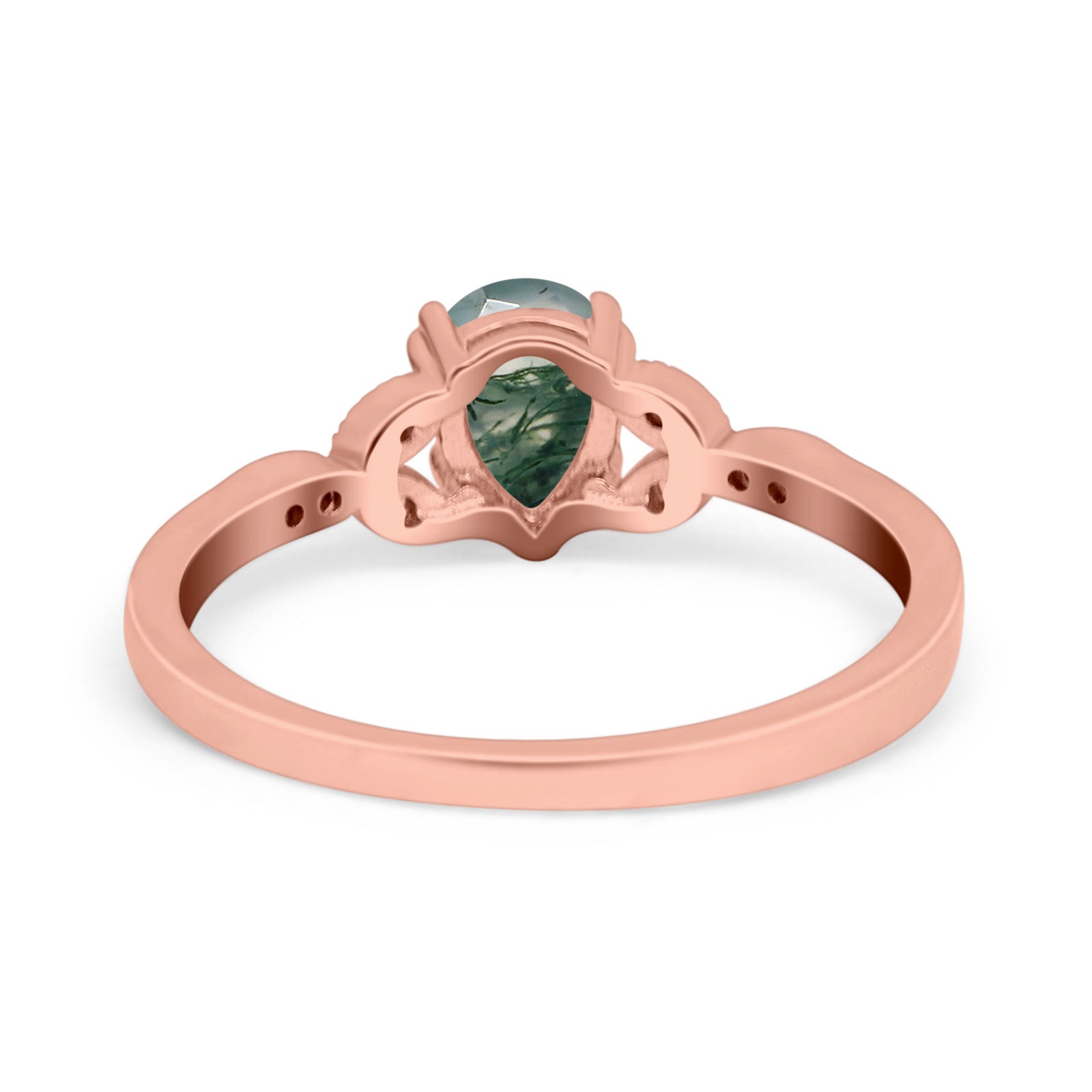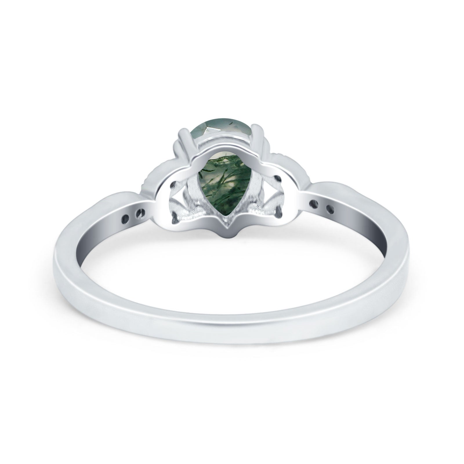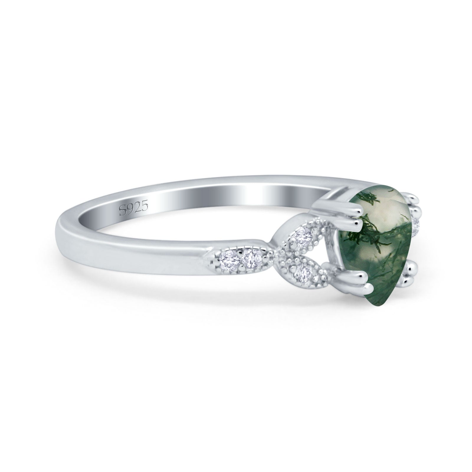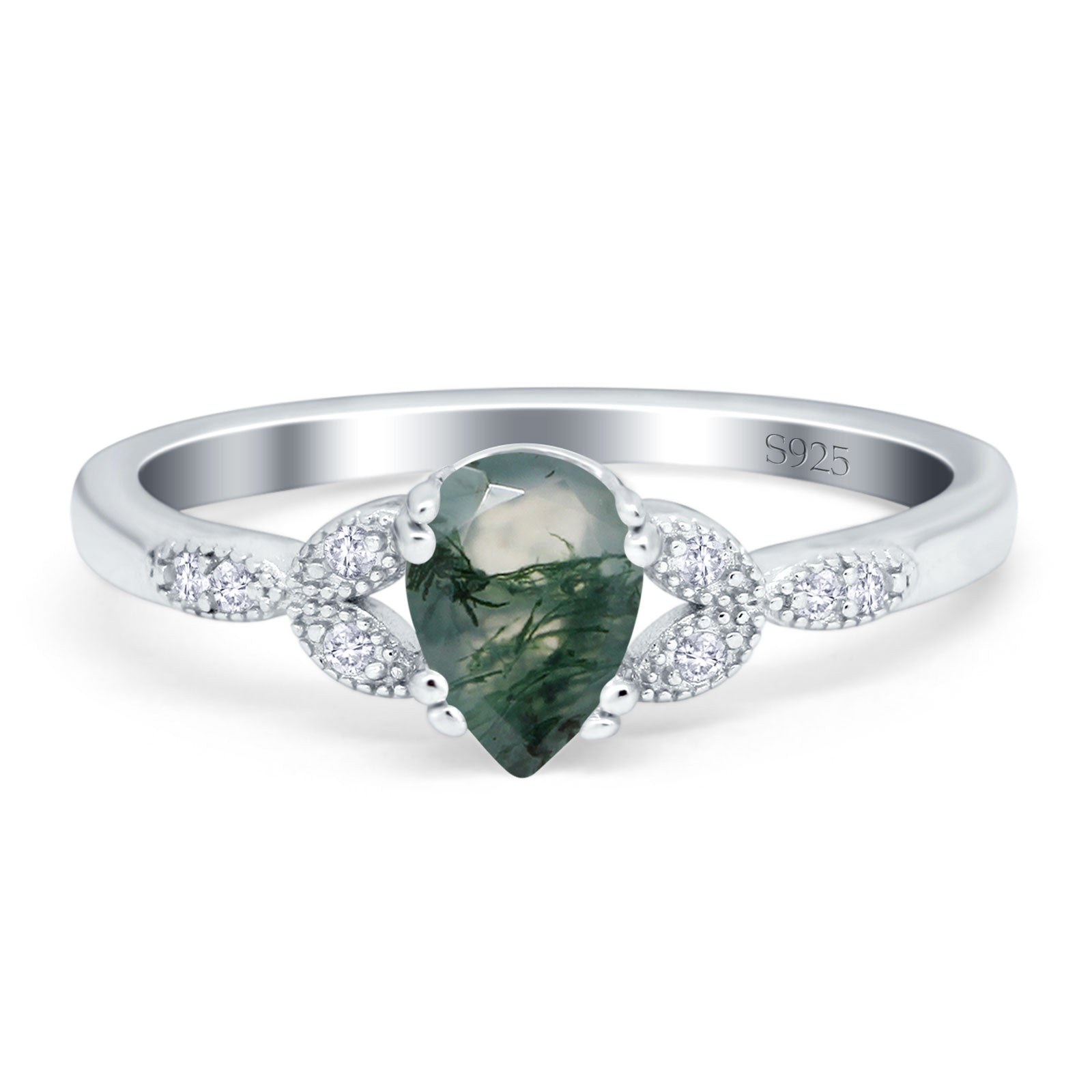 Pear Teardrop Natural Green Moss Agate Floral Leaf Style Ring 925 Sterling Silver