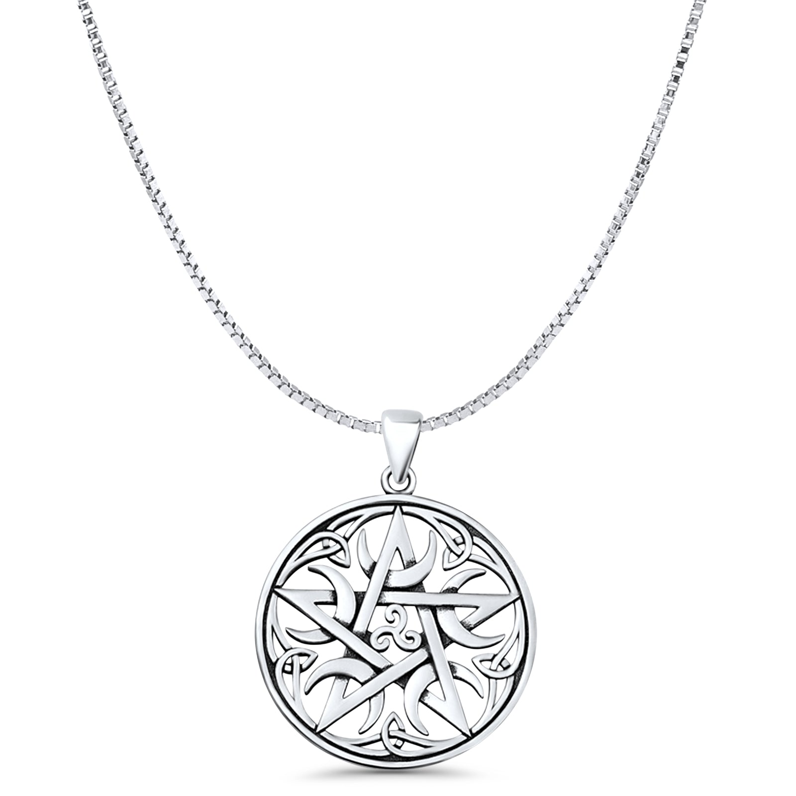 Pentagram, Moon & Triskelion Pendant Box Chain Necklace Oxidized 925 Sterling Silver