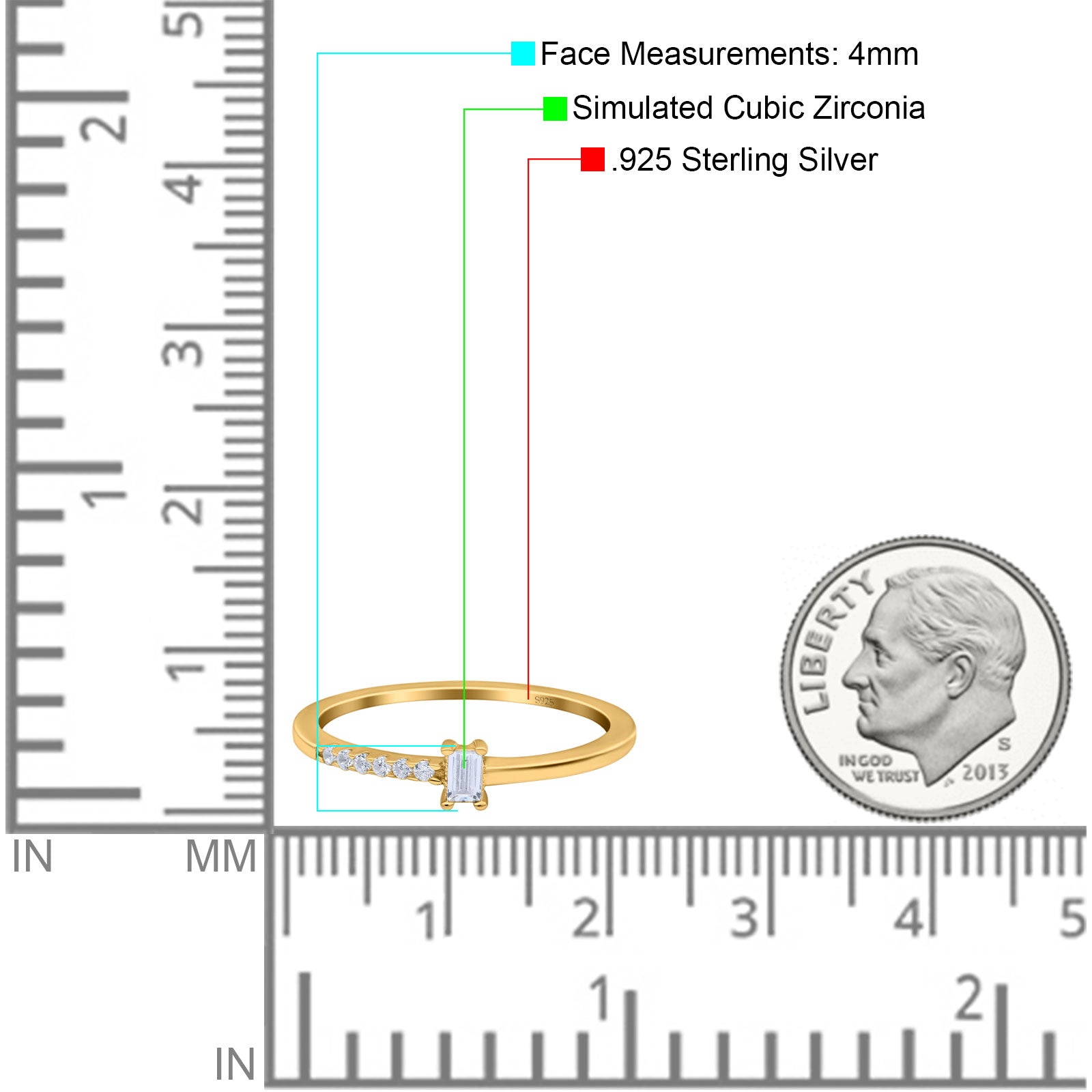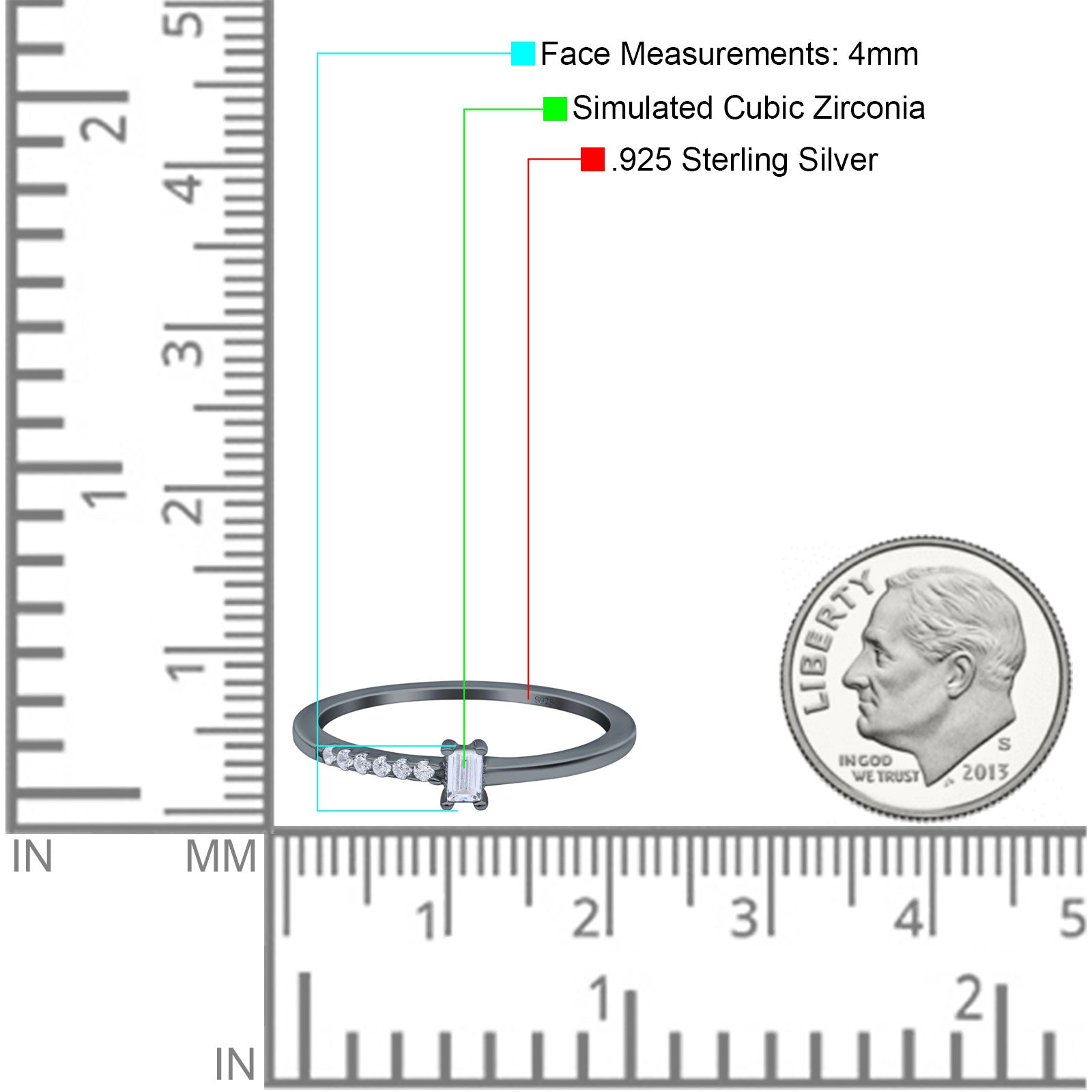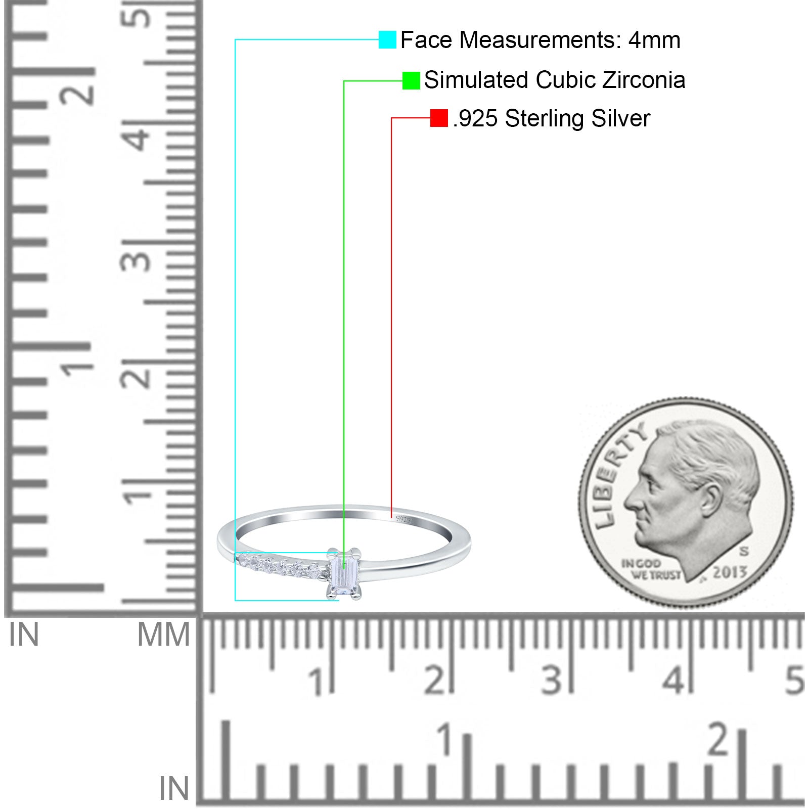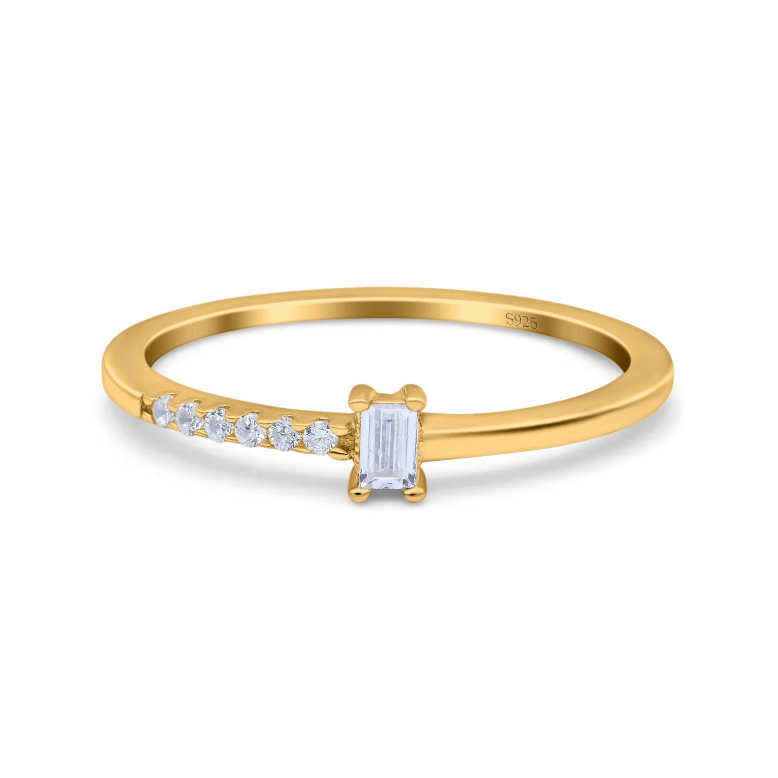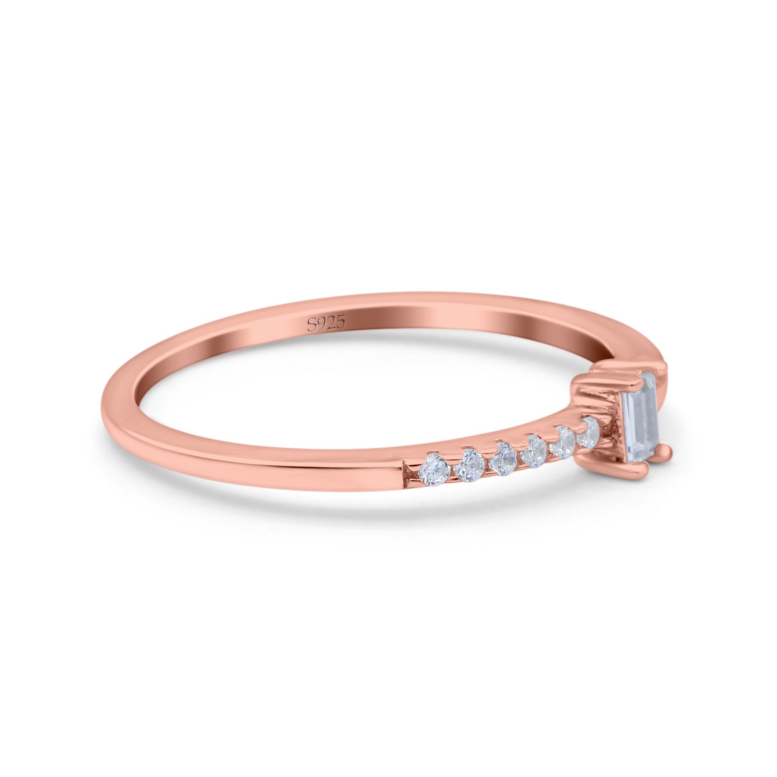 Petite Dainty Emerald Cut Wedding Engagement Ring Band Round Simulated Cubic Zirconia 925 Sterling Silver (4mm)