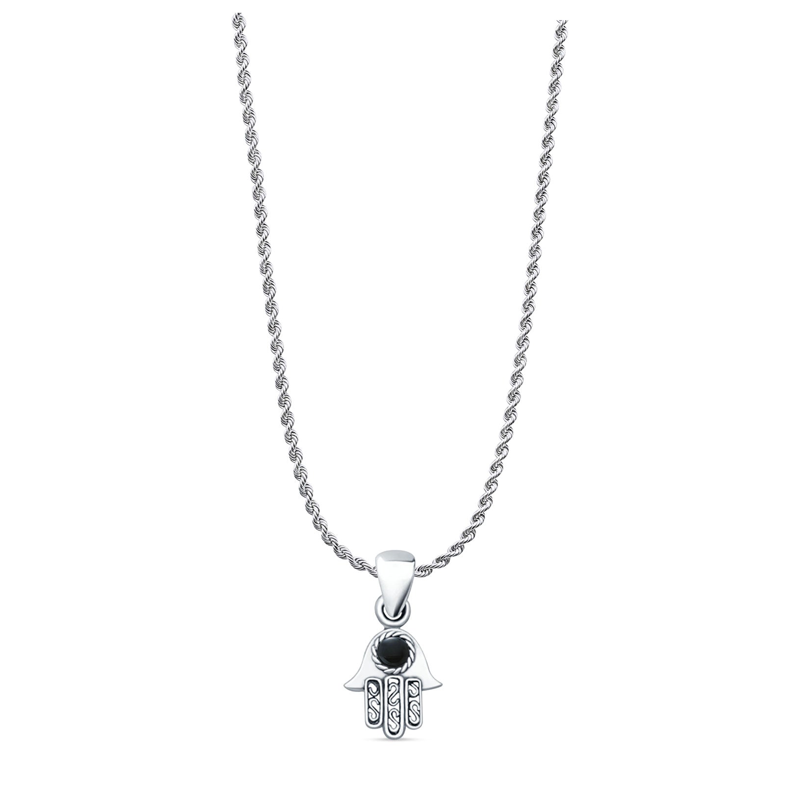 Round Black Onyx Hand Of Hamsa Pendant Rope Chain Necklace 925 Sterling Silver