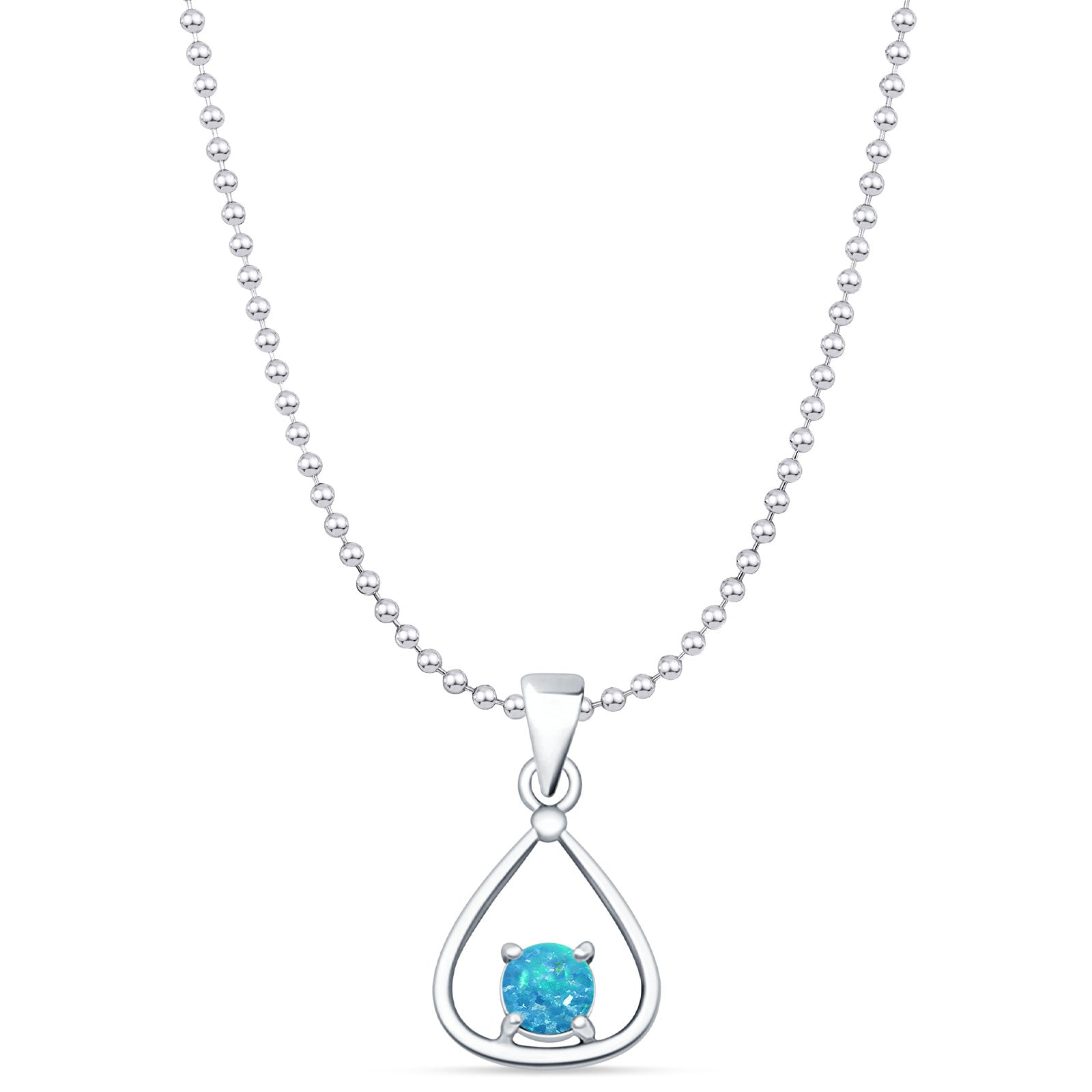 Round Lab Created Blue Opal Oxidized Teardrop Pendant Bead Chain Necklace 925 Sterling Silver